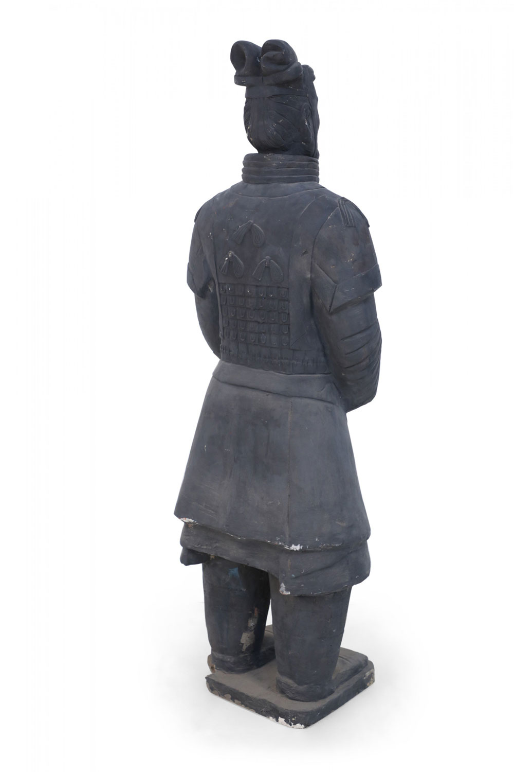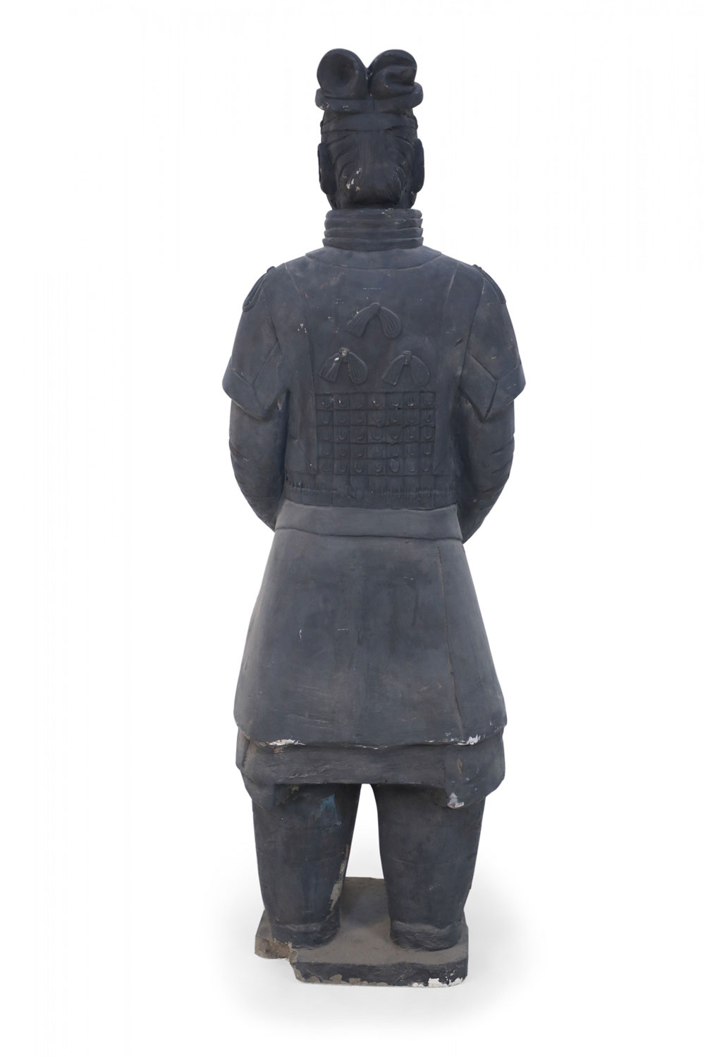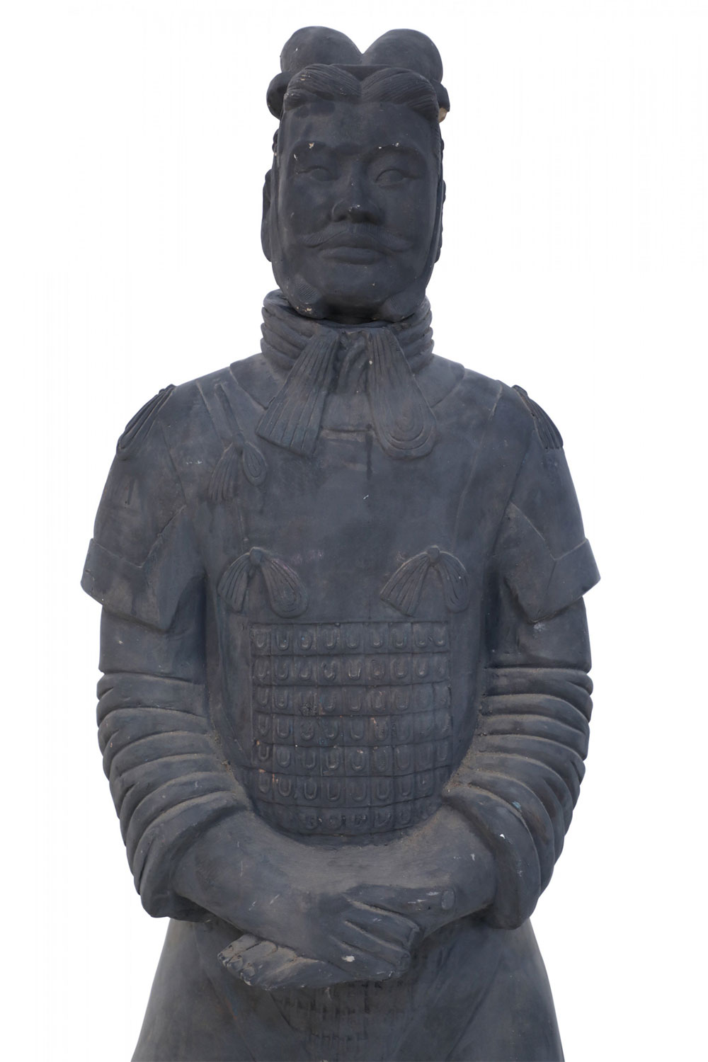 Chinese Qin Dynasty-style (20th Century) life-size terracotta soldier statue standing with hands clasped on a rectangular base. (Head is removable)(Companion piece: NWL2501).