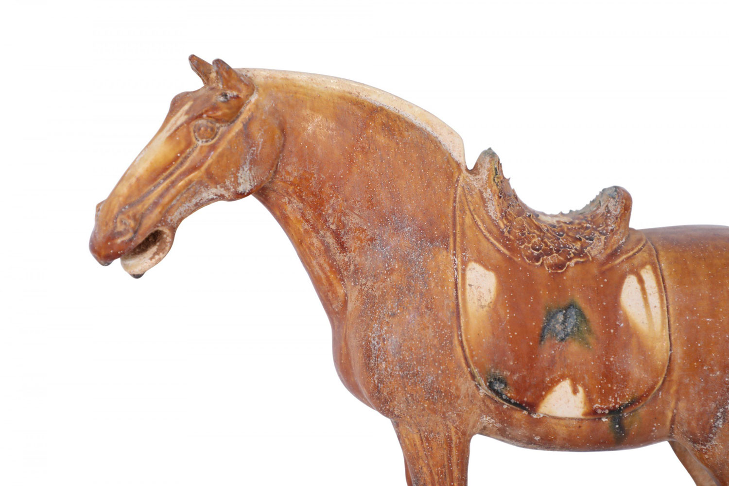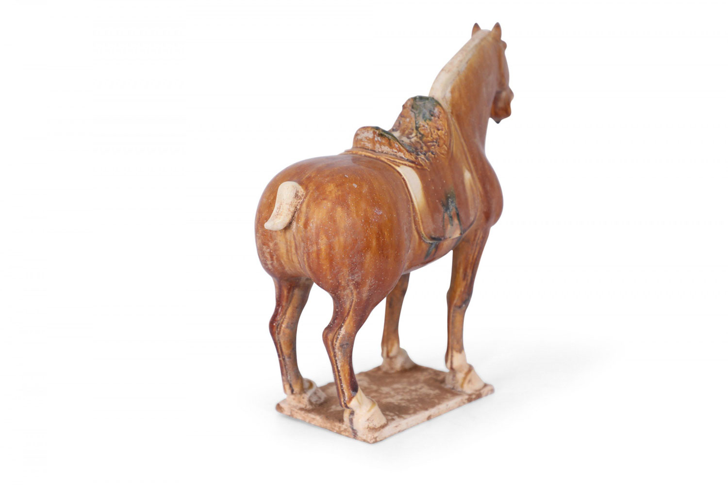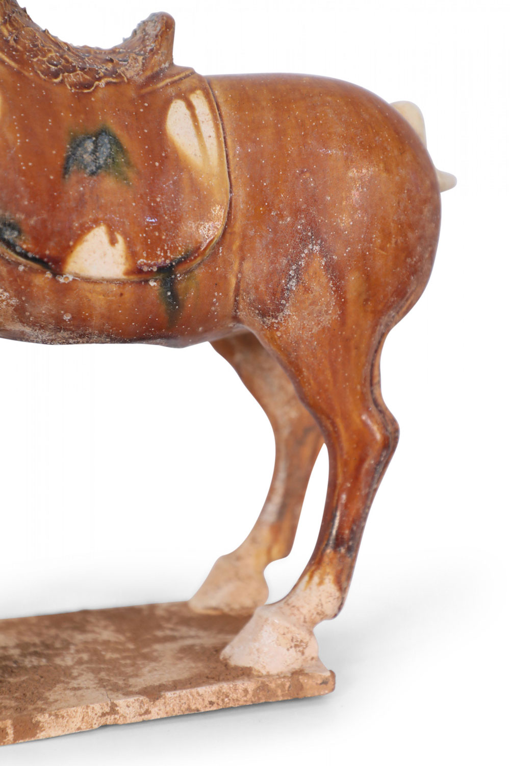 Antique Chinese Tang Dynasty-style terra cotta figure of a horse commonly used as a tomb figure for wealthy burials in the 7-8th centuries, and crafted with its traditional tri-color glaze, or Sancai, utilizing brown, green and off-white.