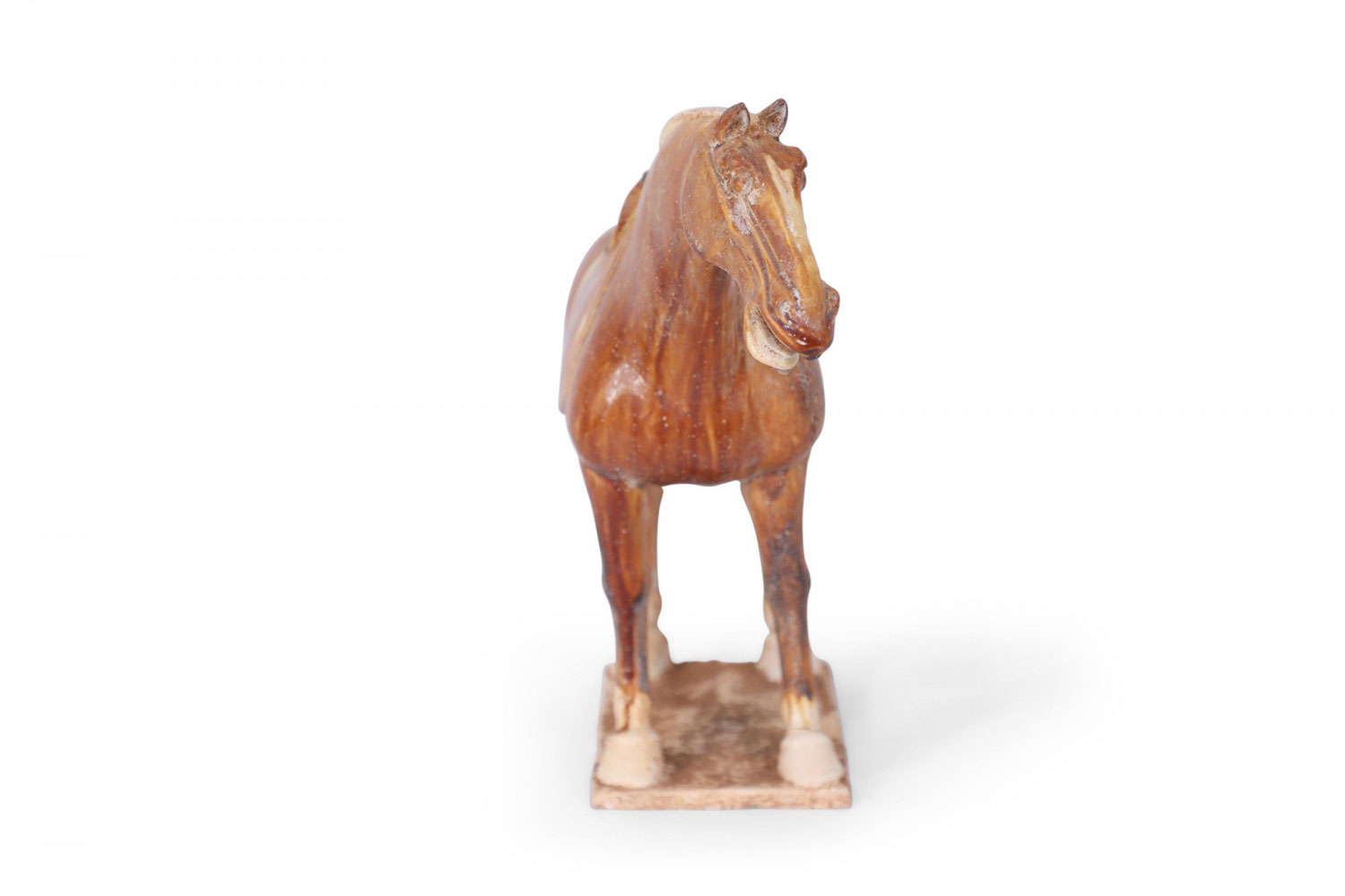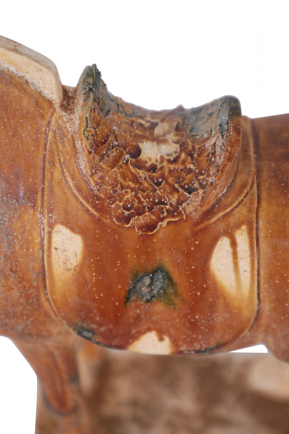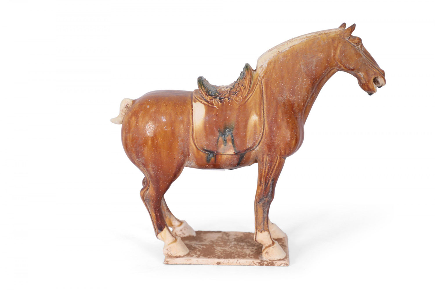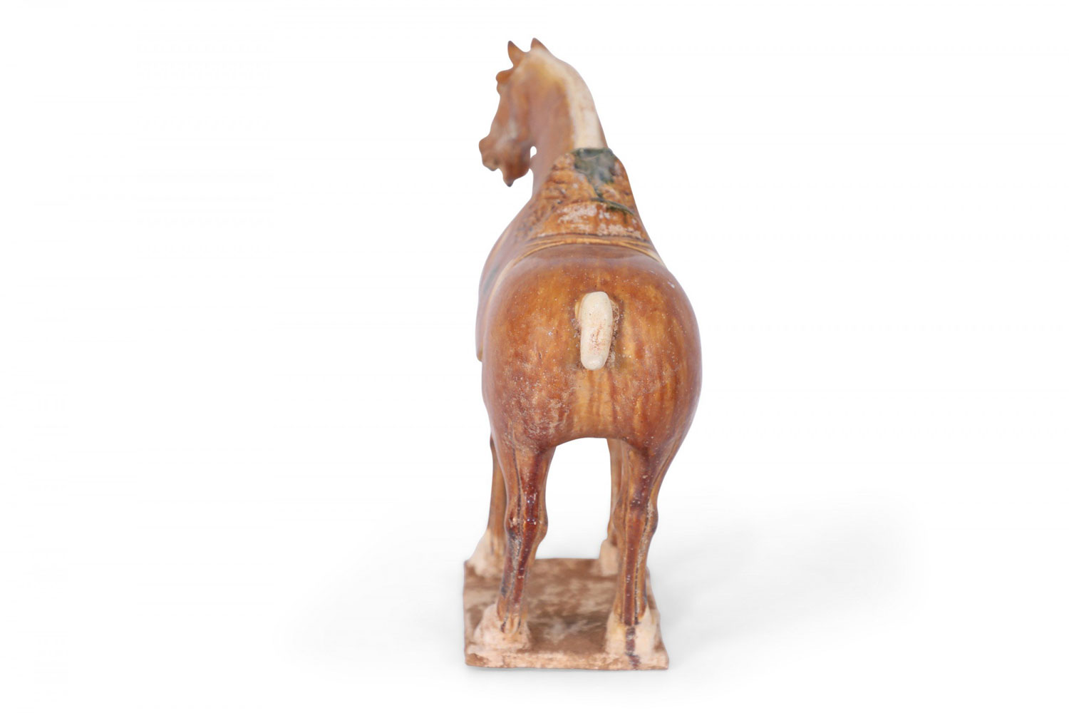 Antique Chinese Tang Dynasty-style terra cotta figure of a horse commonly used as a tomb figure for wealthy burials in the 7-8th centuries, and crafted with its traditional tri-color glaze, or Sancai, utilizing brown, green and off-white.