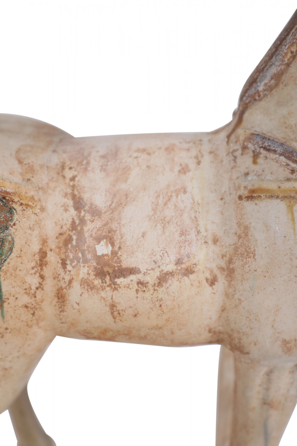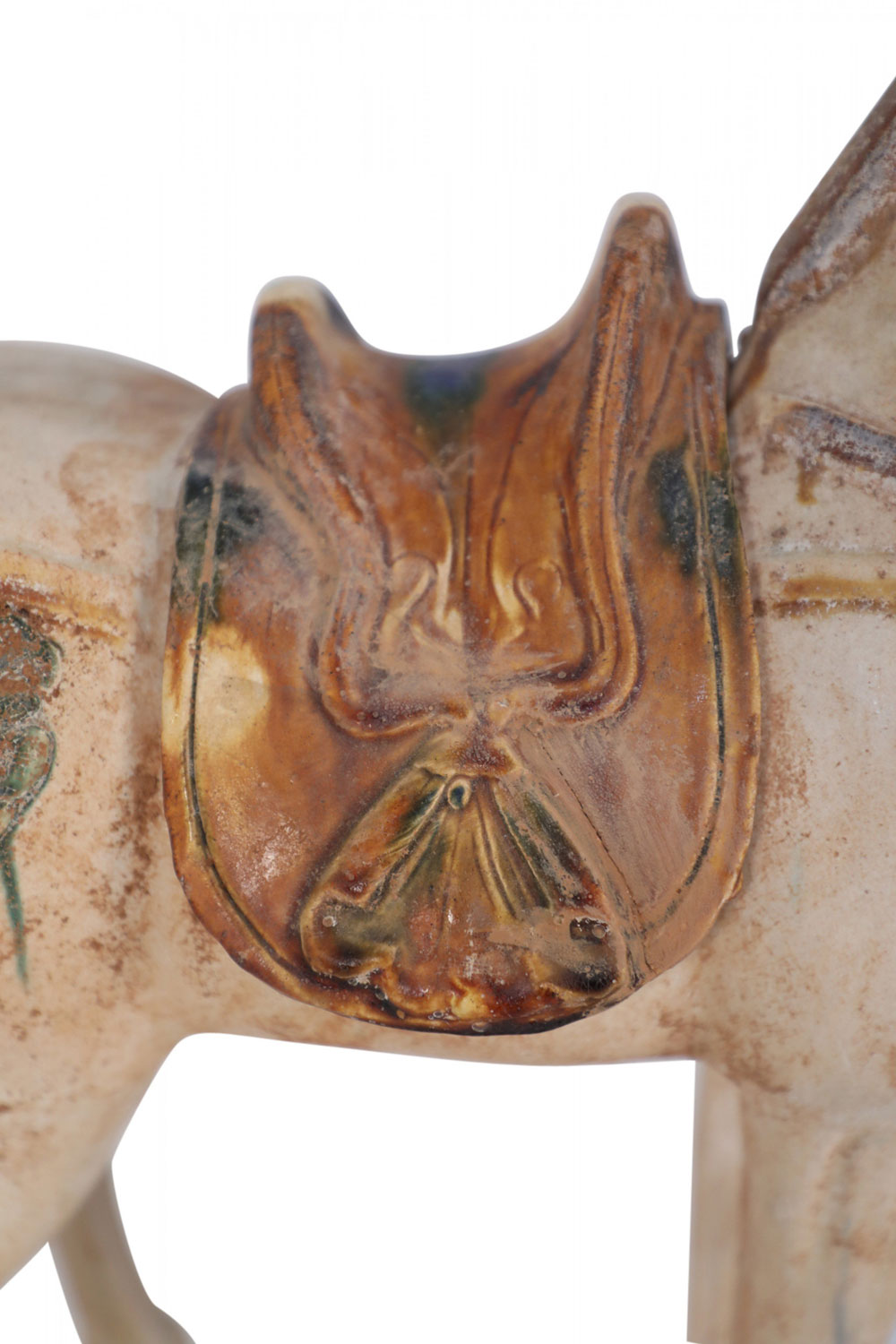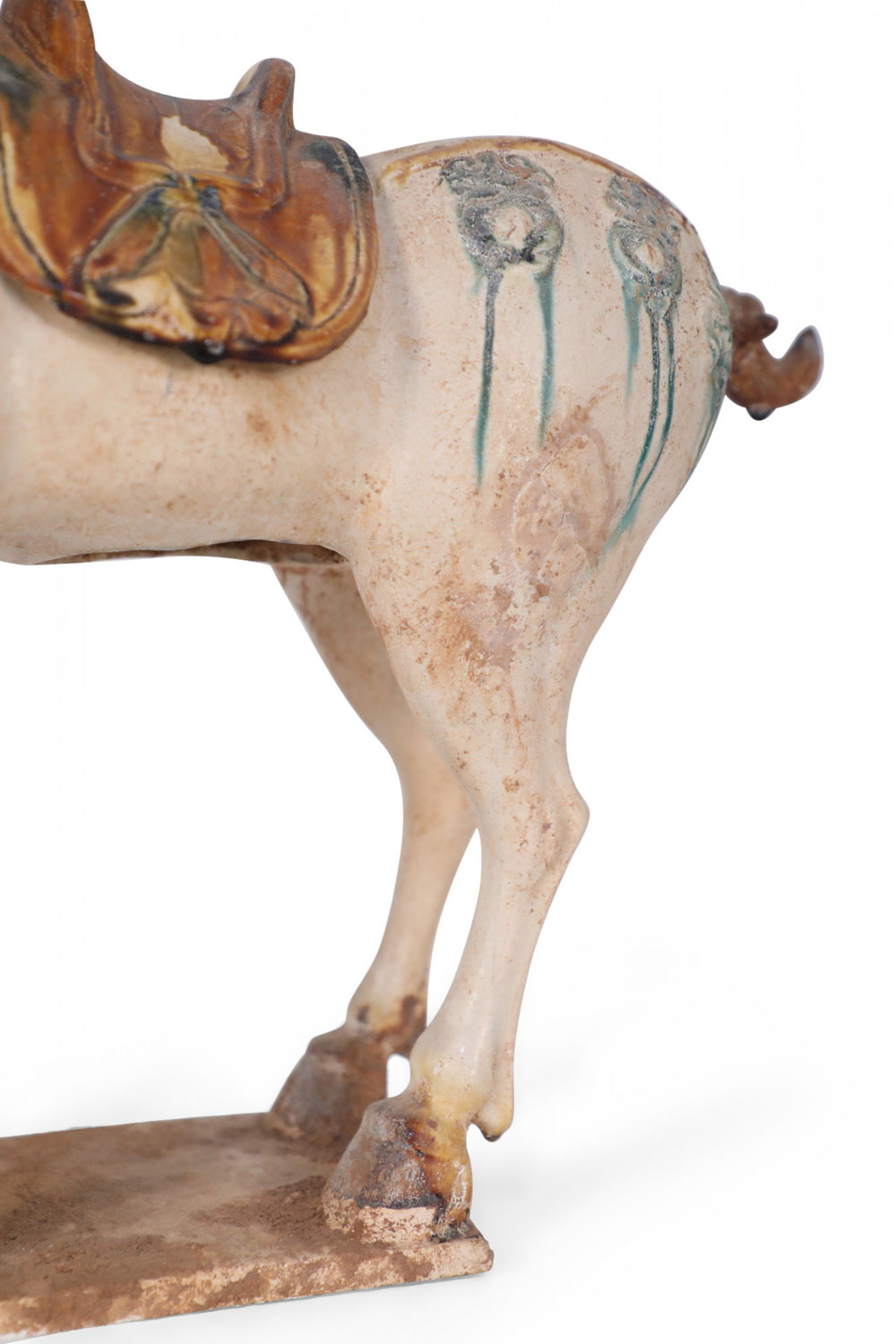 Antique Chinese Tang Dynasty-style terra cotta figure of a horse commonly used as a tomb figure for wealthy burials in the 7-8th centuries, crafted with traditional tri-color glaze, or Sancai, utilizing brown, green and off-white..