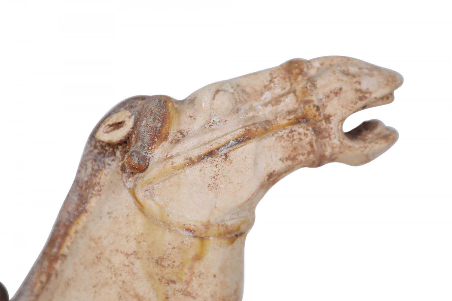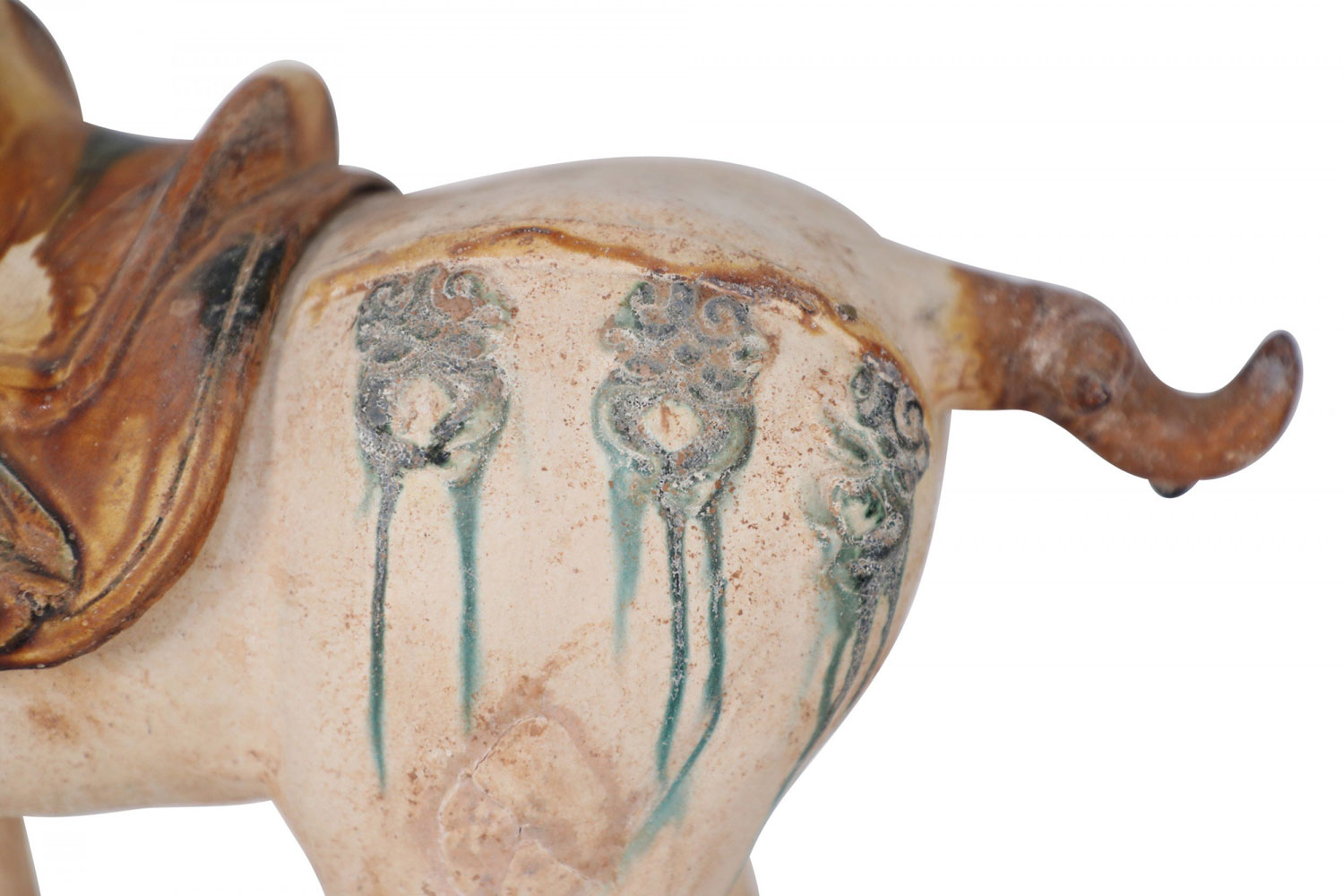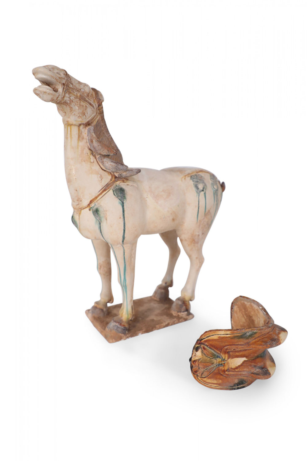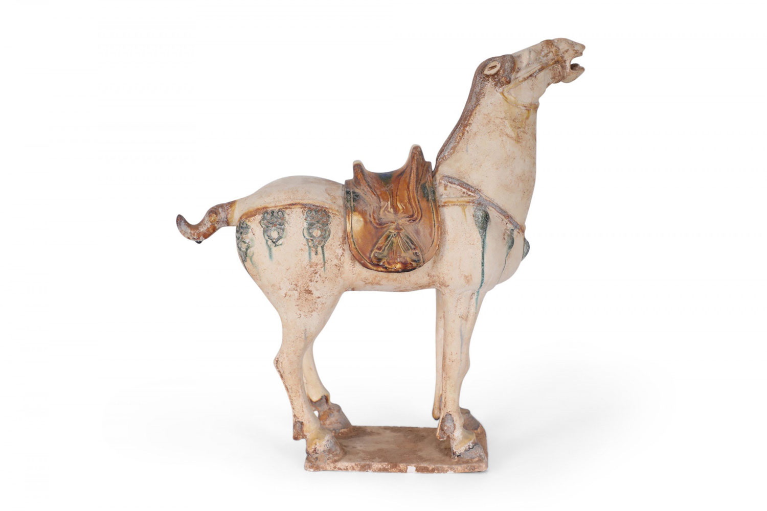 Antique Chinese Tang Dynasty-style terra cotta figure of a horse commonly used as a tomb figure for wealthy burials in the 7-8th centuries, crafted with traditional tri-color glaze, or Sancai, utilizing brown, green and off-white..