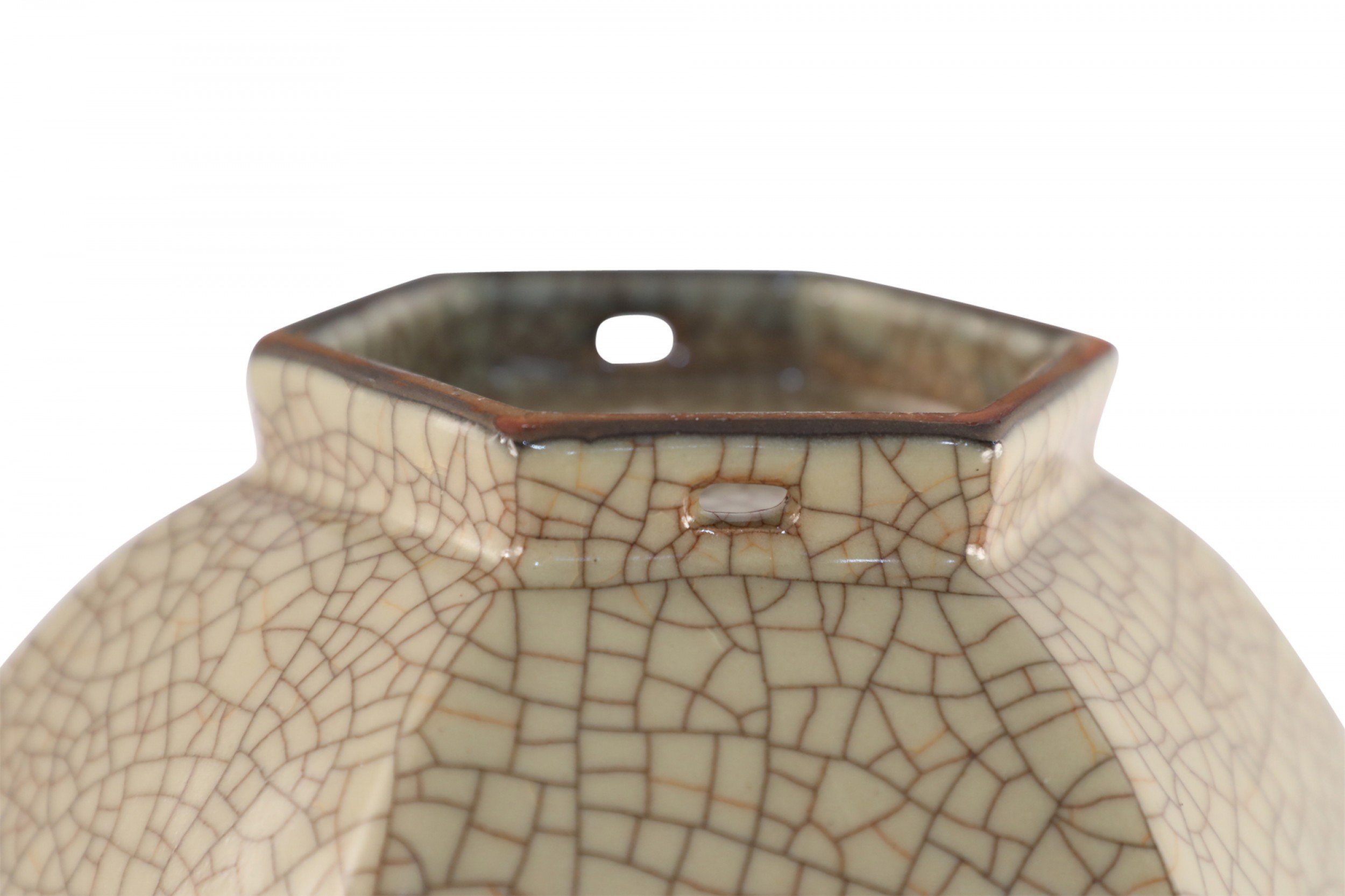 Chinese six-sided, beige, crackled porcelain vase, crafted in a style typical of the Song Dynasty's official kiln during the Southern Song period and accented in two lug ears along the neck.