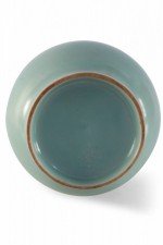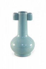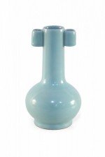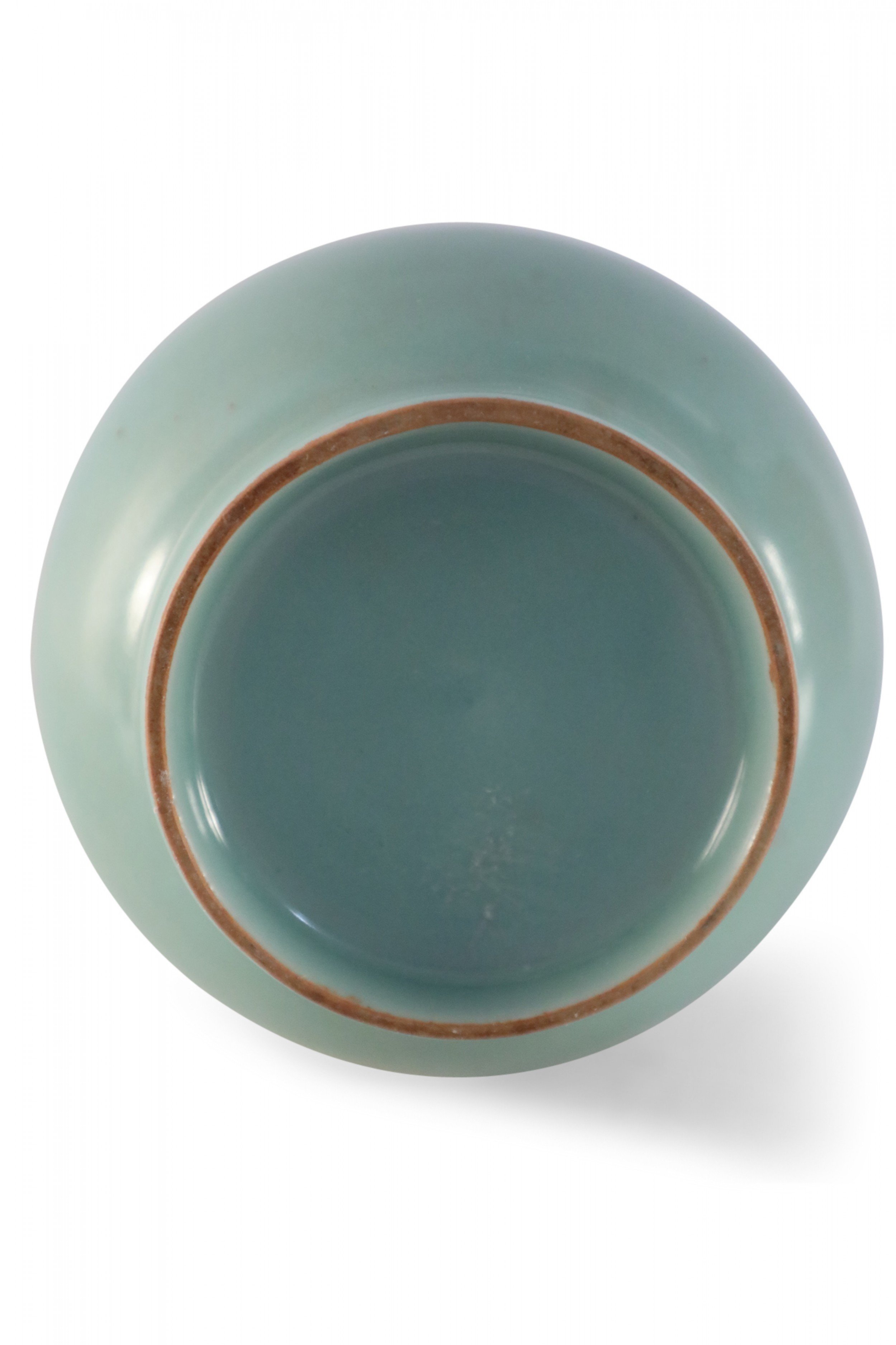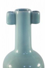 Antique Chinese (Late 19th Century) sky blue porcelain vase with a bulbous base and thin neck flanked by two lug ears at its top.