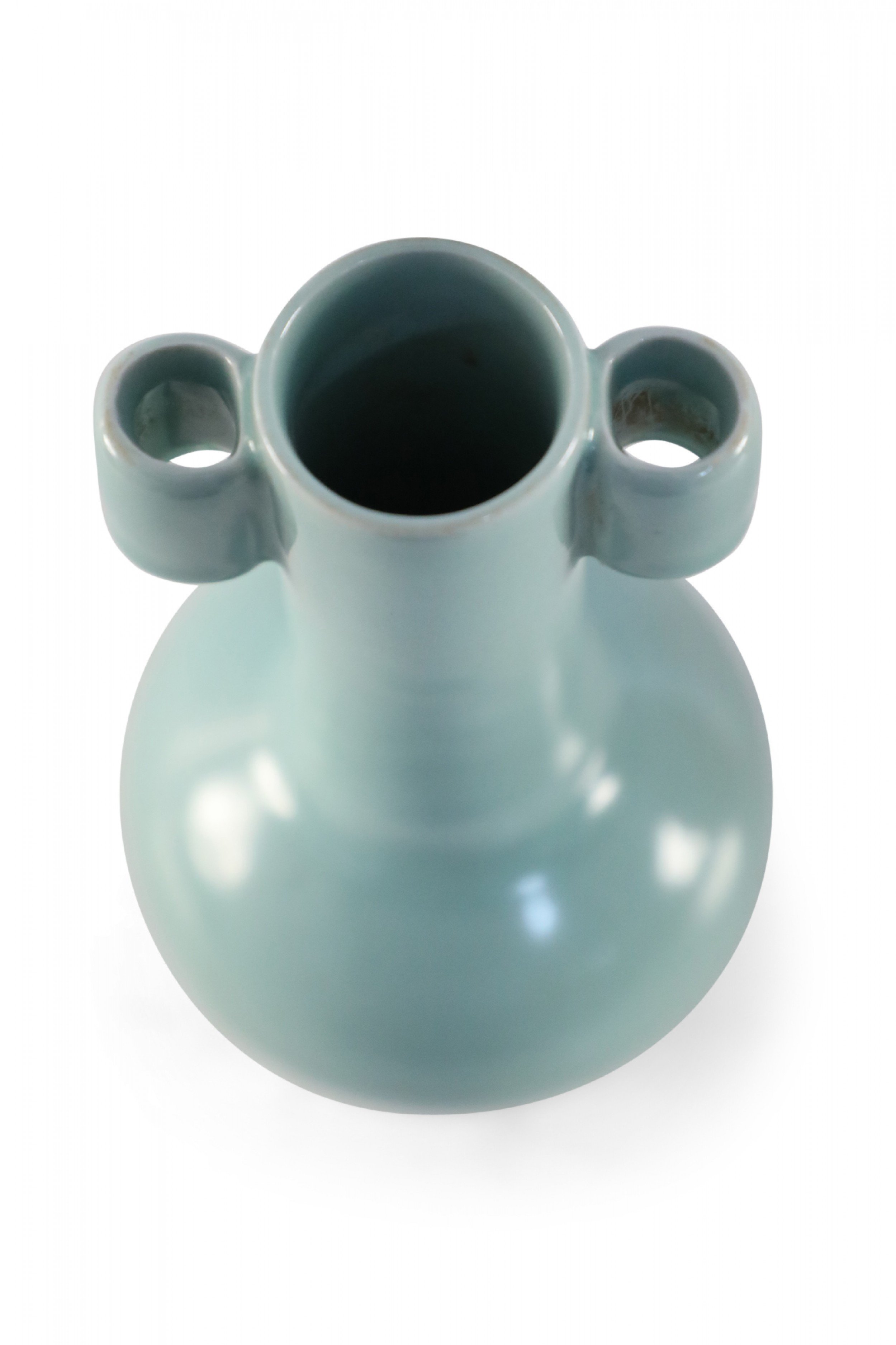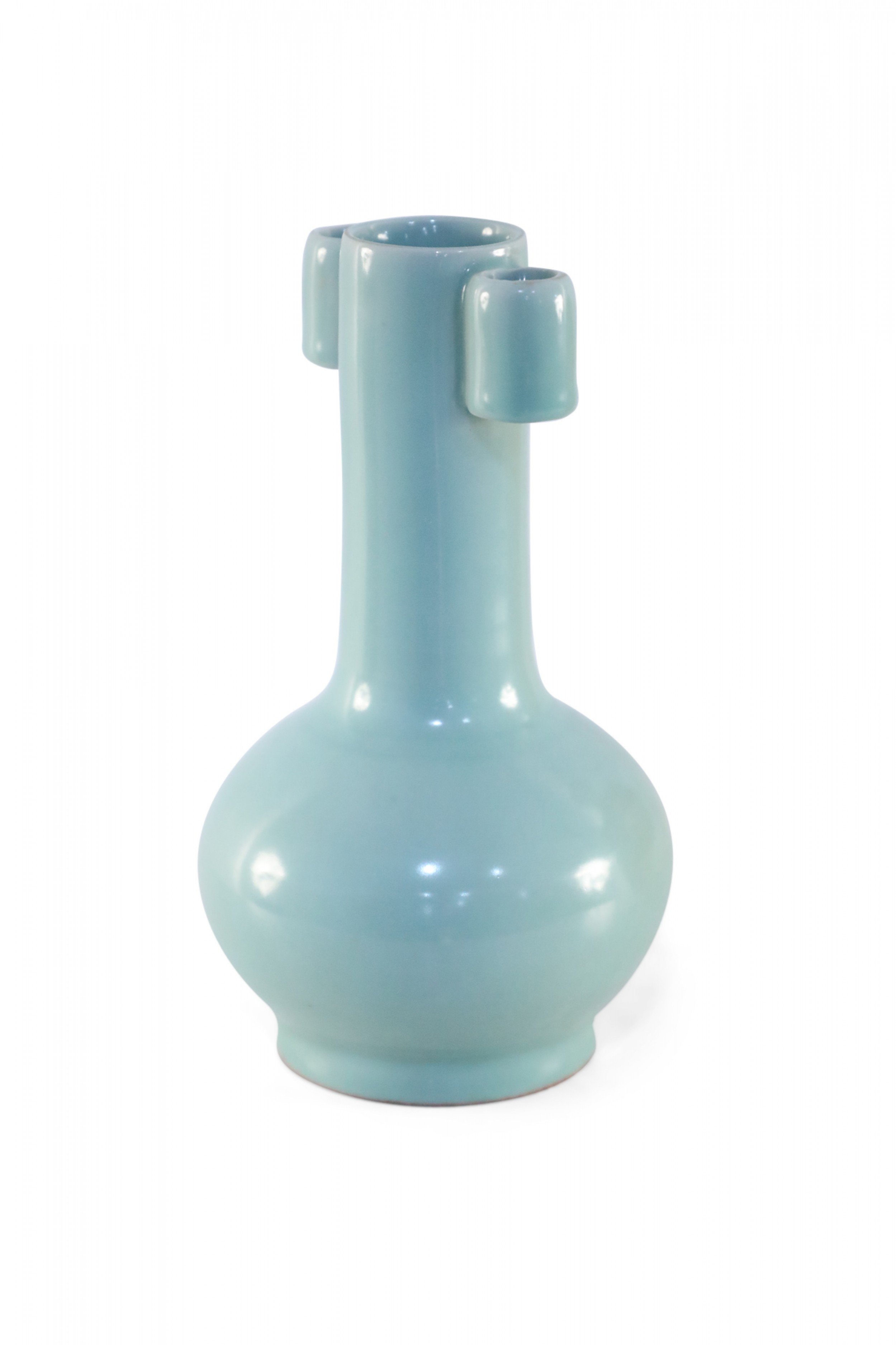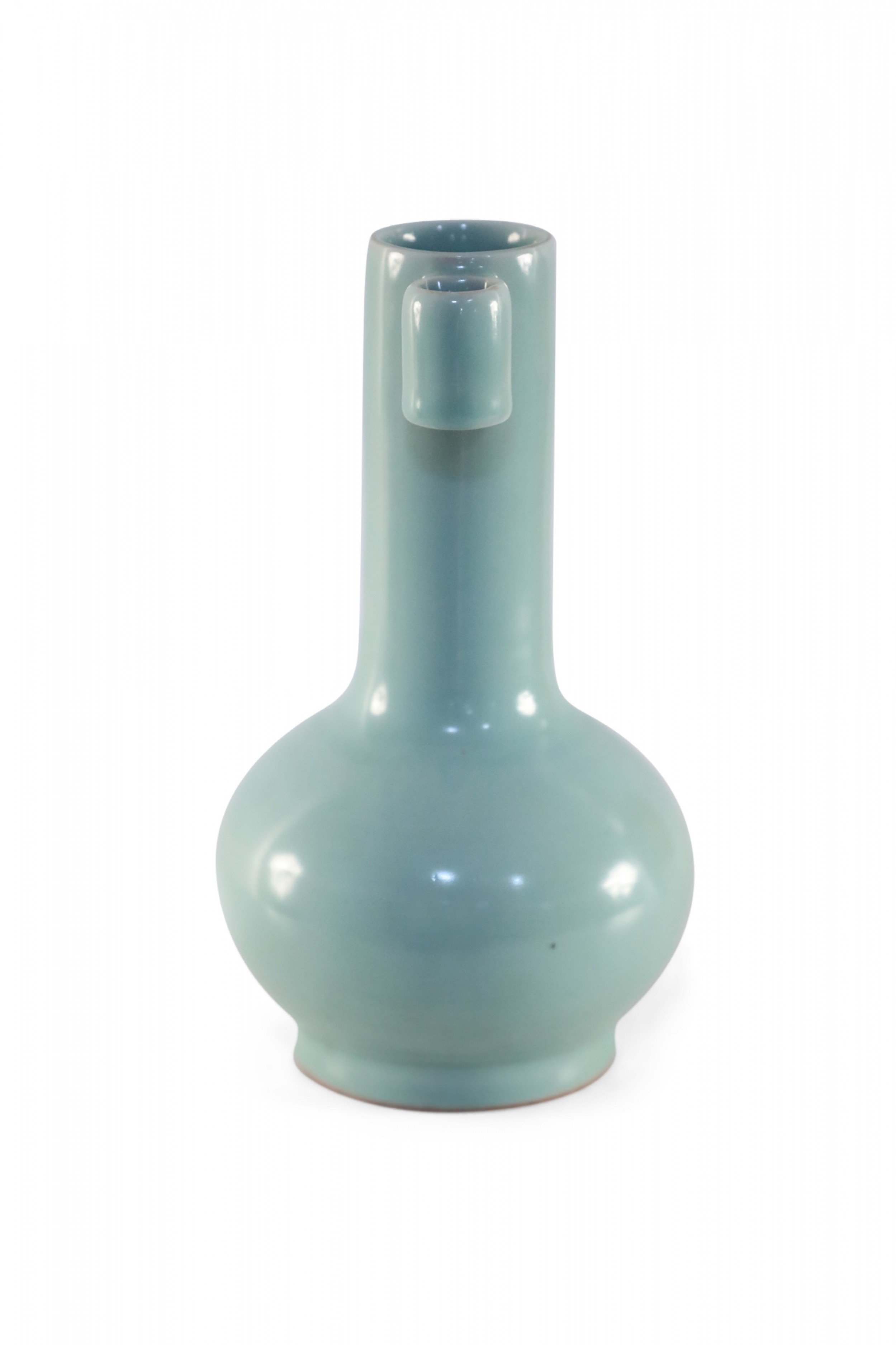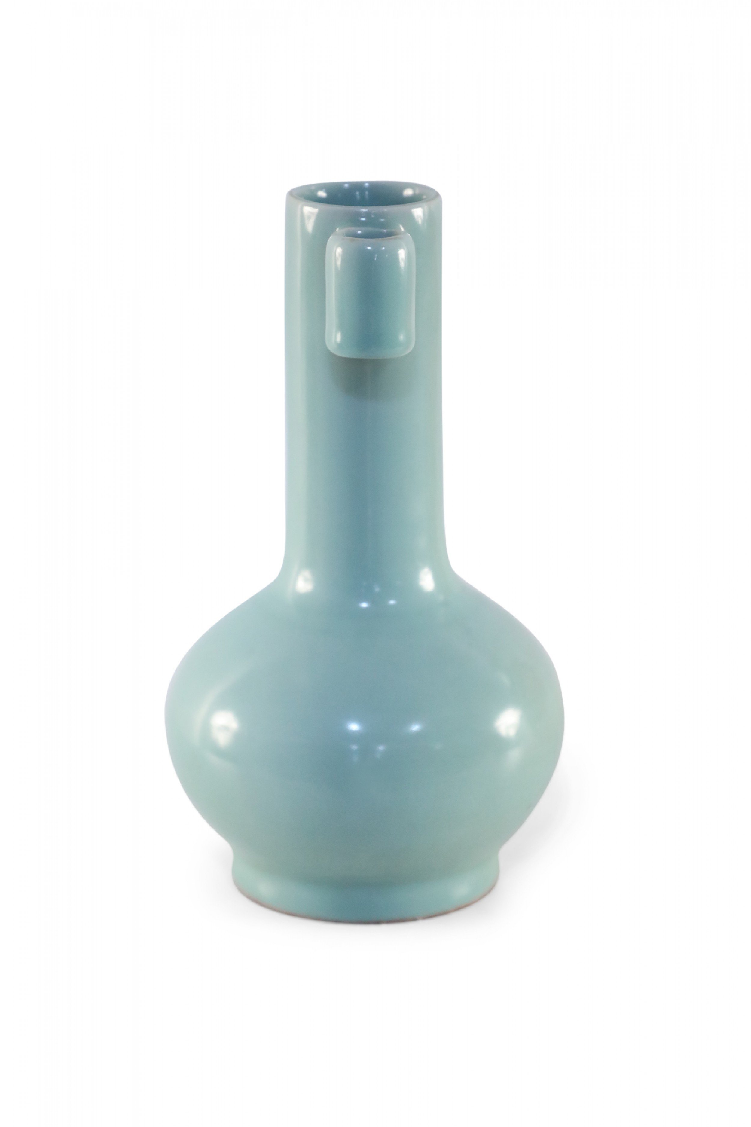 Antique Chinese (Late 19th Century) sky blue porcelain vase with a bulbous base and thin neck flanked by two lug ears at its top..