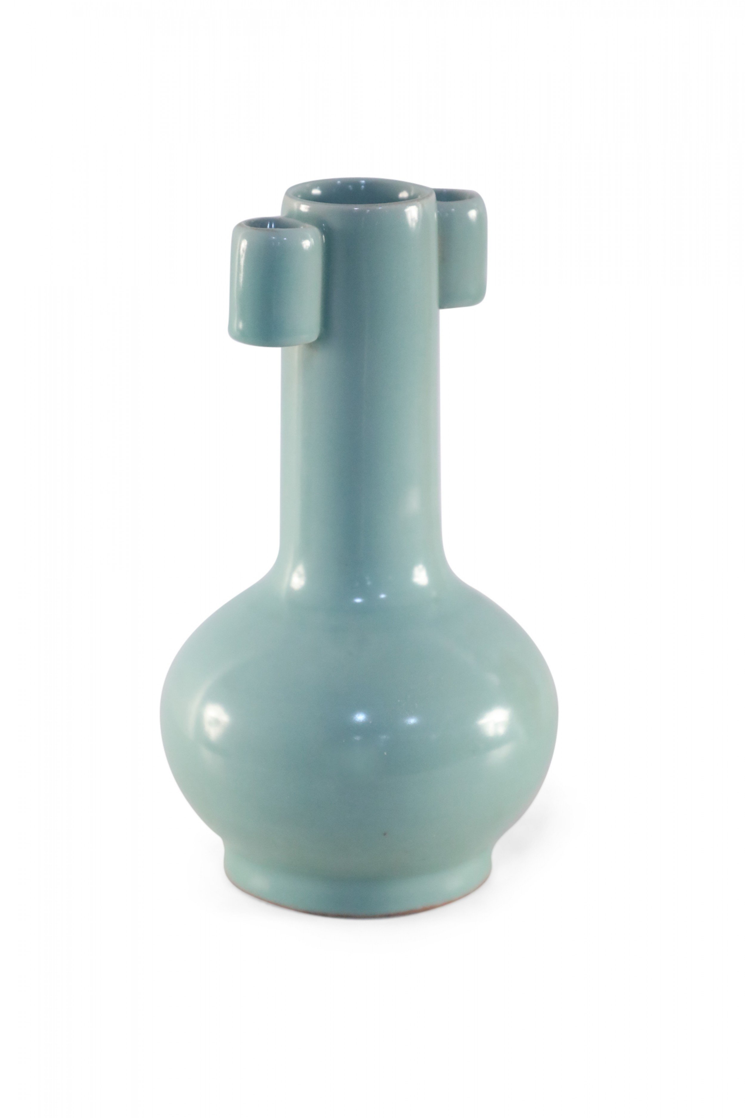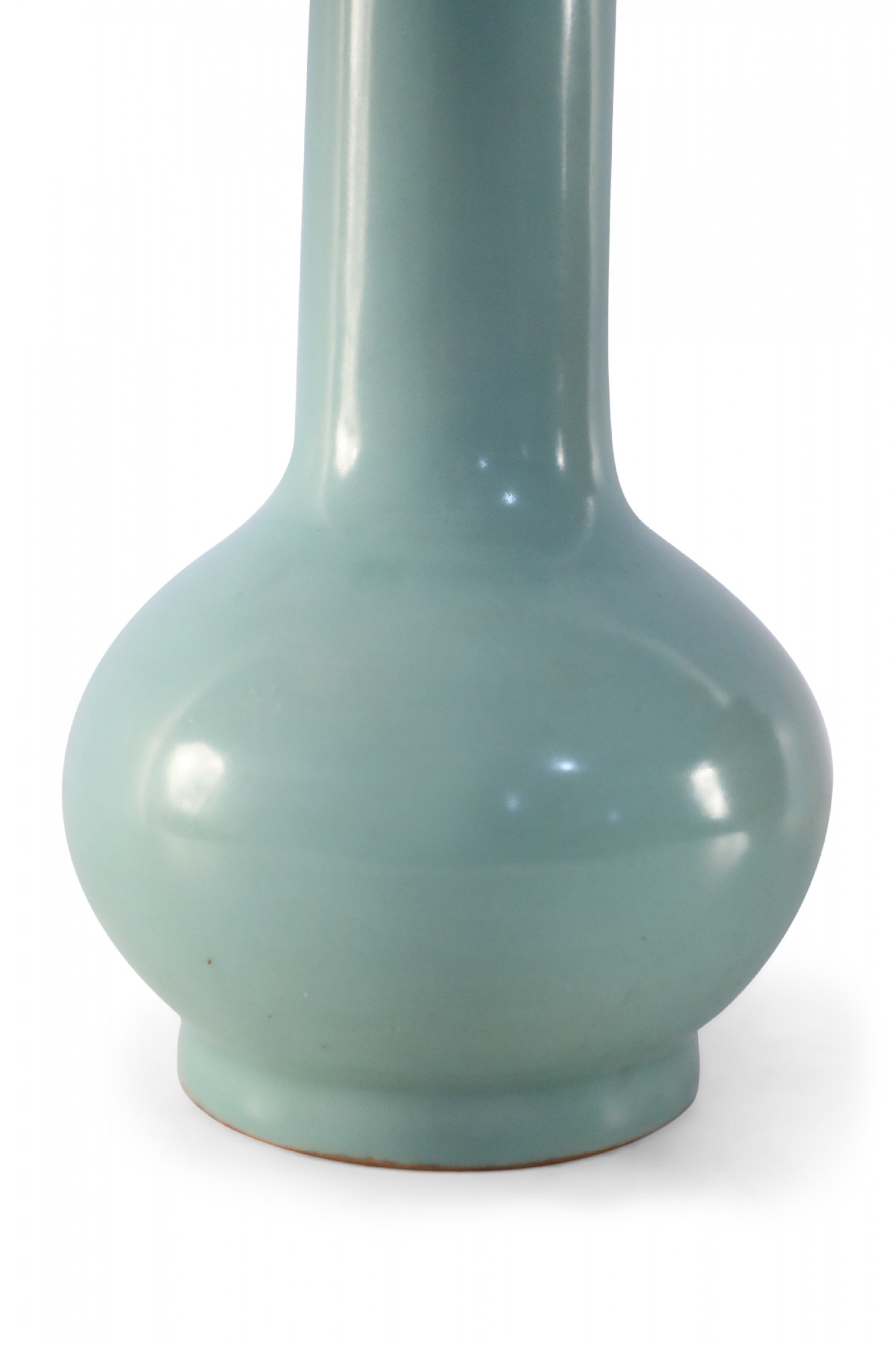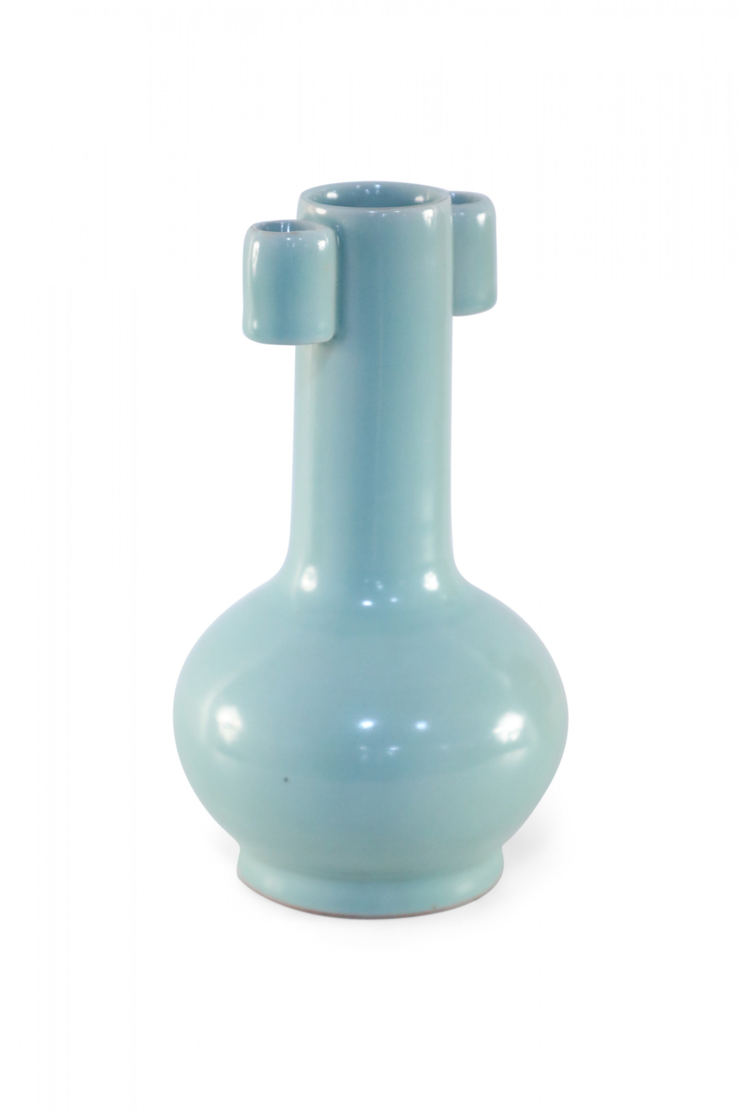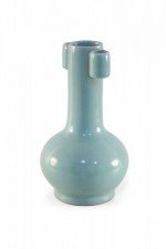 Antique Chinese (Late 19th Century) sky blue porcelain vase with a bulbous base and thin neck flanked by two lug ears at its top..