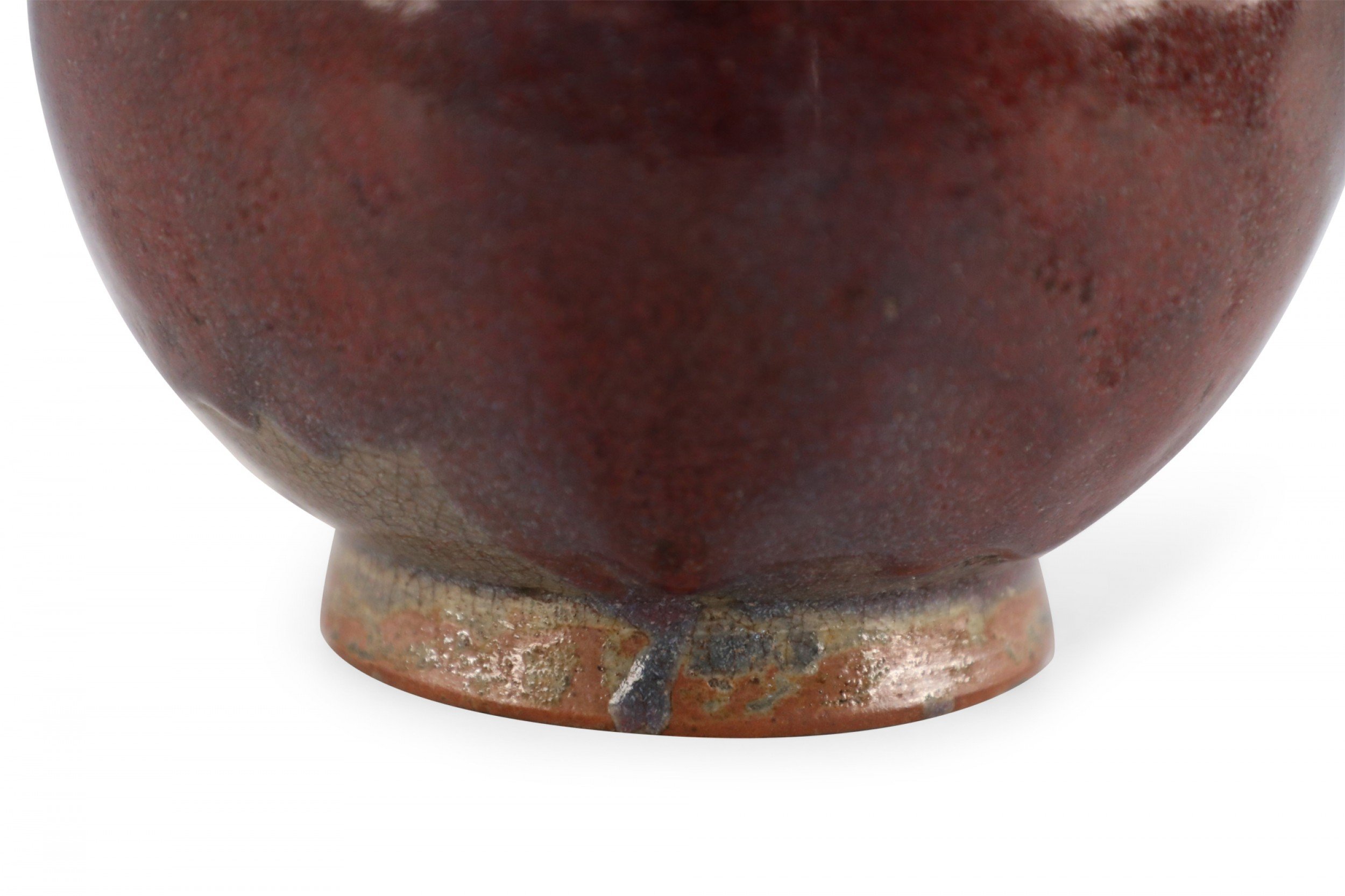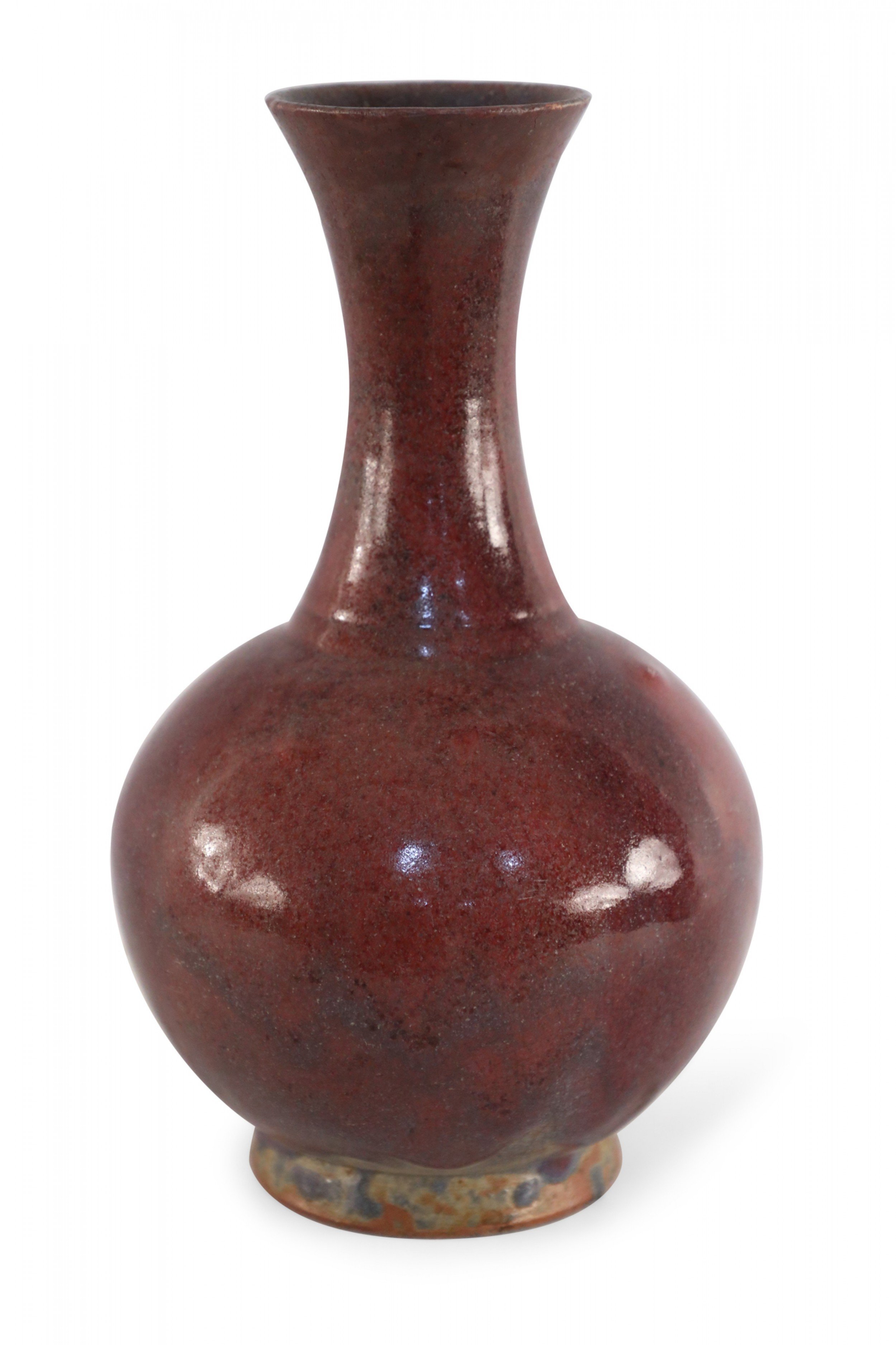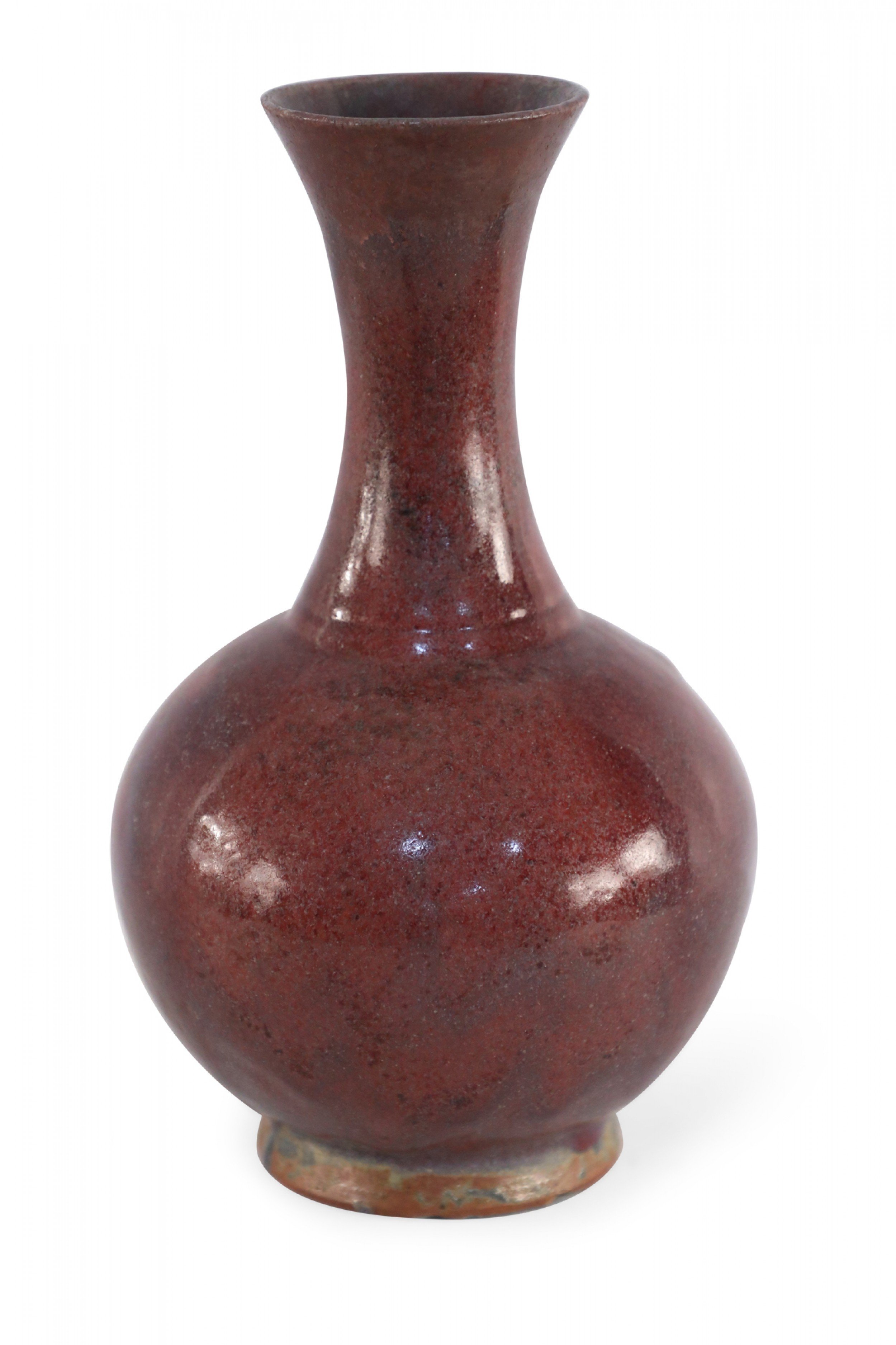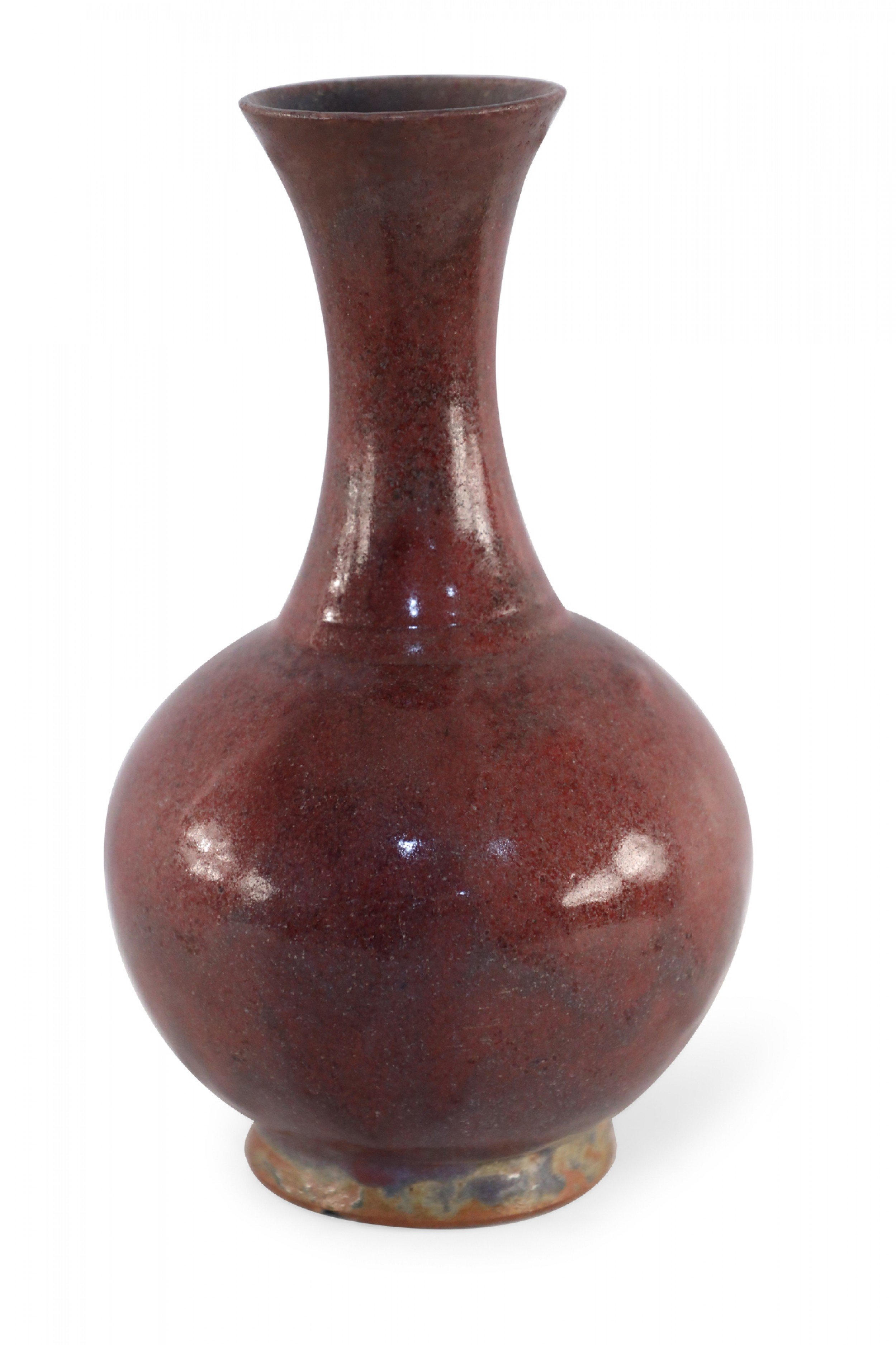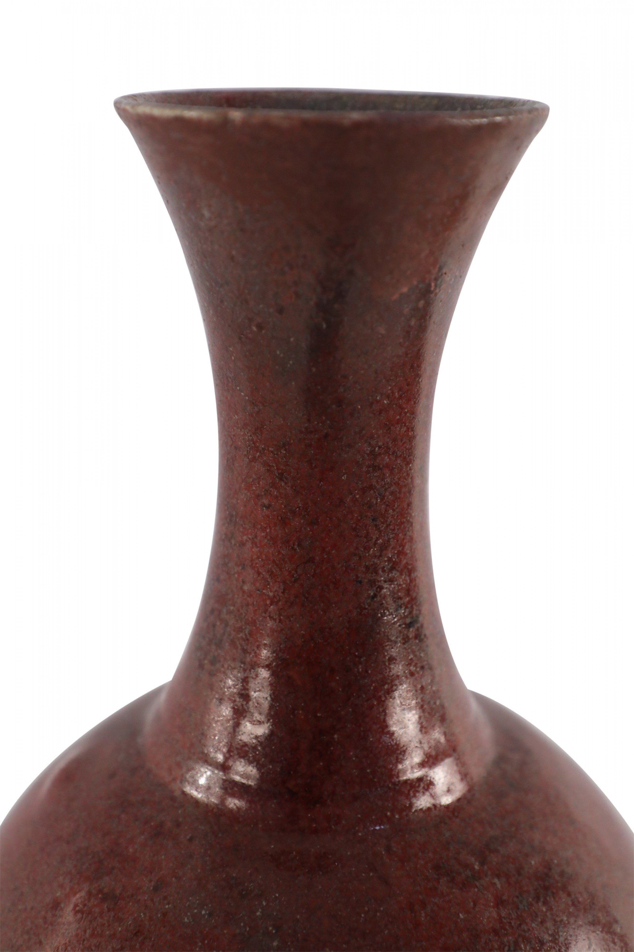 Chinese porcelain vase with a fluted opening and a speckled maroon finish that adds dimension to its rounded base, sitting atop an earthtone glazed foot..