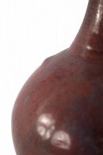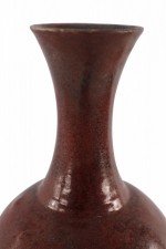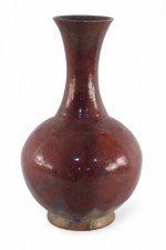 Chinese porcelain vase with a fluted opening and a speckled maroon finish that adds dimension to its rounded base, sitting atop an earthtone glazed foot.