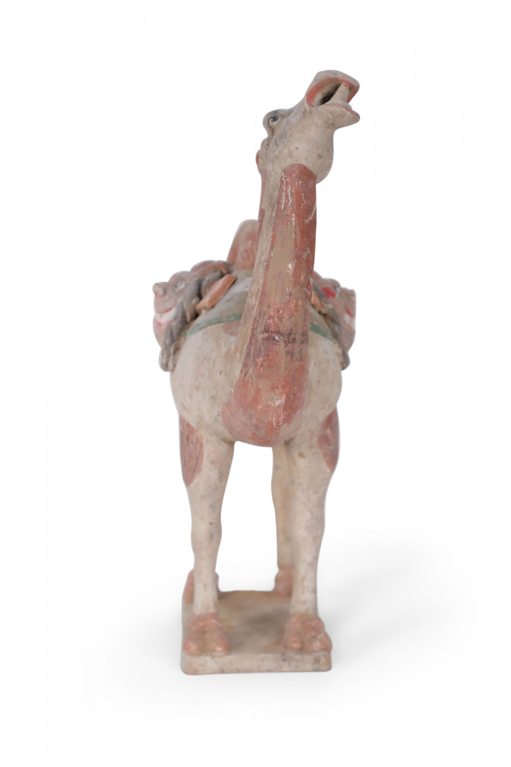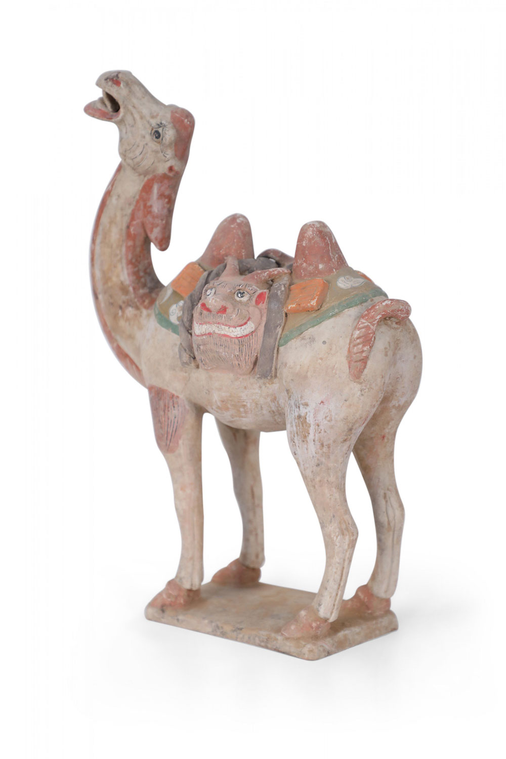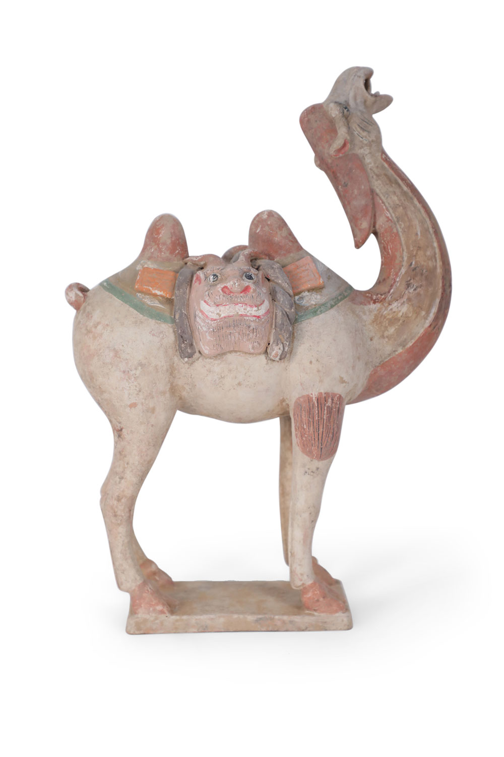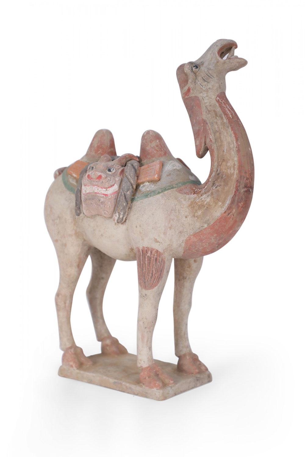 Antique Chinese Tang Dynasty-style terra cotta tomb figure of a Bactrian camel, the main form of transport over the Silk Road, with its head tilted back and mouth open to the sky, wearing a saddle that shows a "monster mask,"" potentially thought to ward off danger.