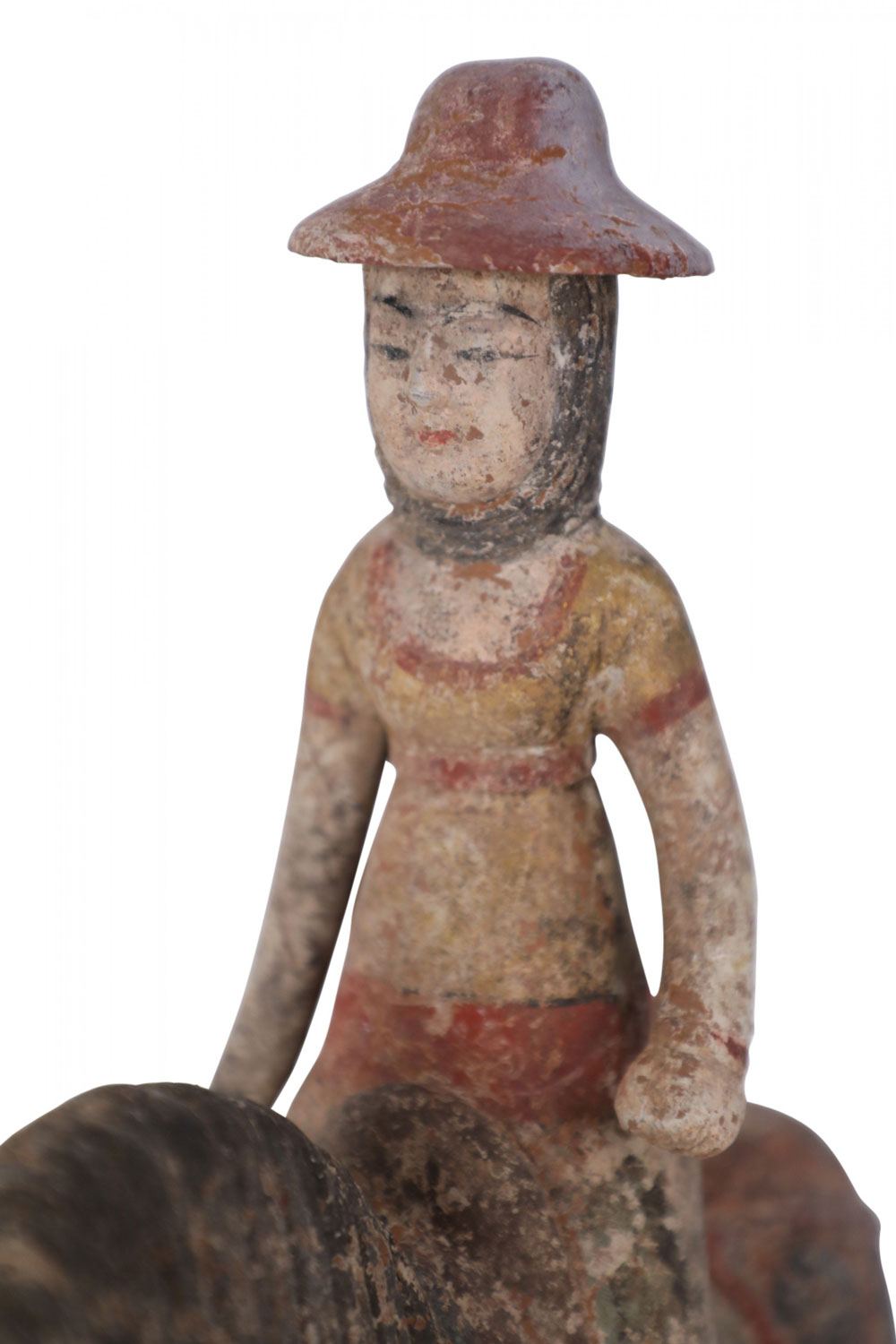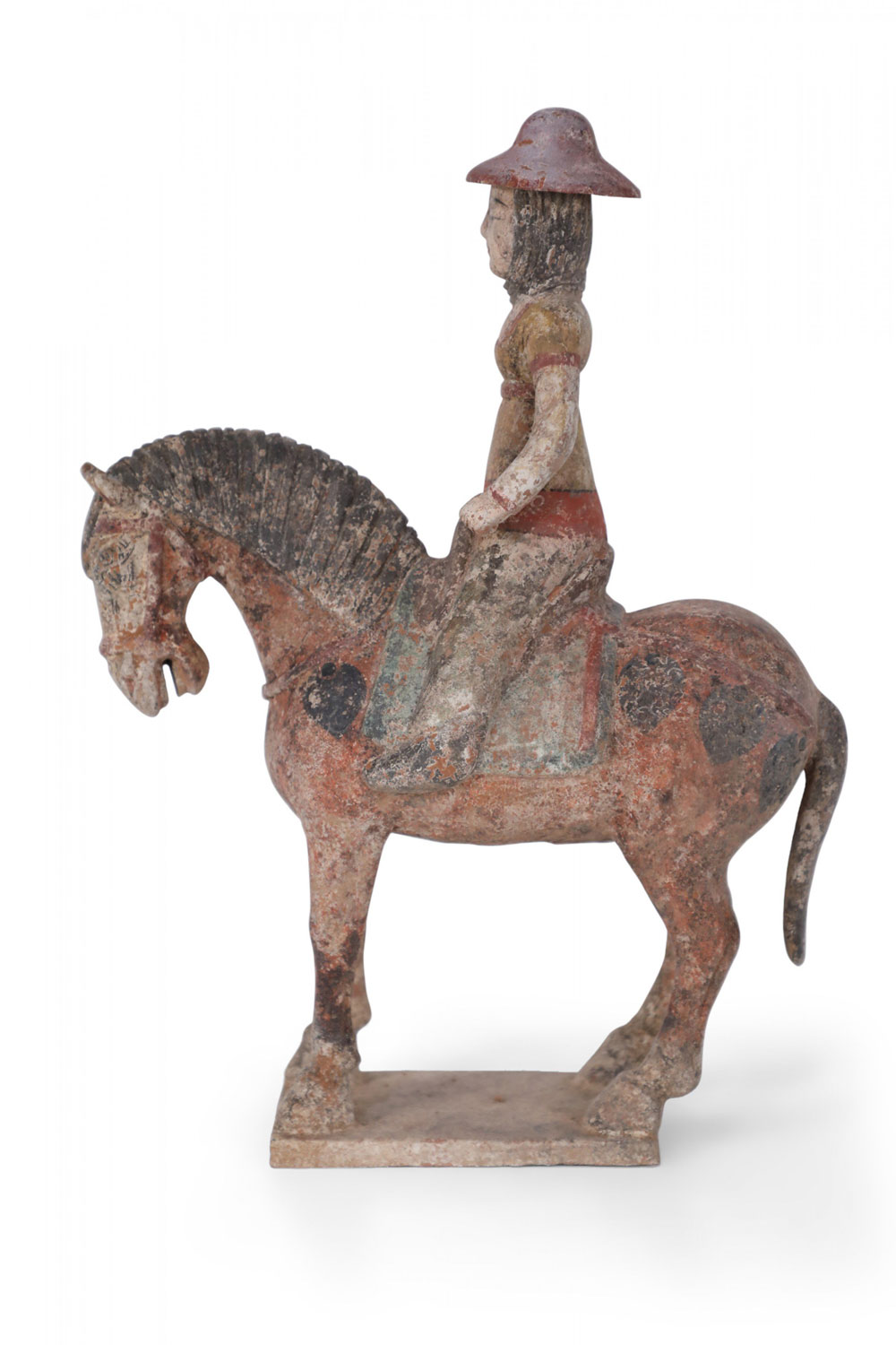 Antique Chinese Tang Dynasty-style terra cotta tomb figure of a girl wearing a red hat riding a brown horse, standing on a textured base (Companion Piece: NWL2549)..