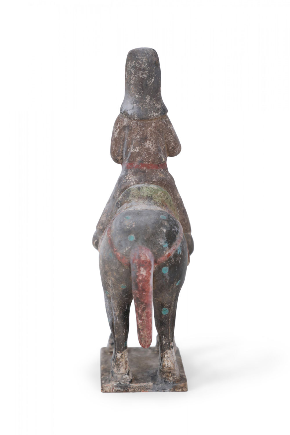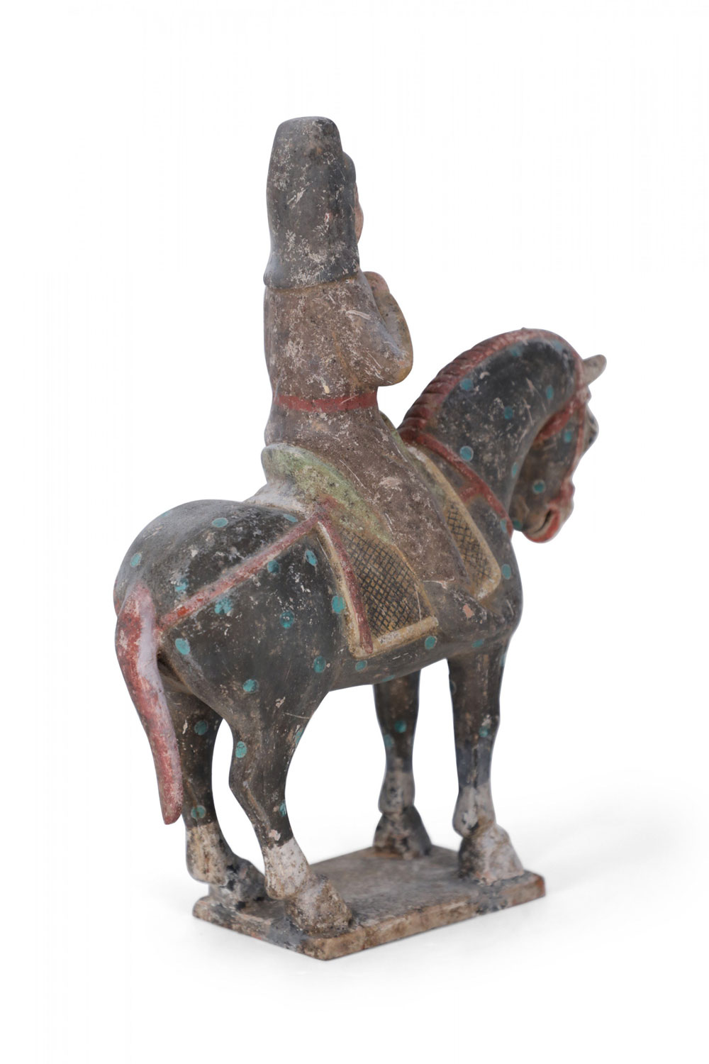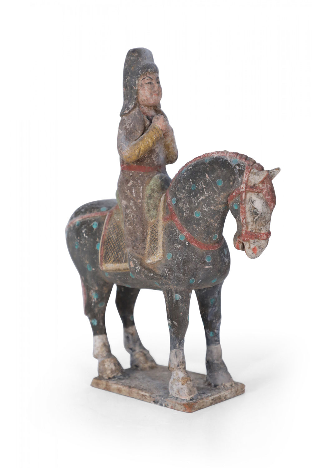 Antique Chinese Tang Dynasty-style terra cotta tomb figure of a rider wearing robes and a red sash sitting on a horse that is painted in blue dots and a red bridle, with its head bowed and standing on a square base (Companion Piece: NWL2554).