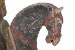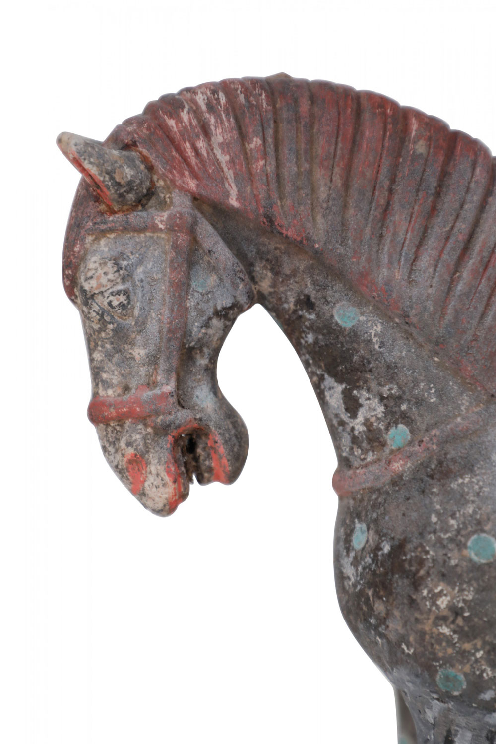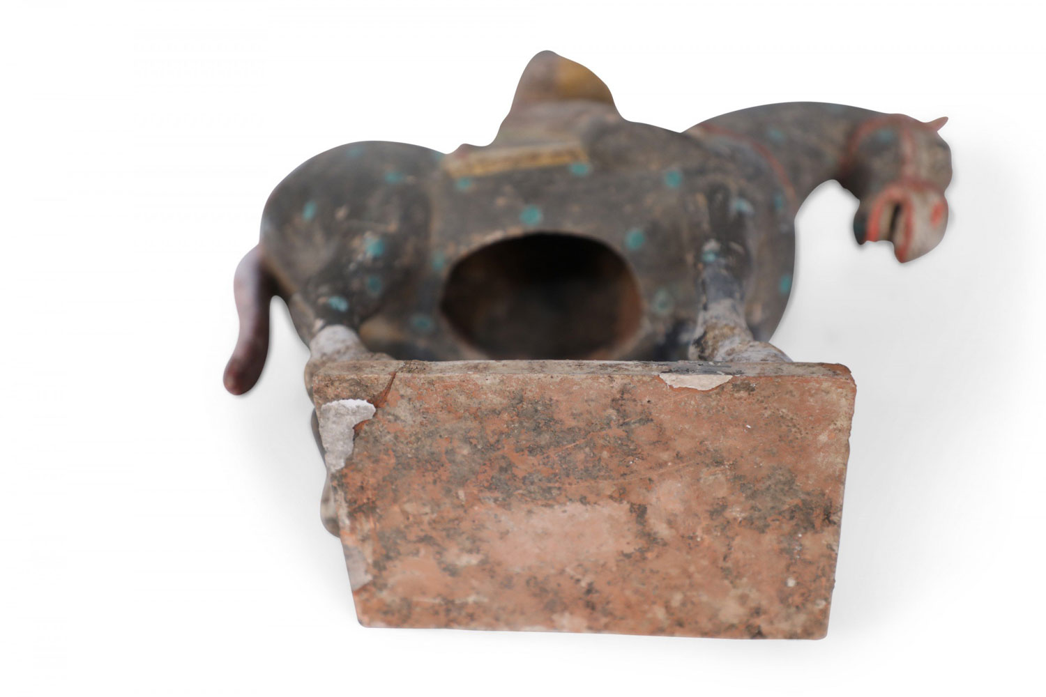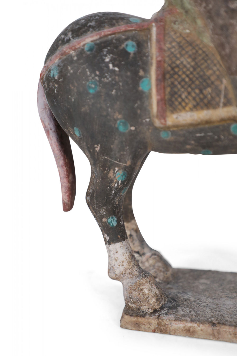 Antique Chinese Tang Dynasty-style terra cotta tomb figure of a rider wearing robes and a red sash sitting on a horse that is painted in blue dots and a red bridle, with its head bowed and standing on a square base (Companion Piece: NWL2554).