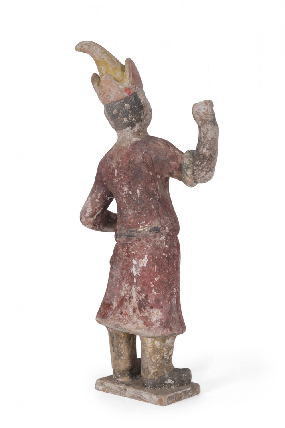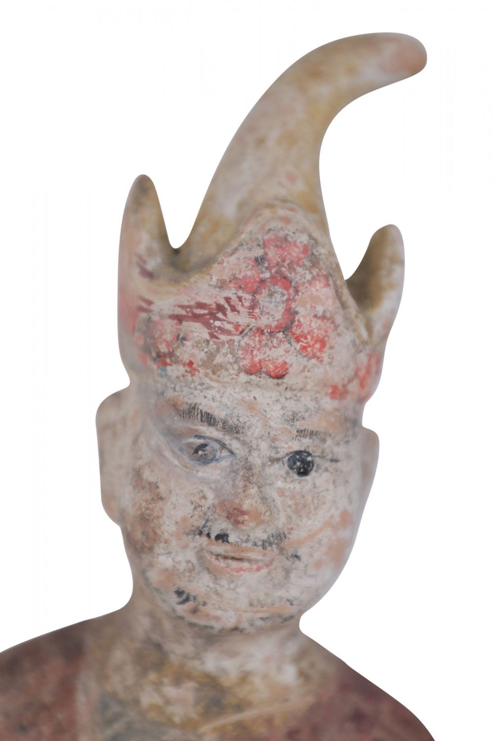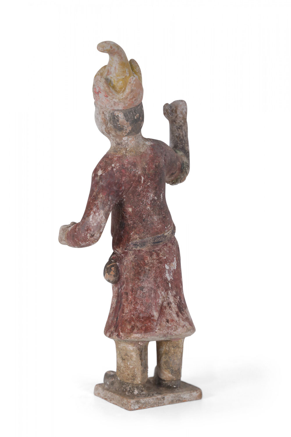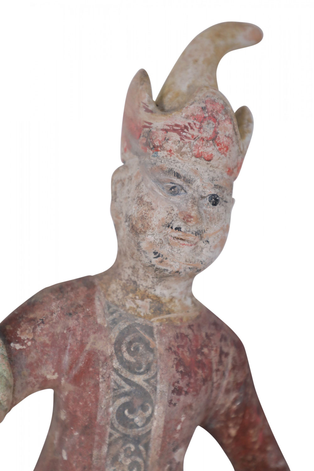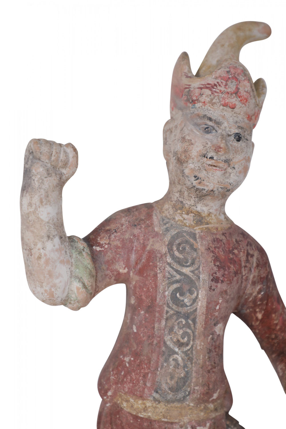Antique Chinese Tang Dynasty-style terra cotta tomb figure of a Huren (northern tribesmen) man dressed in red robes and a prominent hat, with one fist raised in the air..