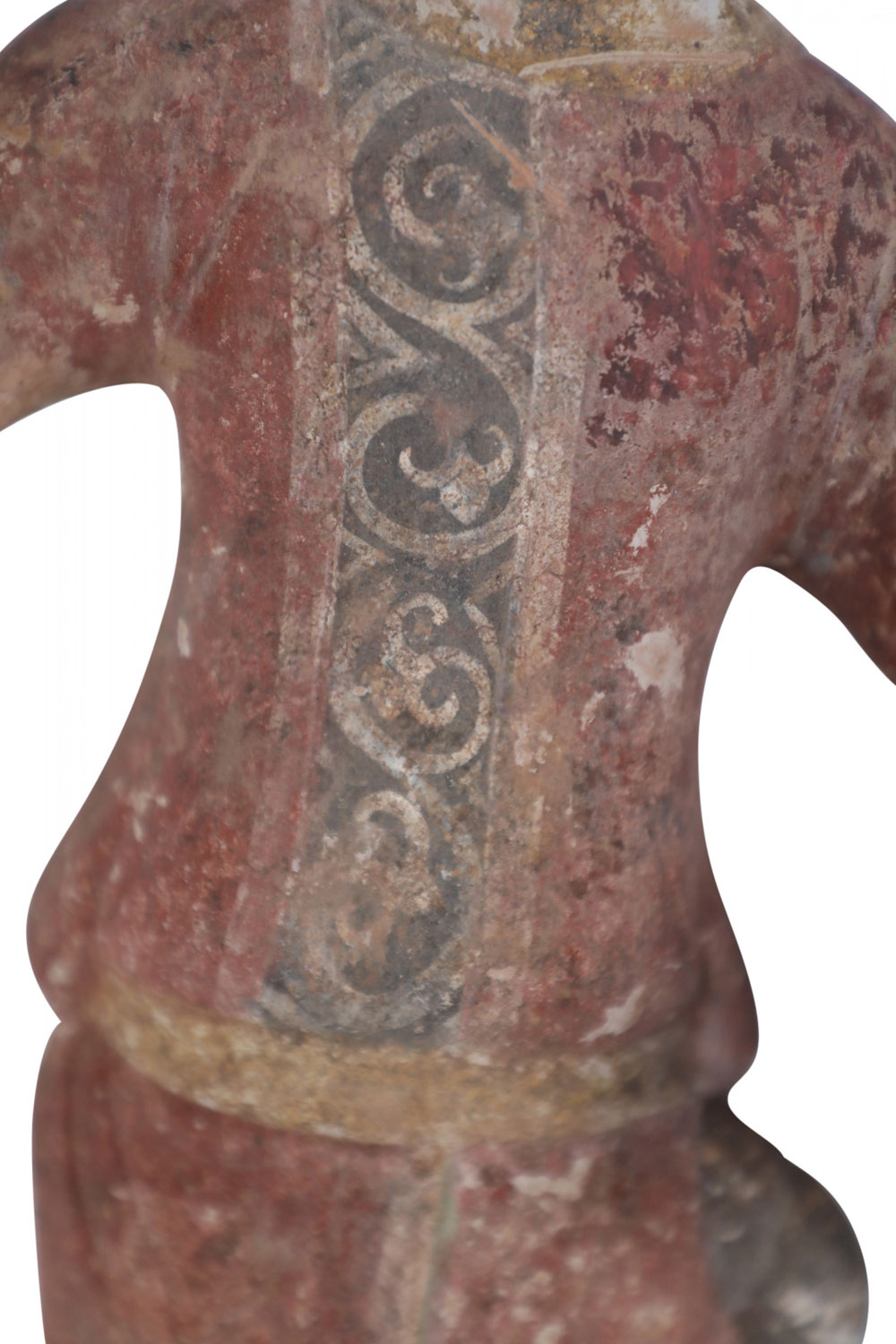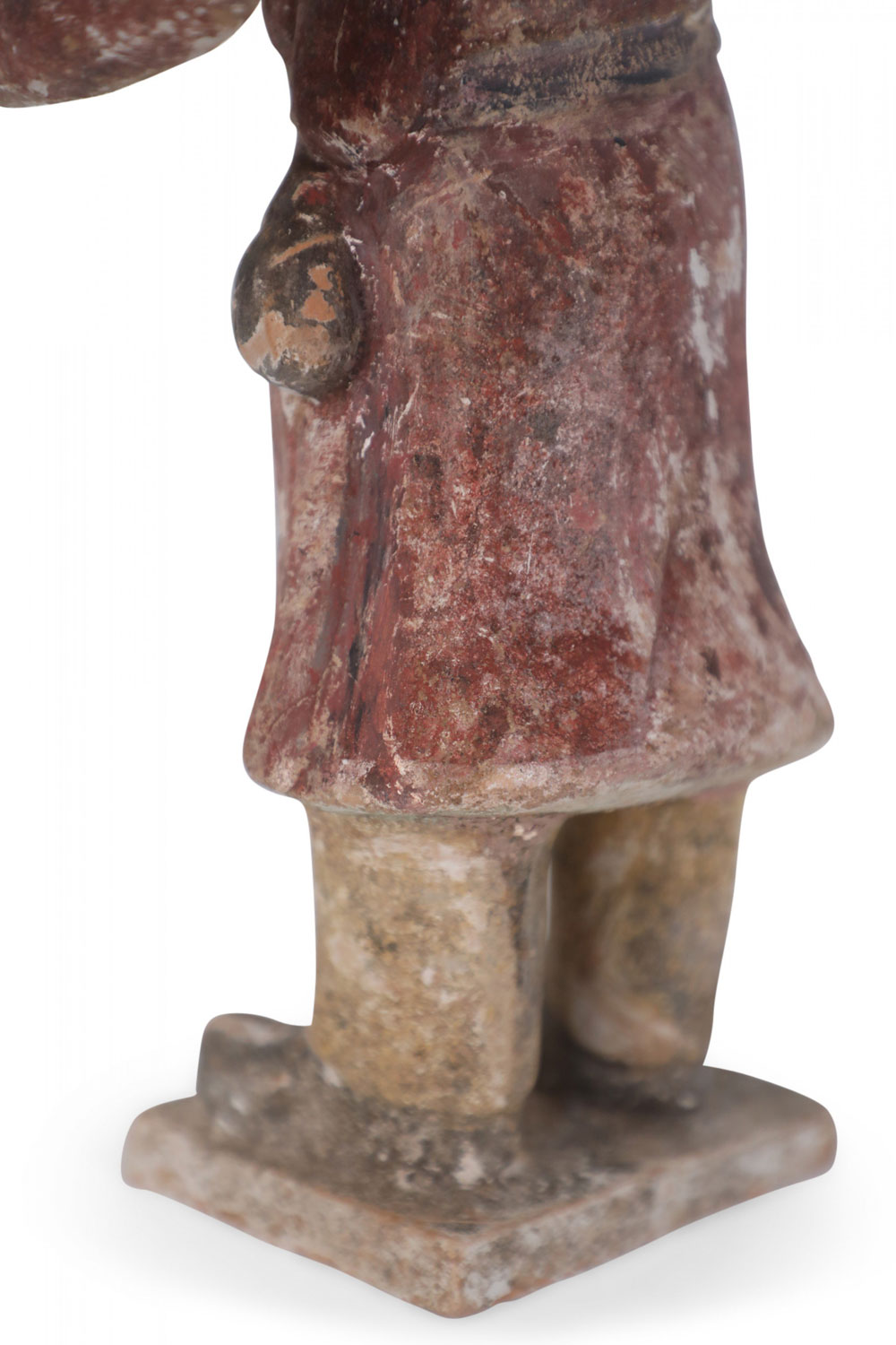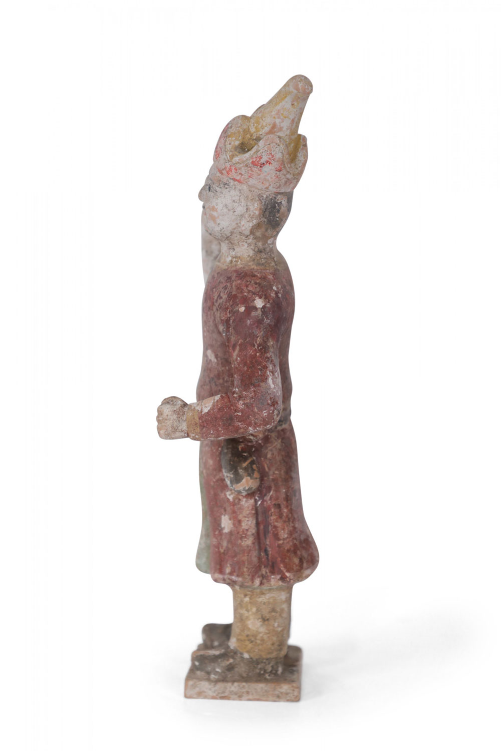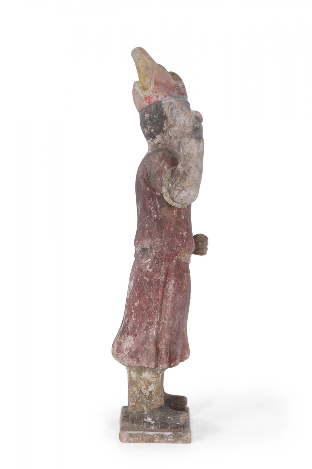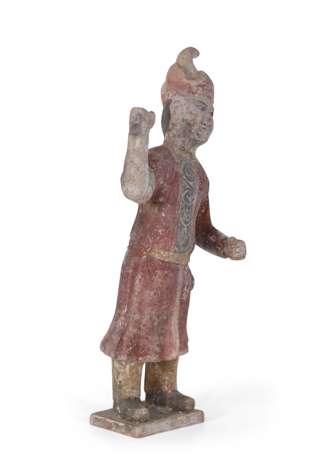 Antique Chinese Tang Dynasty-style terra cotta tomb figure of a Huren (northern tribesmen) man dressed in red robes and a prominent hat, with one fist raised in the air..