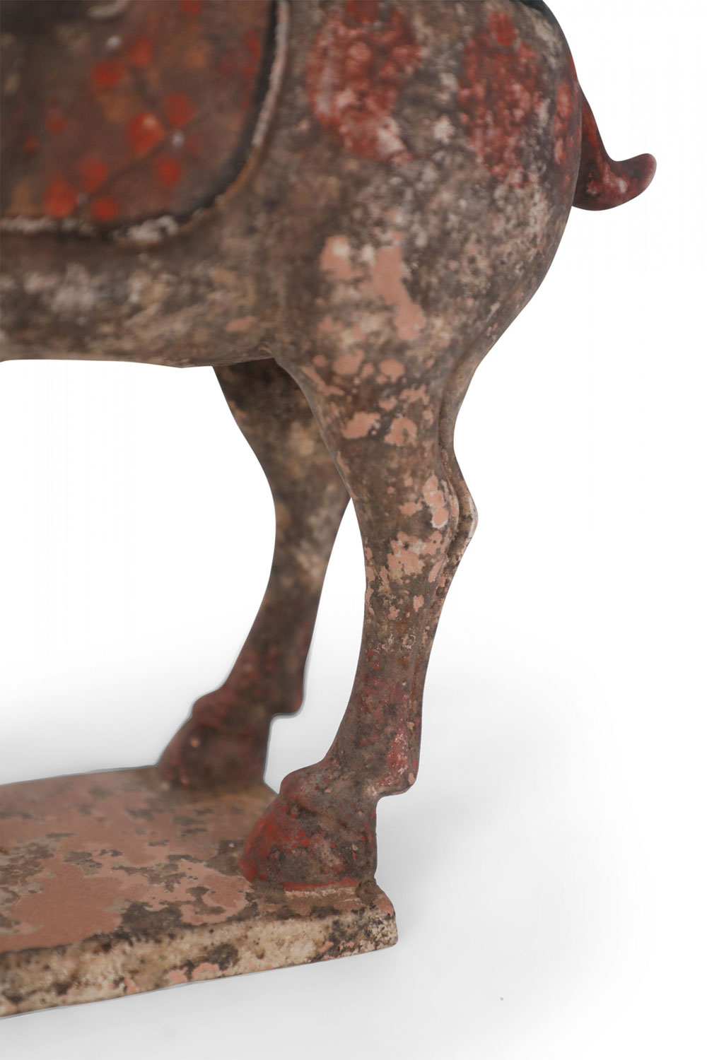 Antique Chinese Tang Dynasty-style terra cotta tomb figure of a man dressed in dark gray robes, with one fist raised in the air, sitting atop a red saddle, on a horse that is painted with blue dots, and standing on a square base (Companion Piece: NWL2556)..