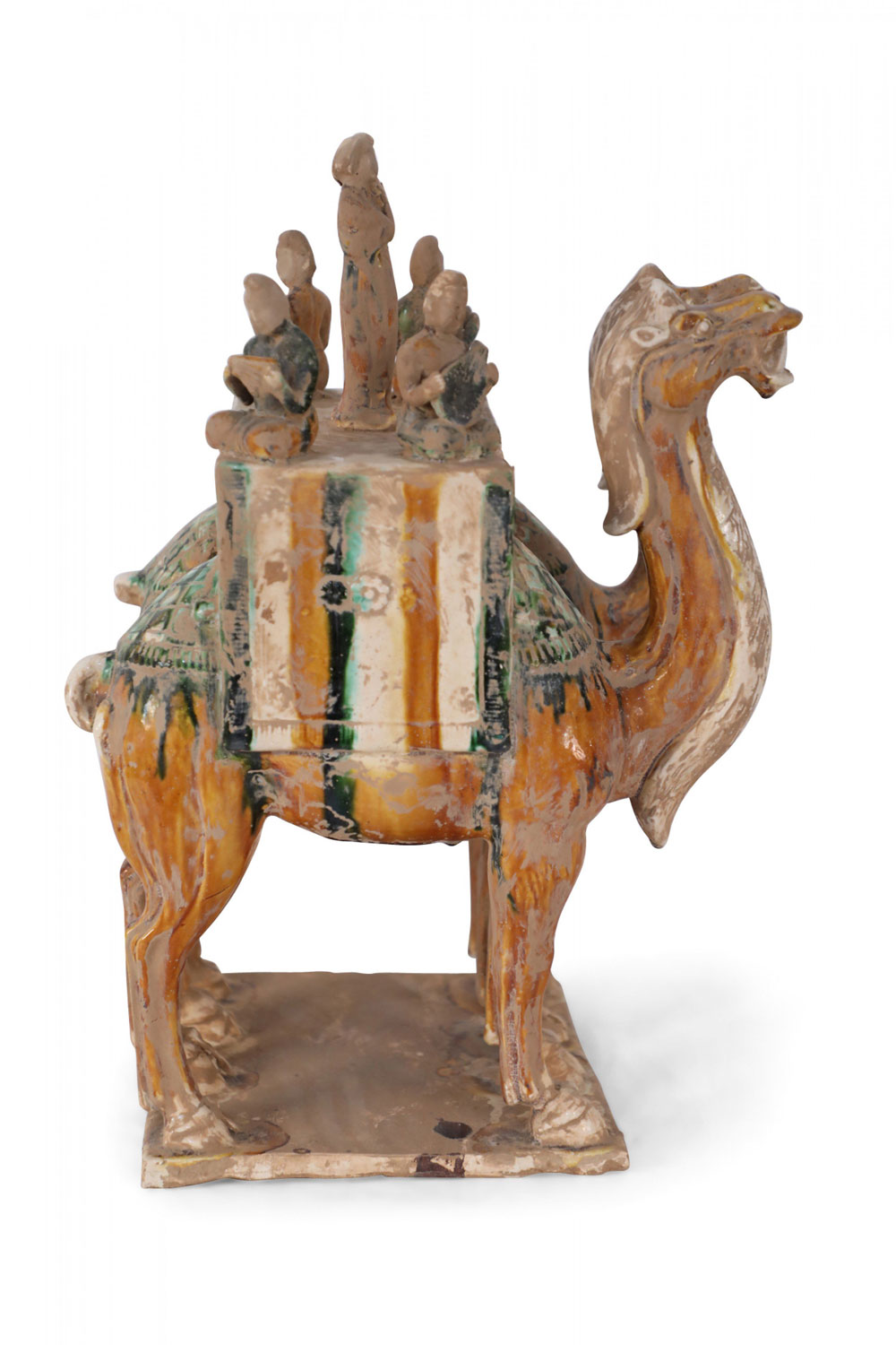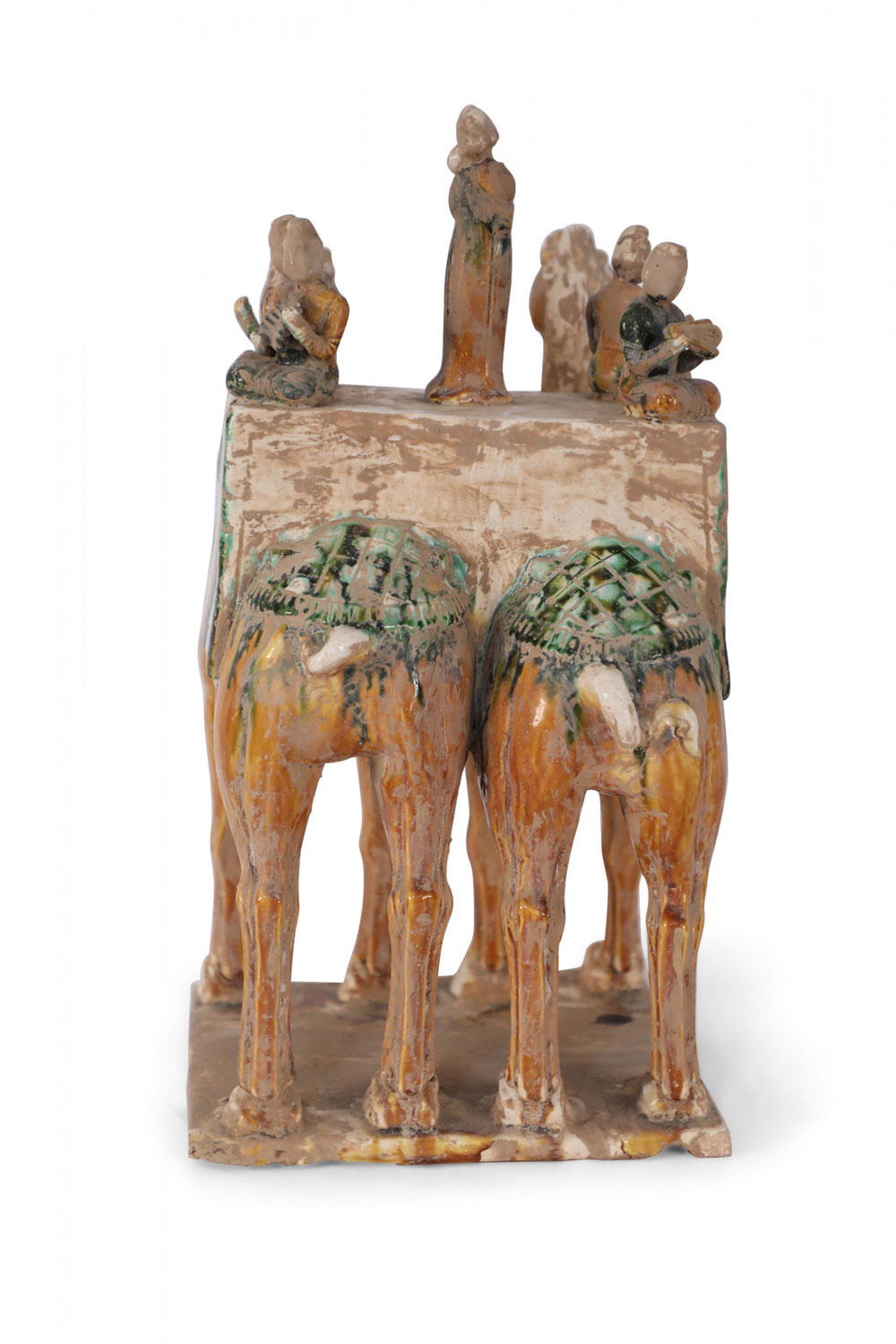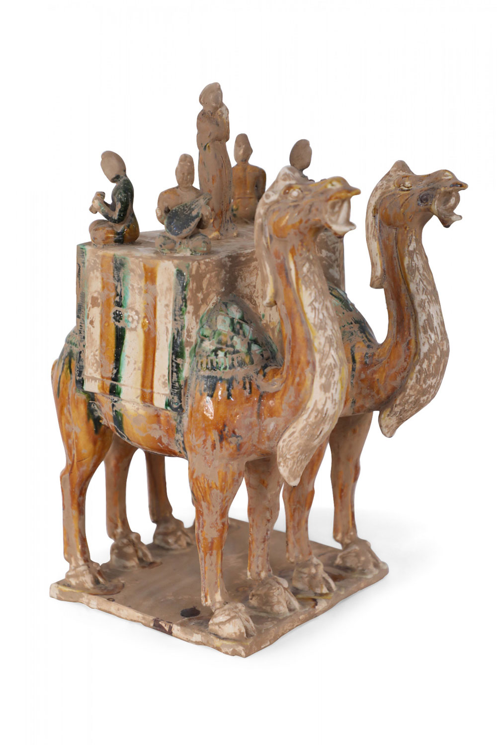 Antique Chinese Tang Dynasty-style terra cotta tomb figure of two camels carrying a band of five musicians - four seated with instruments, and one central figure standing to sing. The figure is crafted with the Tang Dynasty's traditional tri-color glaze, or Sancai, utilizing brown, green and off-white..