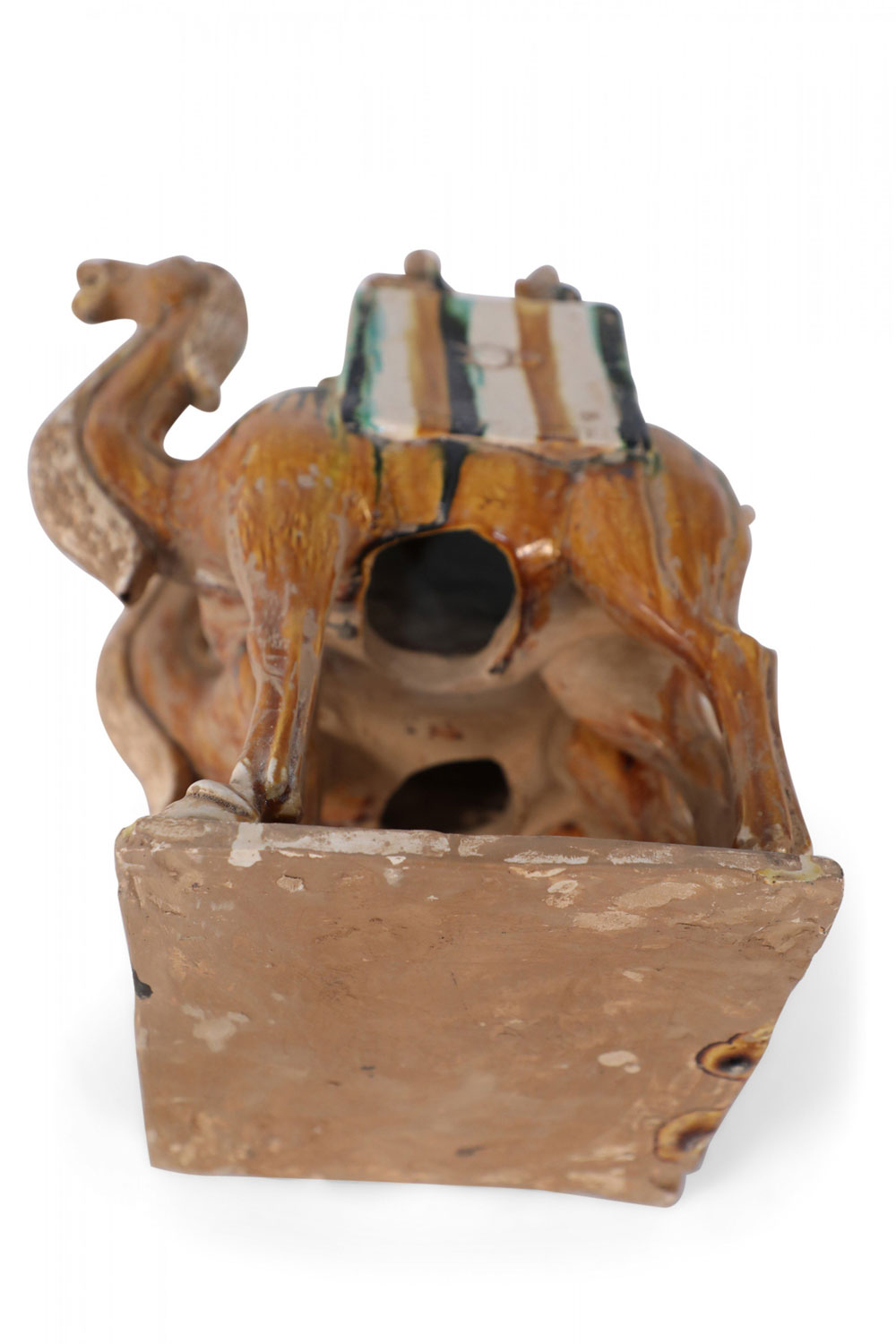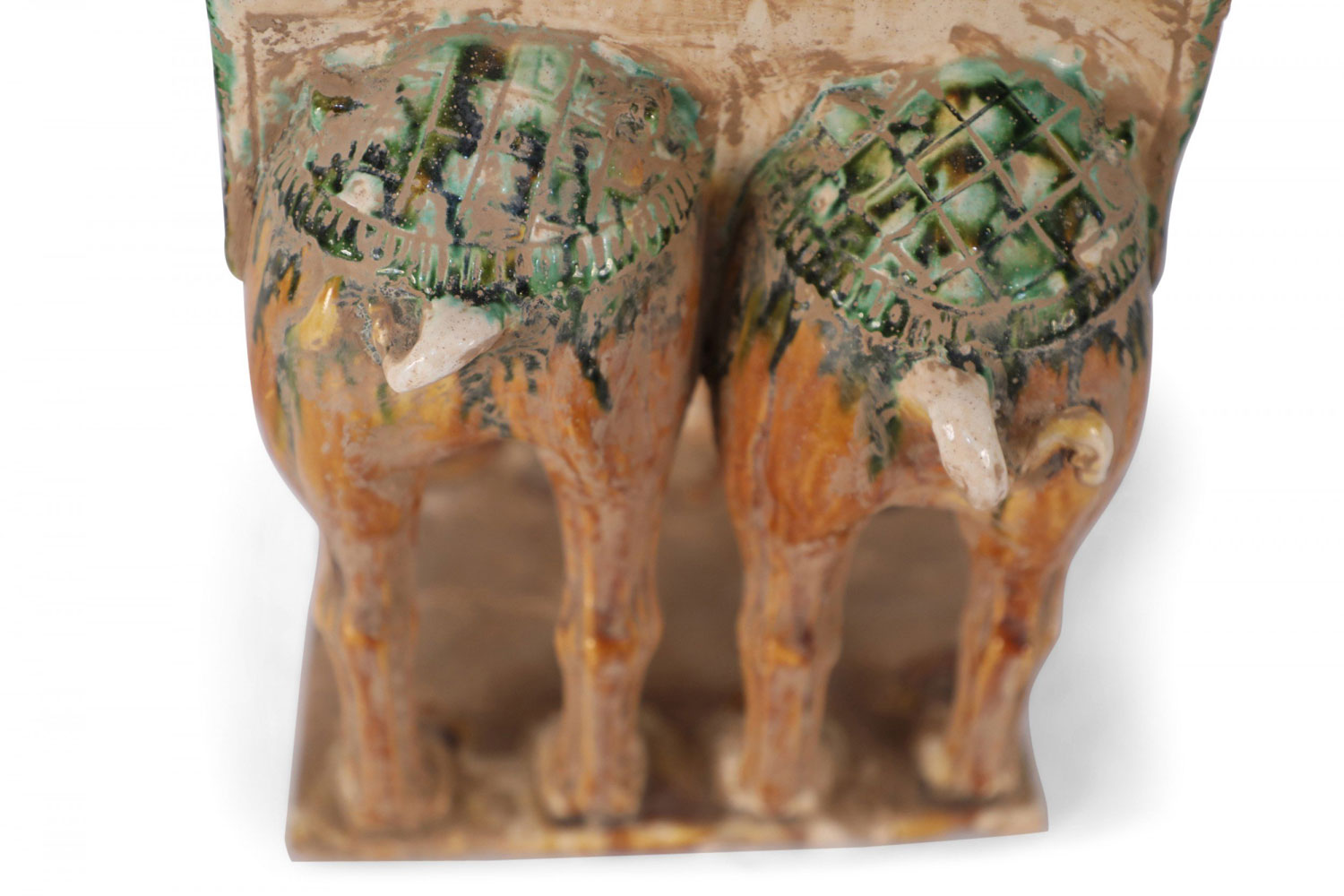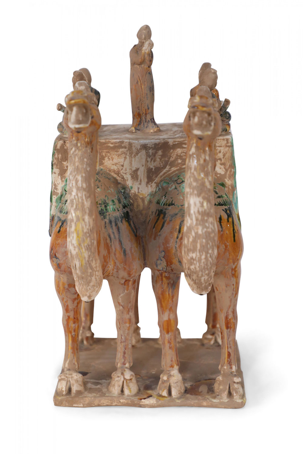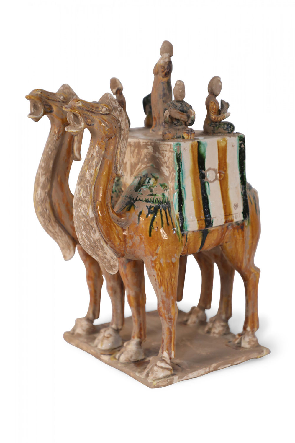 Antique Chinese Tang Dynasty-style terra cotta tomb figure of two camels carrying a band of five musicians - four seated with instruments, and one central figure standing to sing. The figure is crafted with the Tang Dynasty's traditional tri-color glaze, or Sancai, utilizing brown, green and off-white..