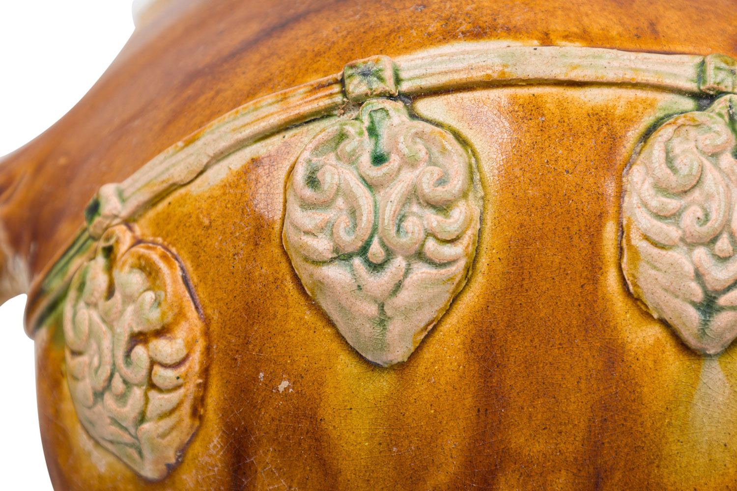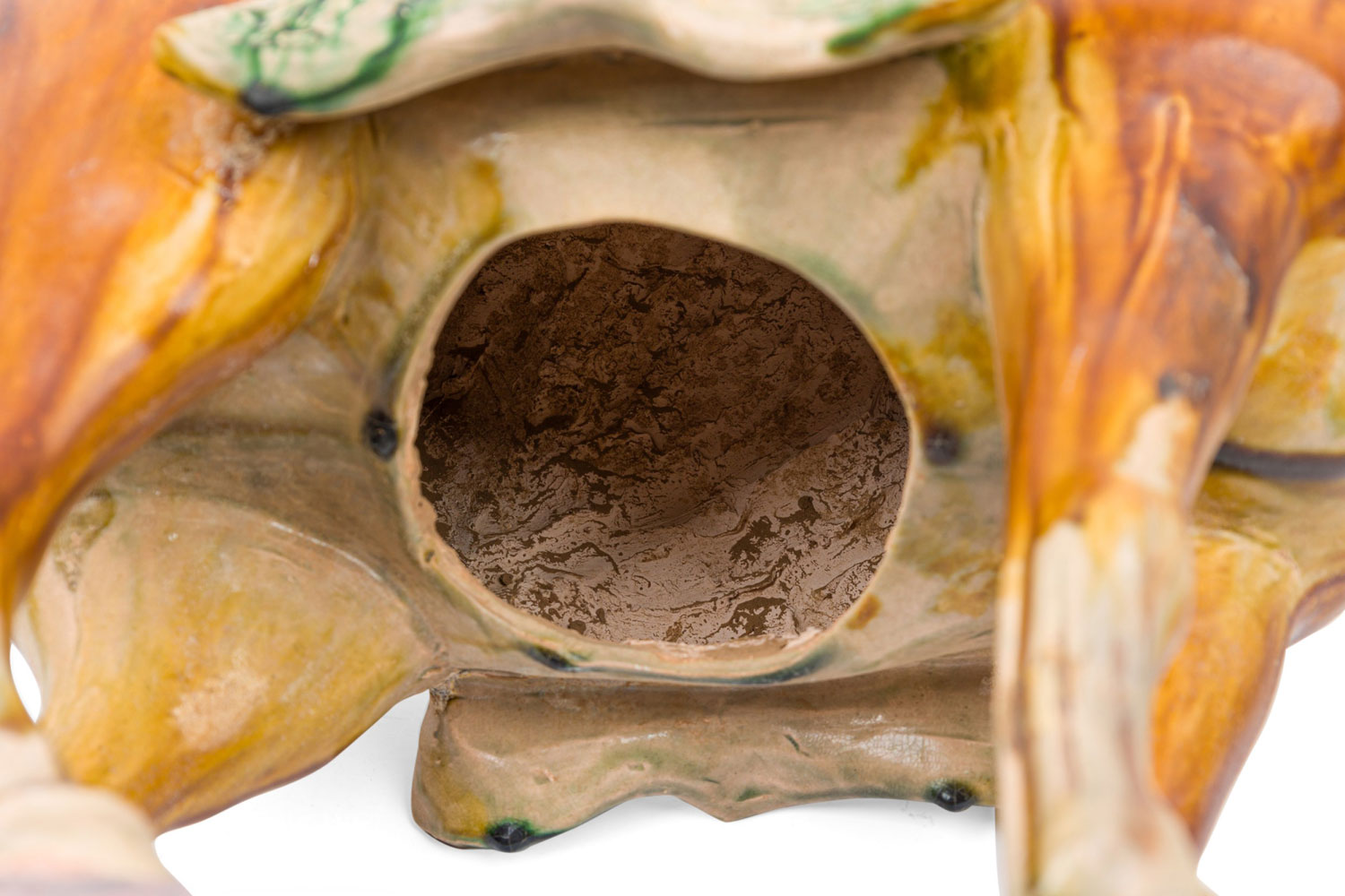 Antique Chinese Tang Dynasty-style terra cotta figure of a horse commonly used as a tomb figure for wealthy burials in the 7-8th centuries, and crafted with traditional tri-color glaze, or Sancai, utilizing brown, green and off-white..