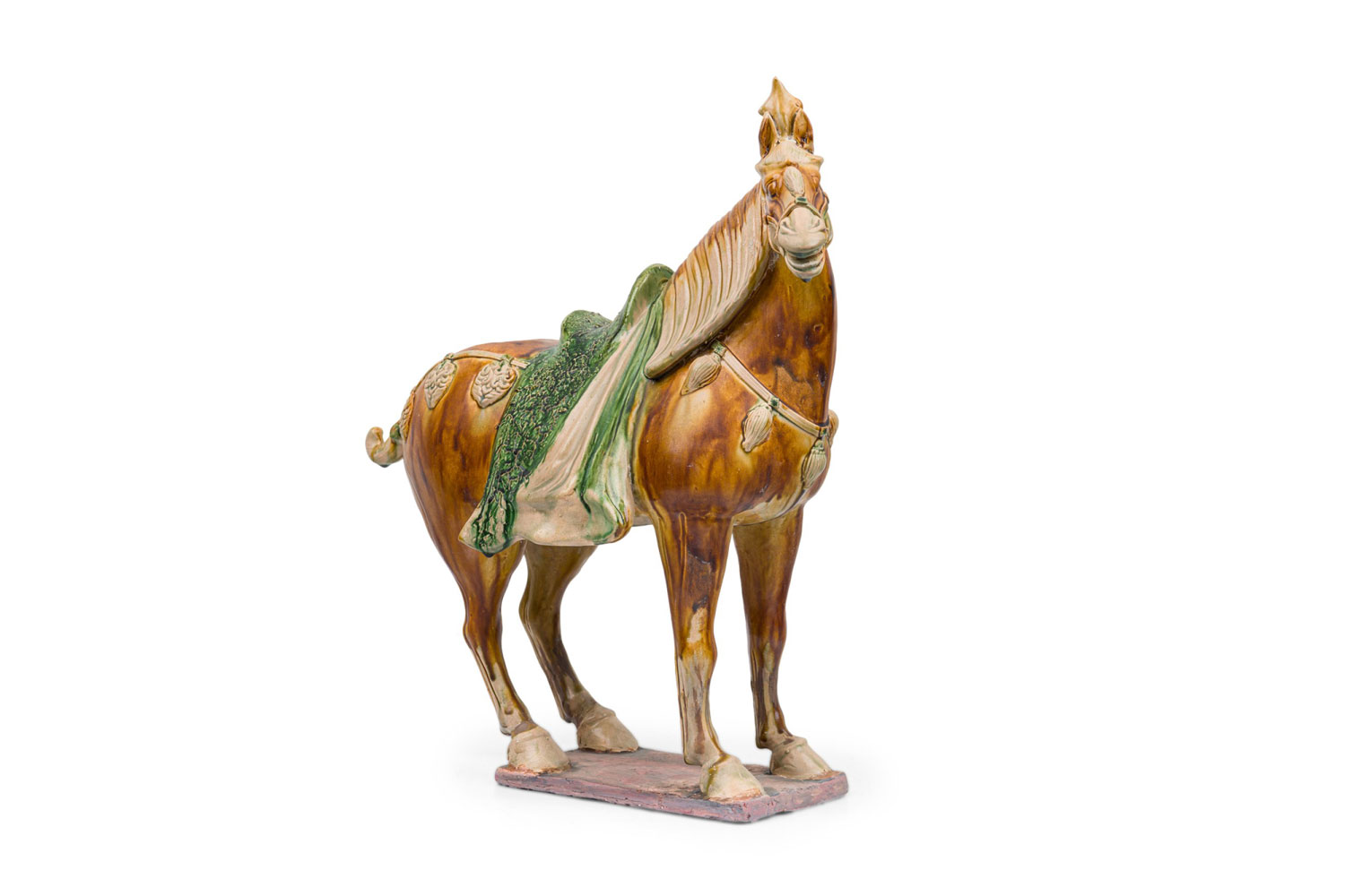 Antique Chinese Tang Dynasty-style terra cotta figure of a horse commonly used as a tomb figure for wealthy burials in the 7-8th centuries, and crafted with traditional tri-color glaze, or Sancai, utilizing brown, green and off-white.
