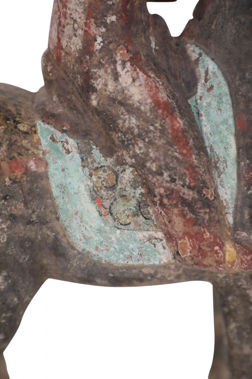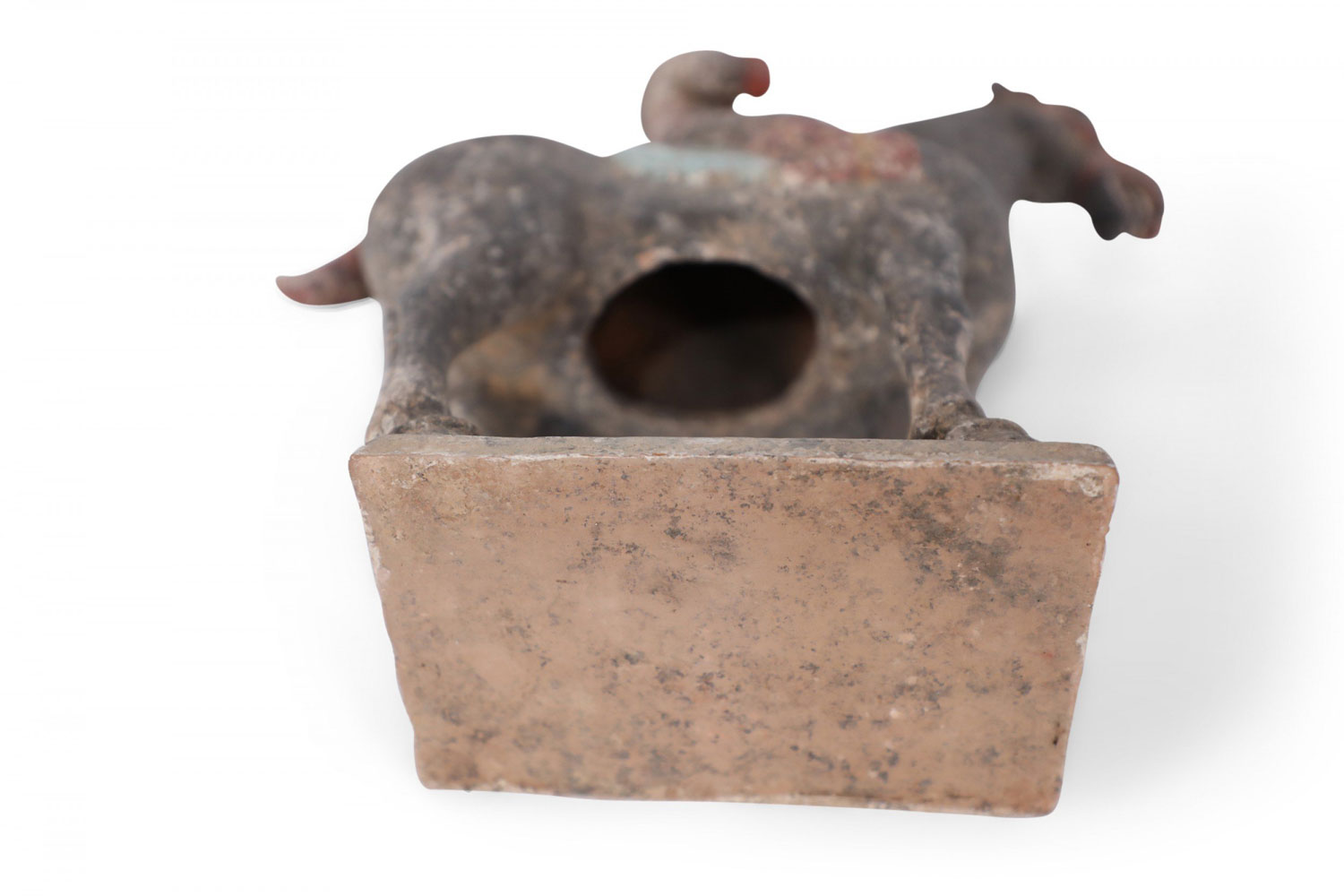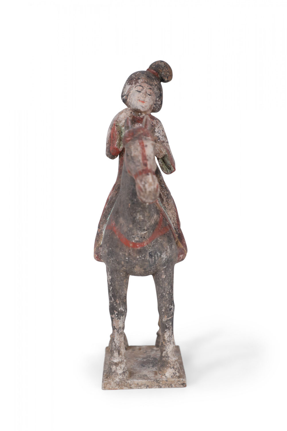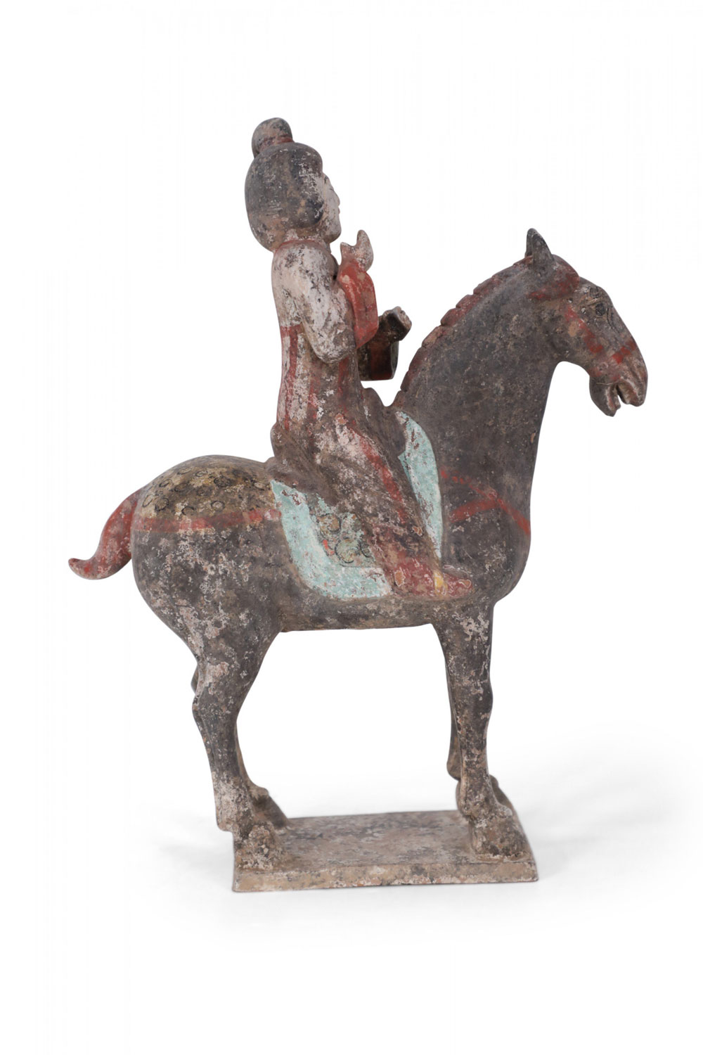 Antique Chinese Tang Dynasty-style terra cotta tomb figure of a woman dressed in gray and red robes sitting atop a blue and green saddle, on a horse that is standing on a square base (Companion Piece: NWL2557)..