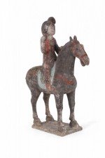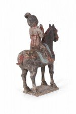 Antique Chinese Tang Dynasty-style terra cotta tomb figure of a woman dressed in gray and red robes sitting atop a blue and green saddle, on a horse that is standing on a square base (Companion Piece: NWL2557).