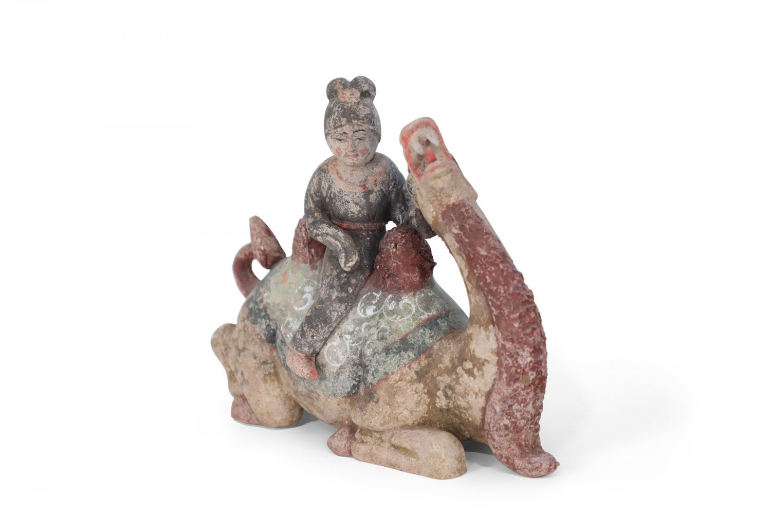 Antique Chinese Tang Dynasty-style terracotta tomb figure of a woman in a gray dress sitting on a kneeling Bactrian camel with its head tilted back and mouth open to the sky. (Companion Piece: NWL2553)..