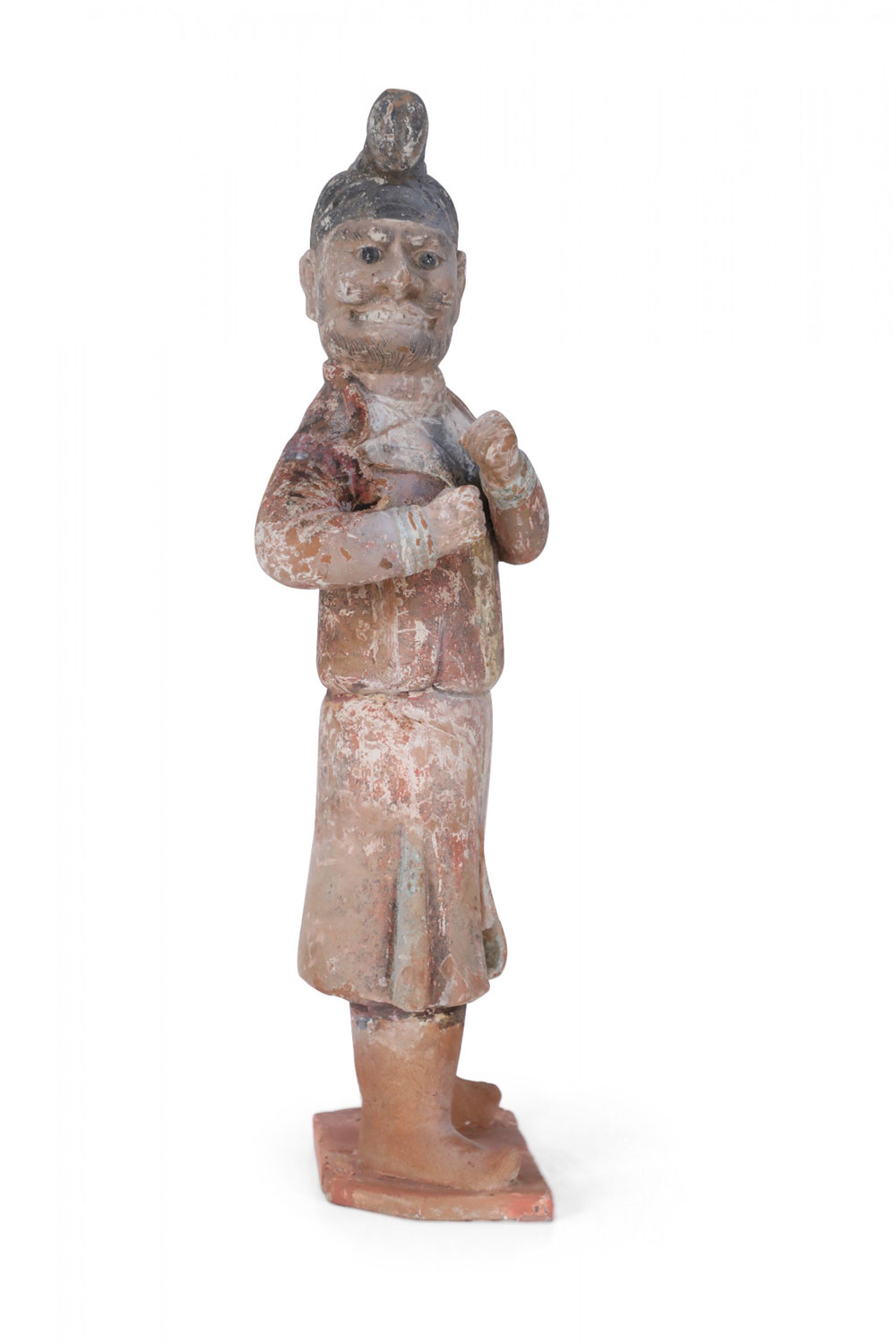 Antique Chinese Tang Dynasty-style terracotta tomb figure of a man with his fists raised, wearing a hat or a head wrap and boots, and standing on a faceted rust-colored base.