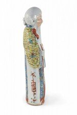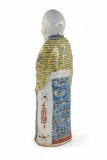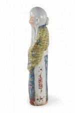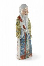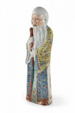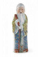 Chinese porcelain figurine with a long beard and raised forehead, clad in yellow and blue robes and holding a staff that symbolizes health and longevity in Taoist Han traditions..