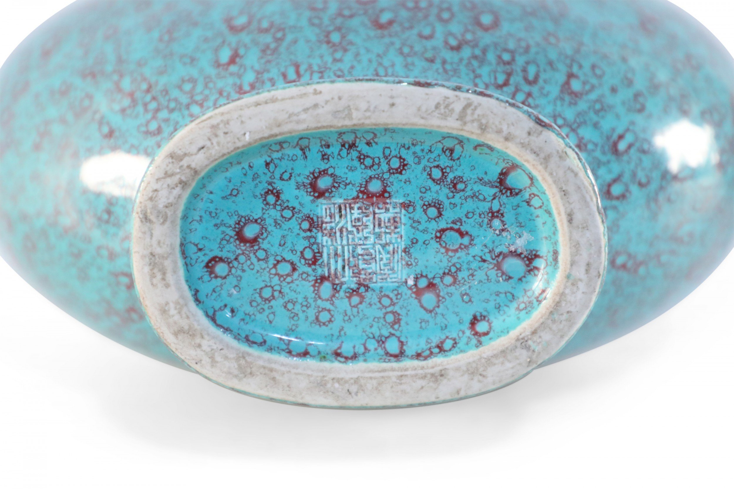 Antique Chinese (Late 19th Century) teal moon flask porcelain vase decorated with a red crackle overlay and topped with two stepped handles (mark on bottom, see photos).