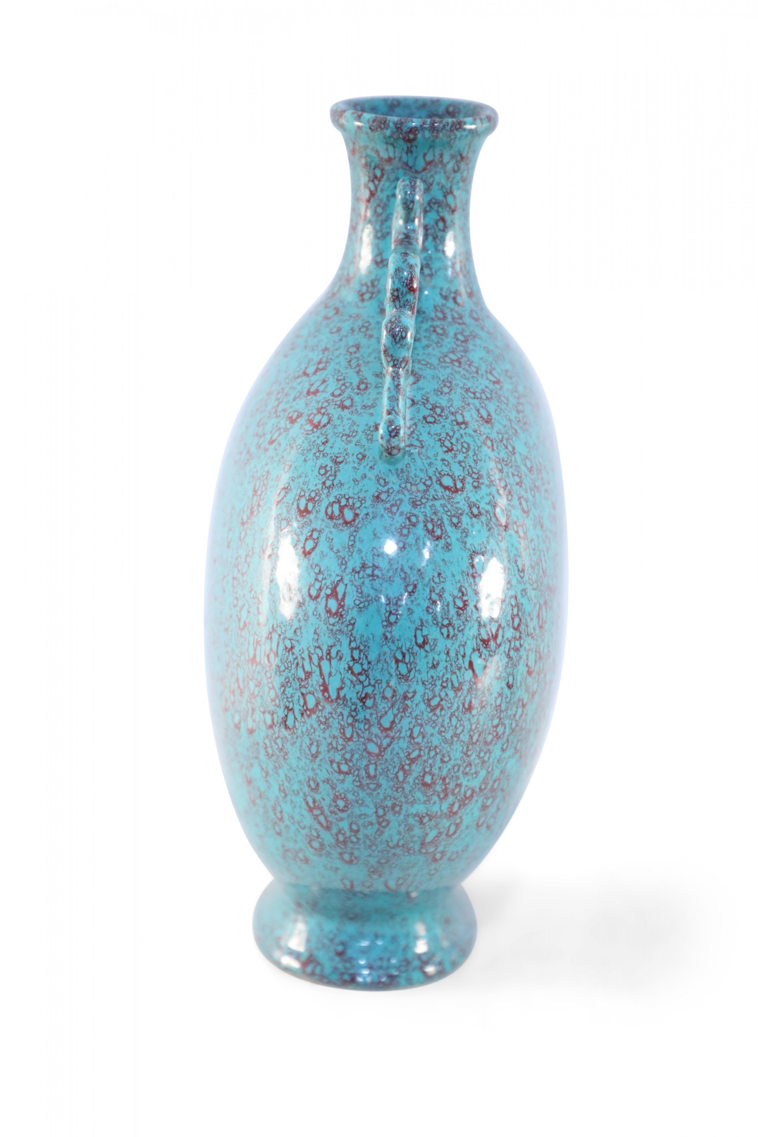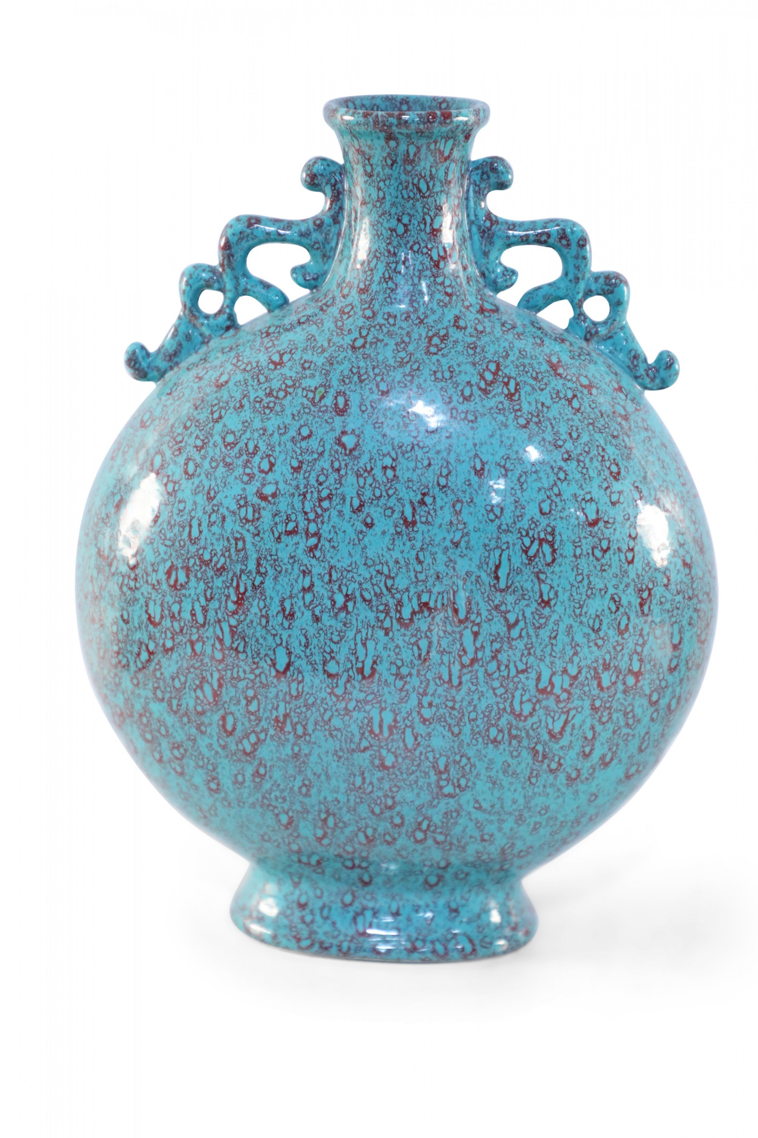 Antique Chinese (Late 19th Century) teal moon flask porcelain vase decorated with a red crackle overlay and topped with two stepped handles (mark on bottom, see photos)..