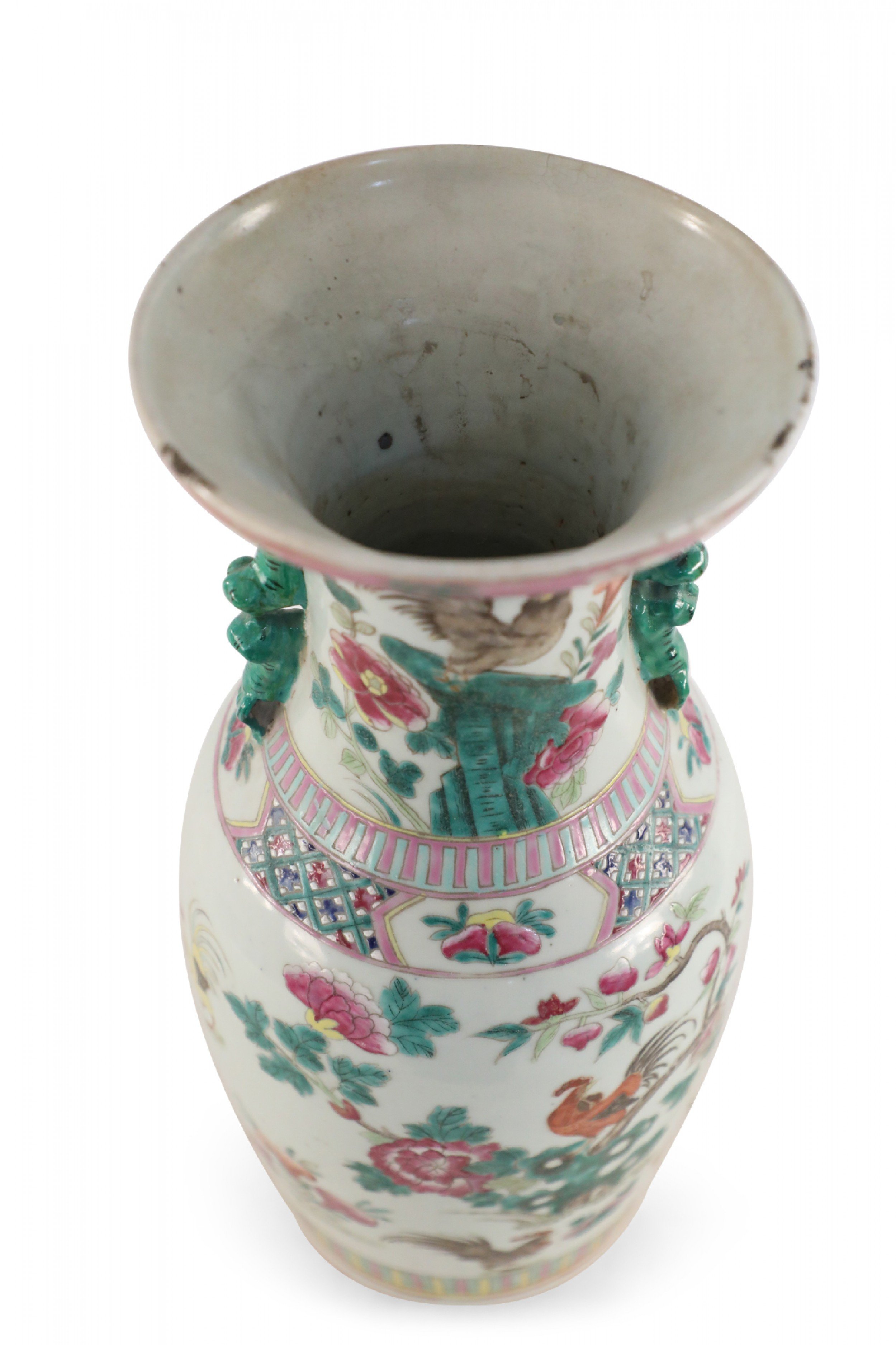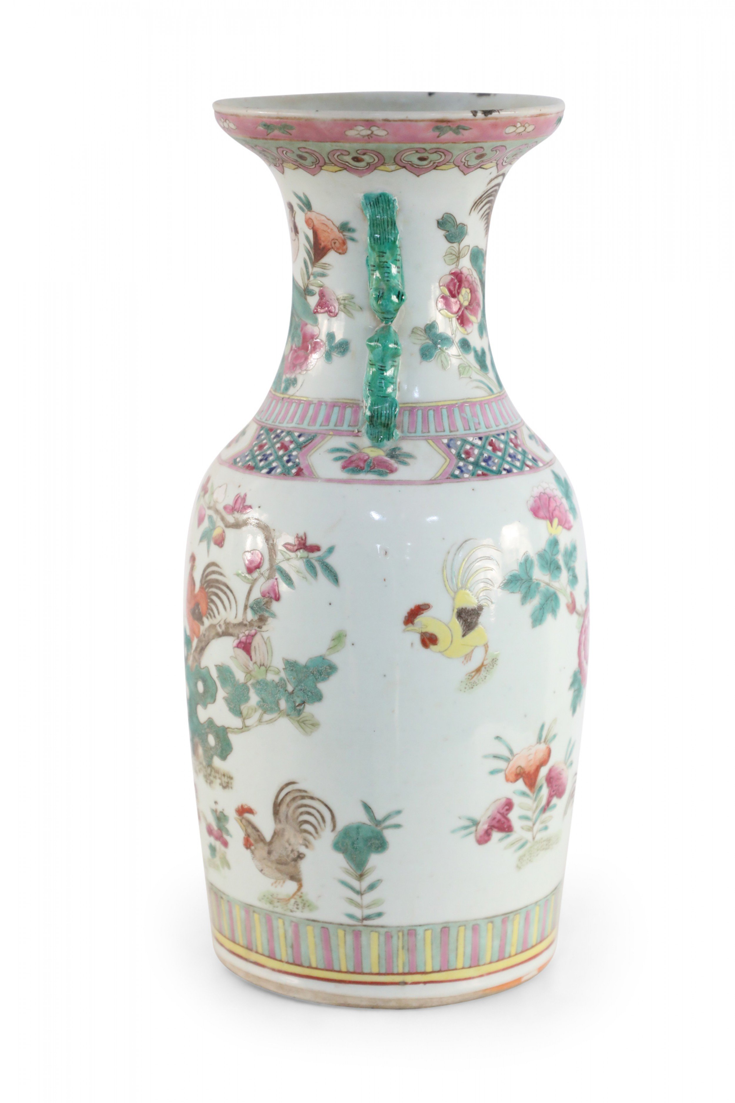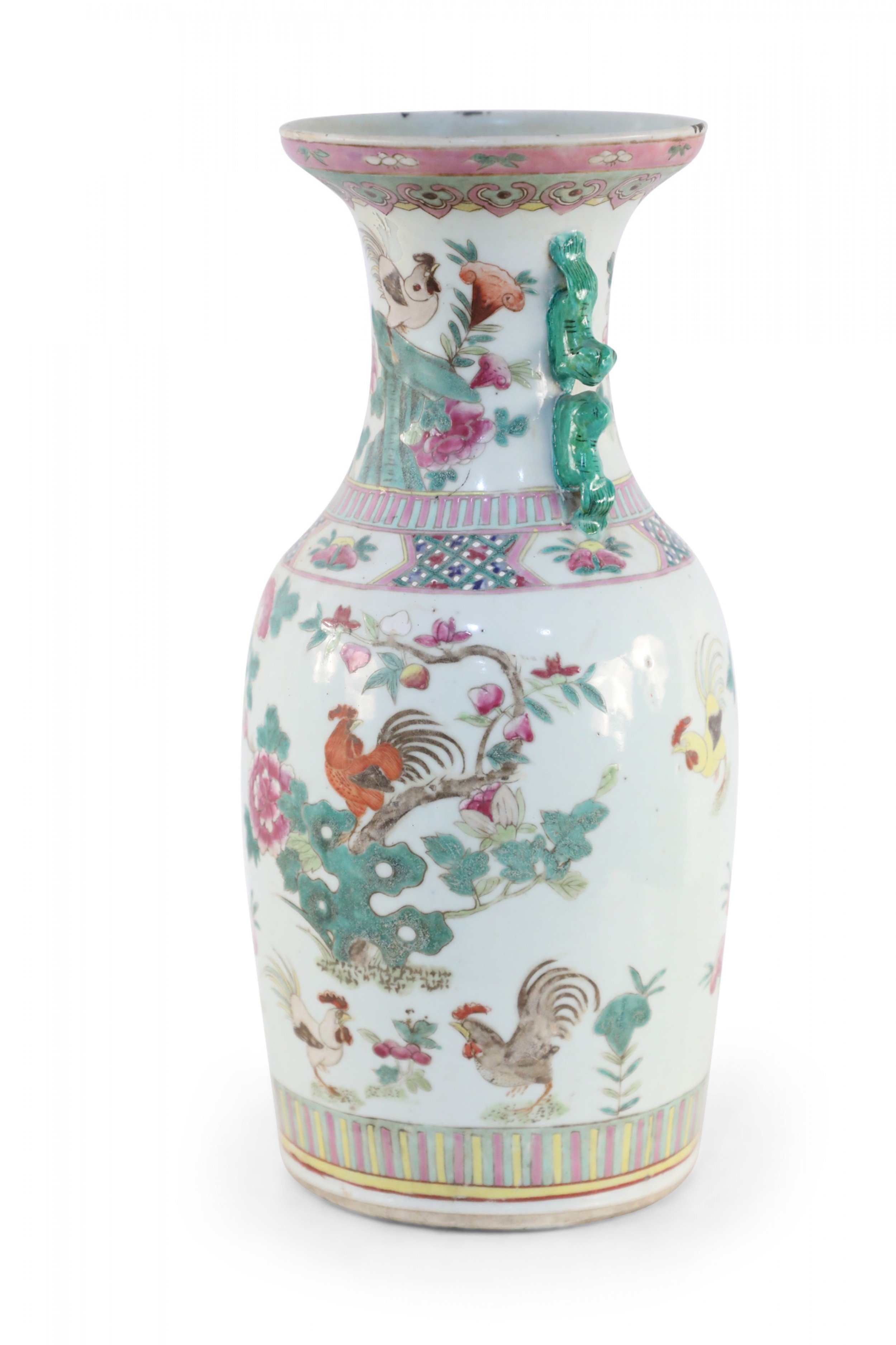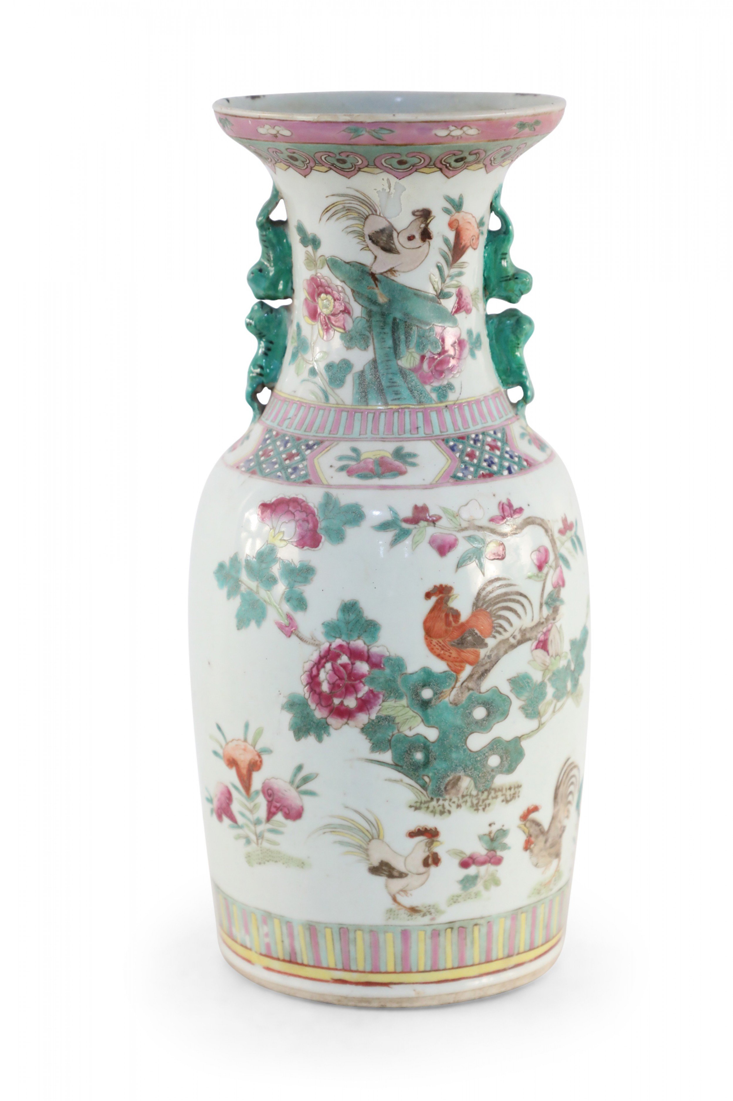 Chinese White, Green, and Pink Floral and Rooster Design Porcelain Urn