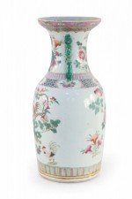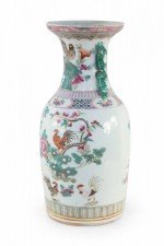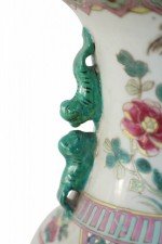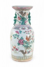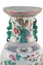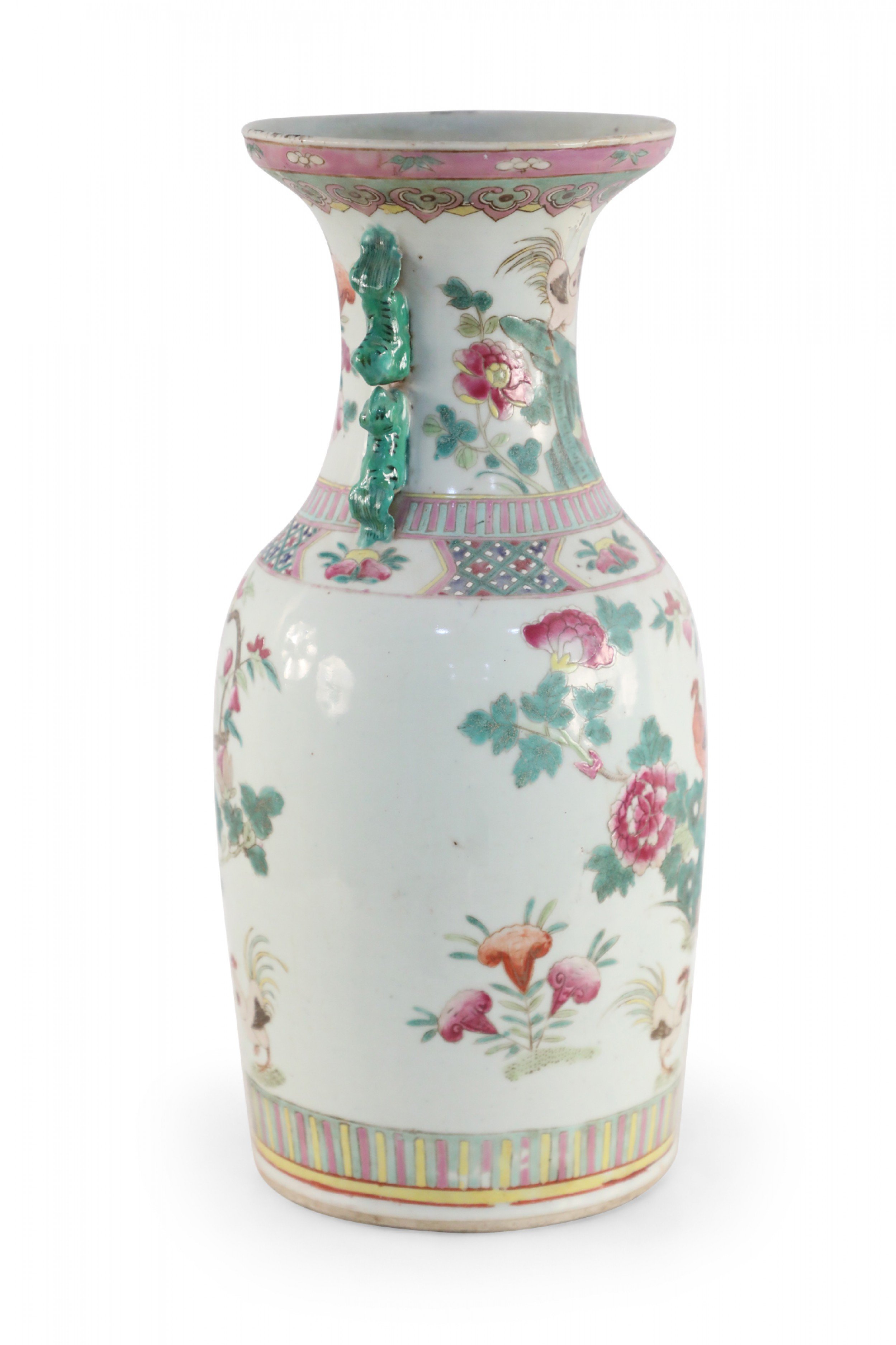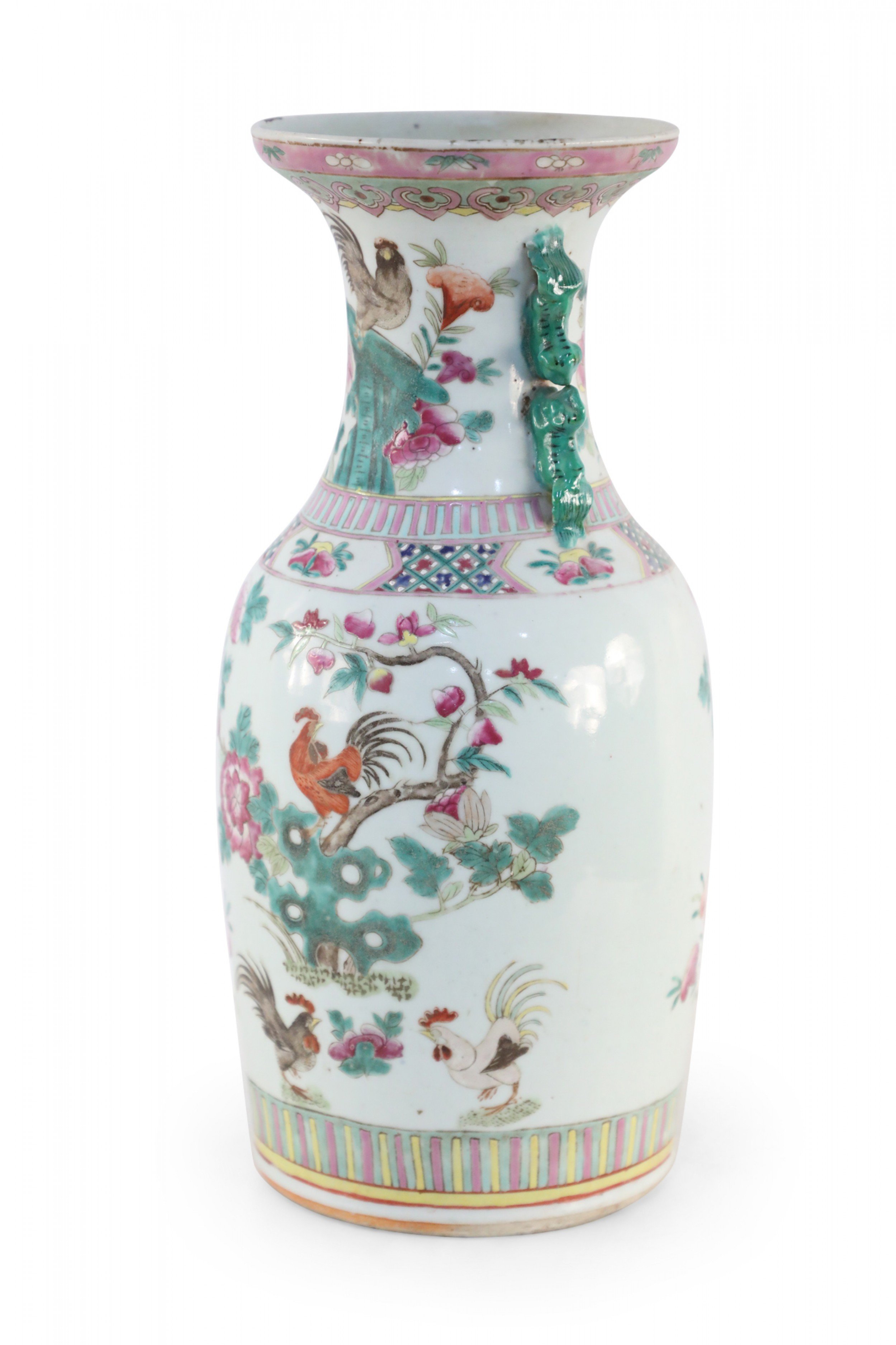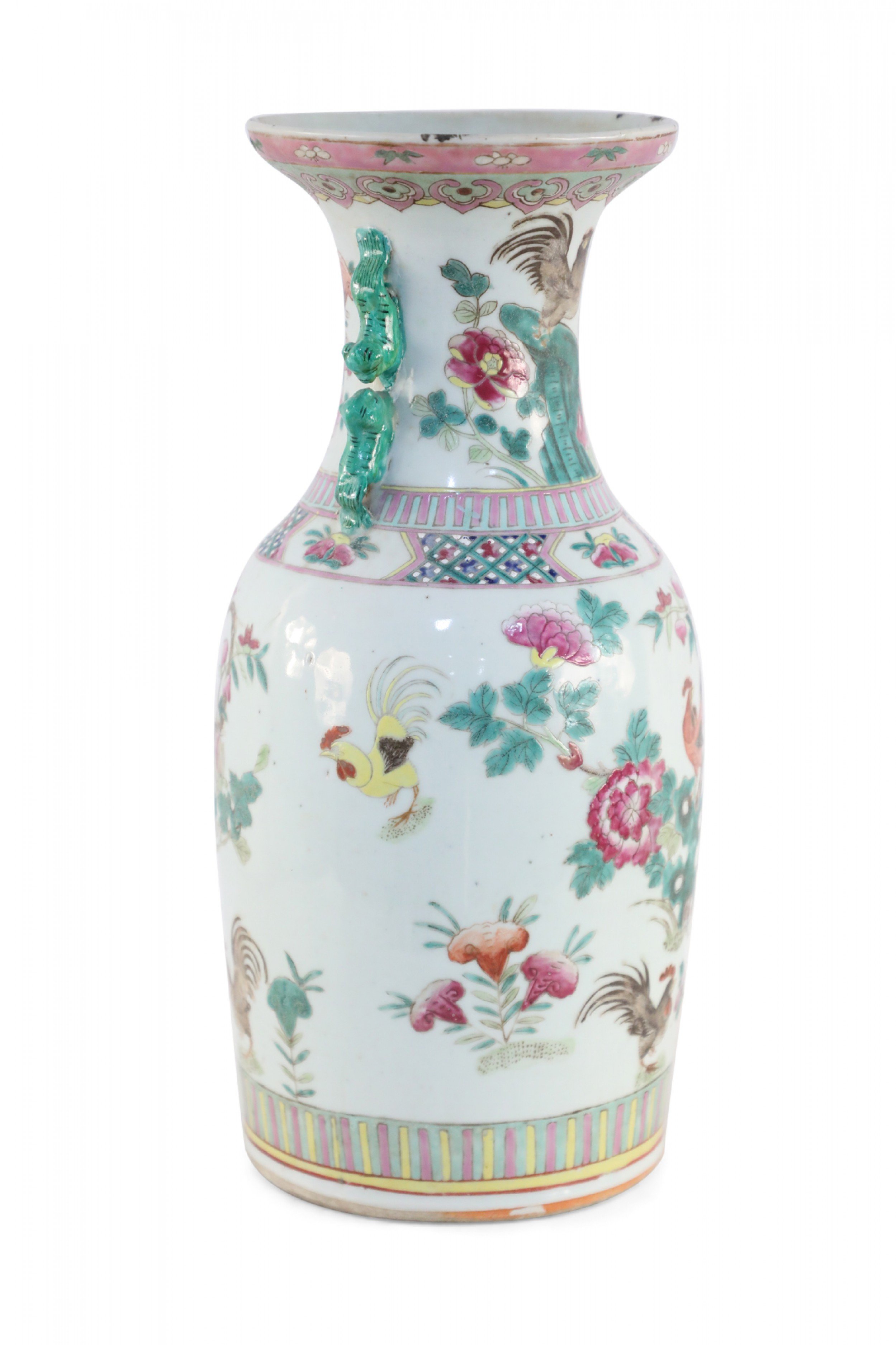 Chinese White, Green, and Pink Floral and Rooster Design Porcelain Urn