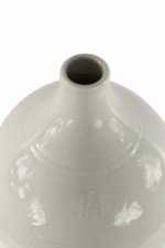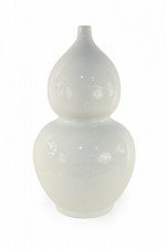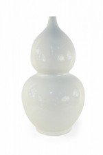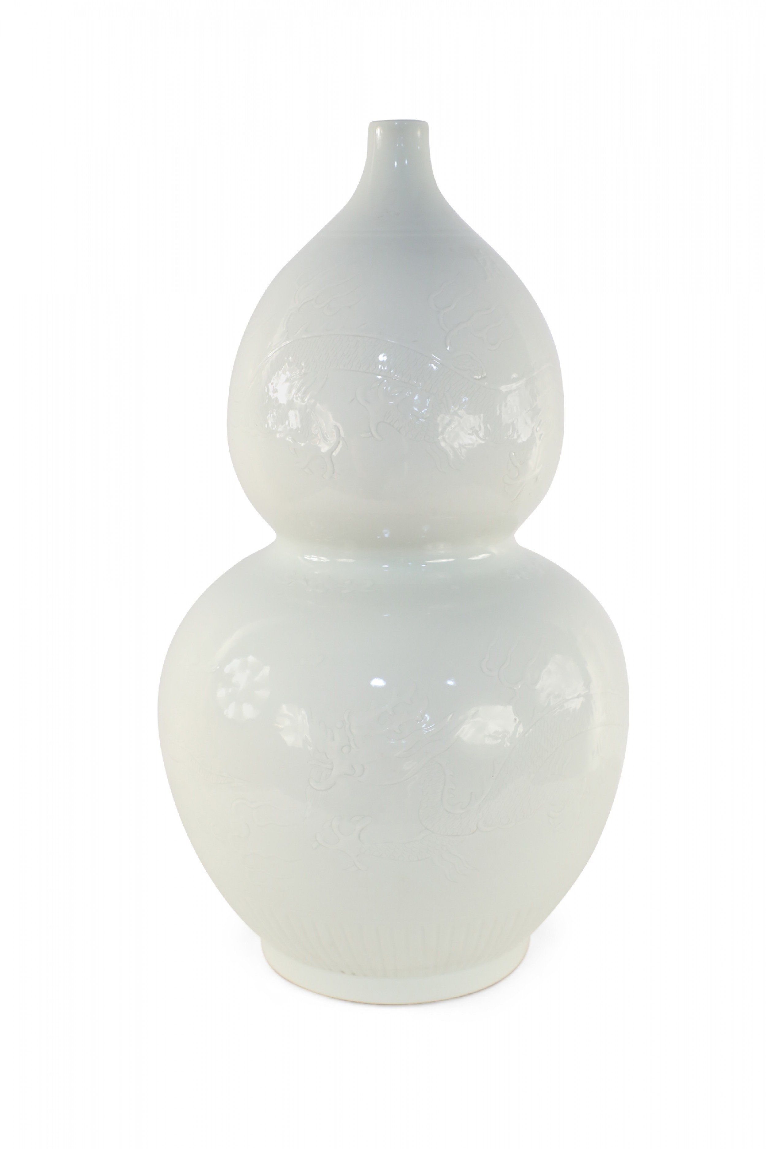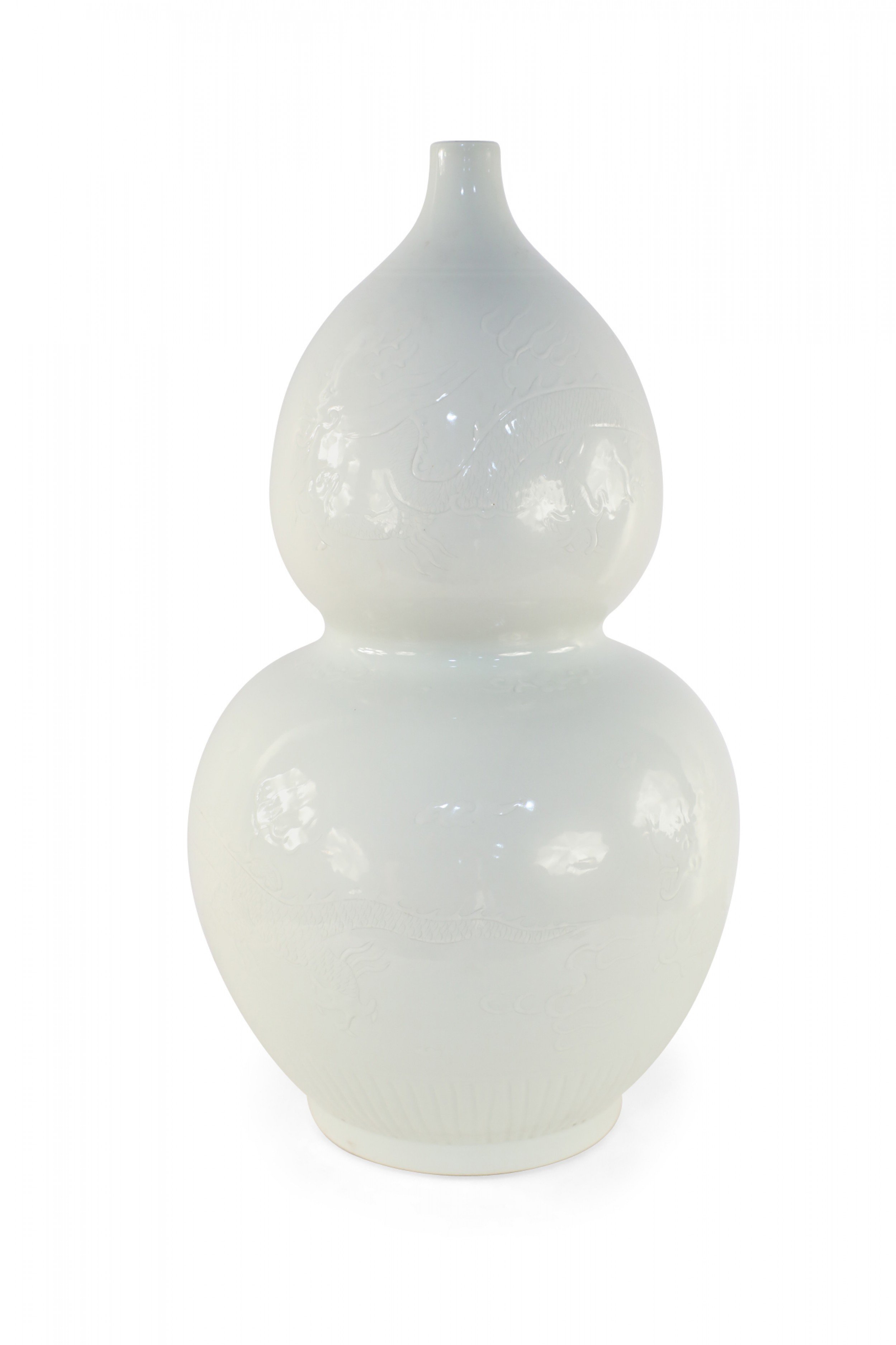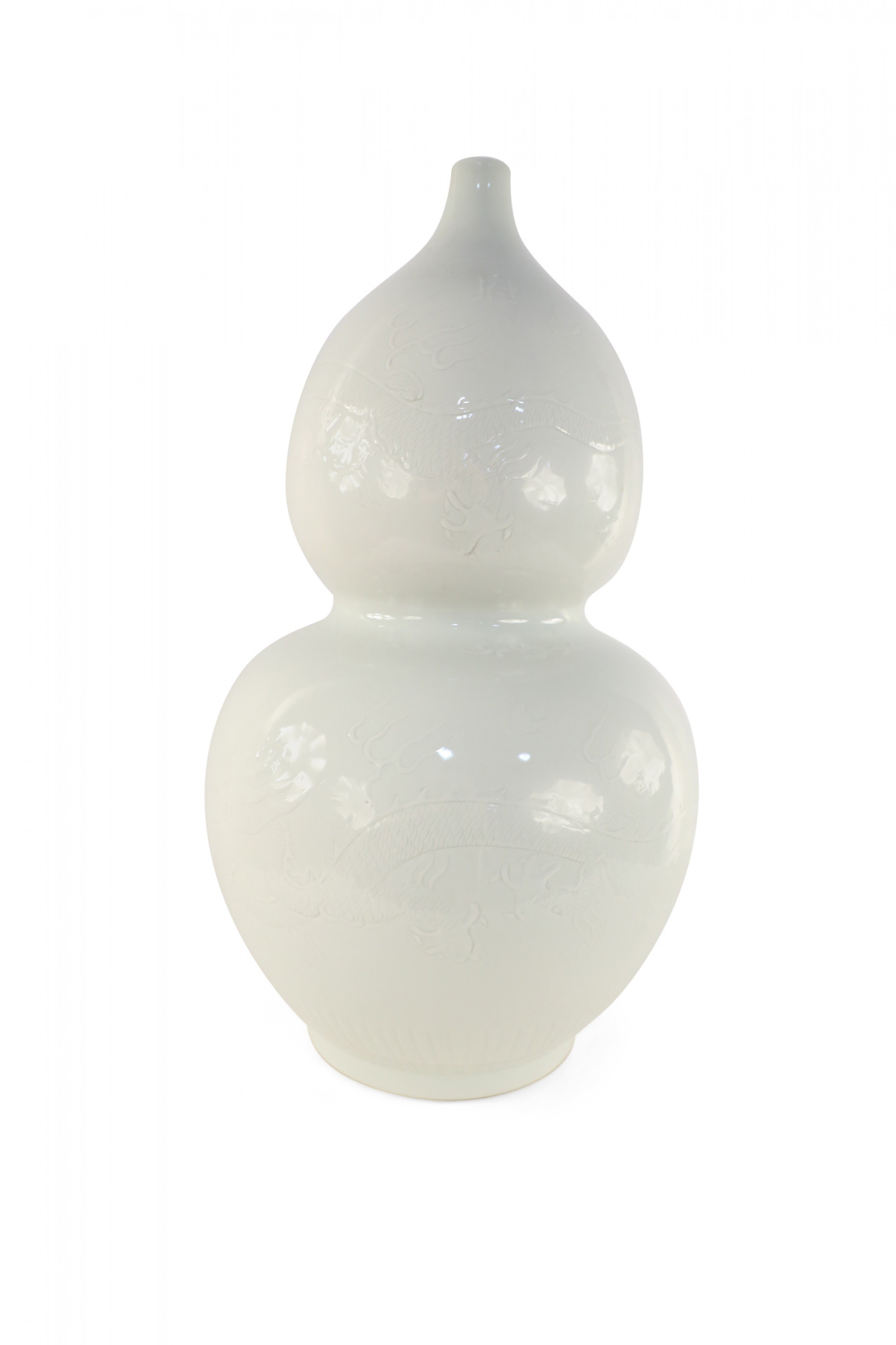 Chinese white, glazed porcelain double gourd bottle thought to bring peace, longevity and happiness to its owner, with a faint etched dragon motif.