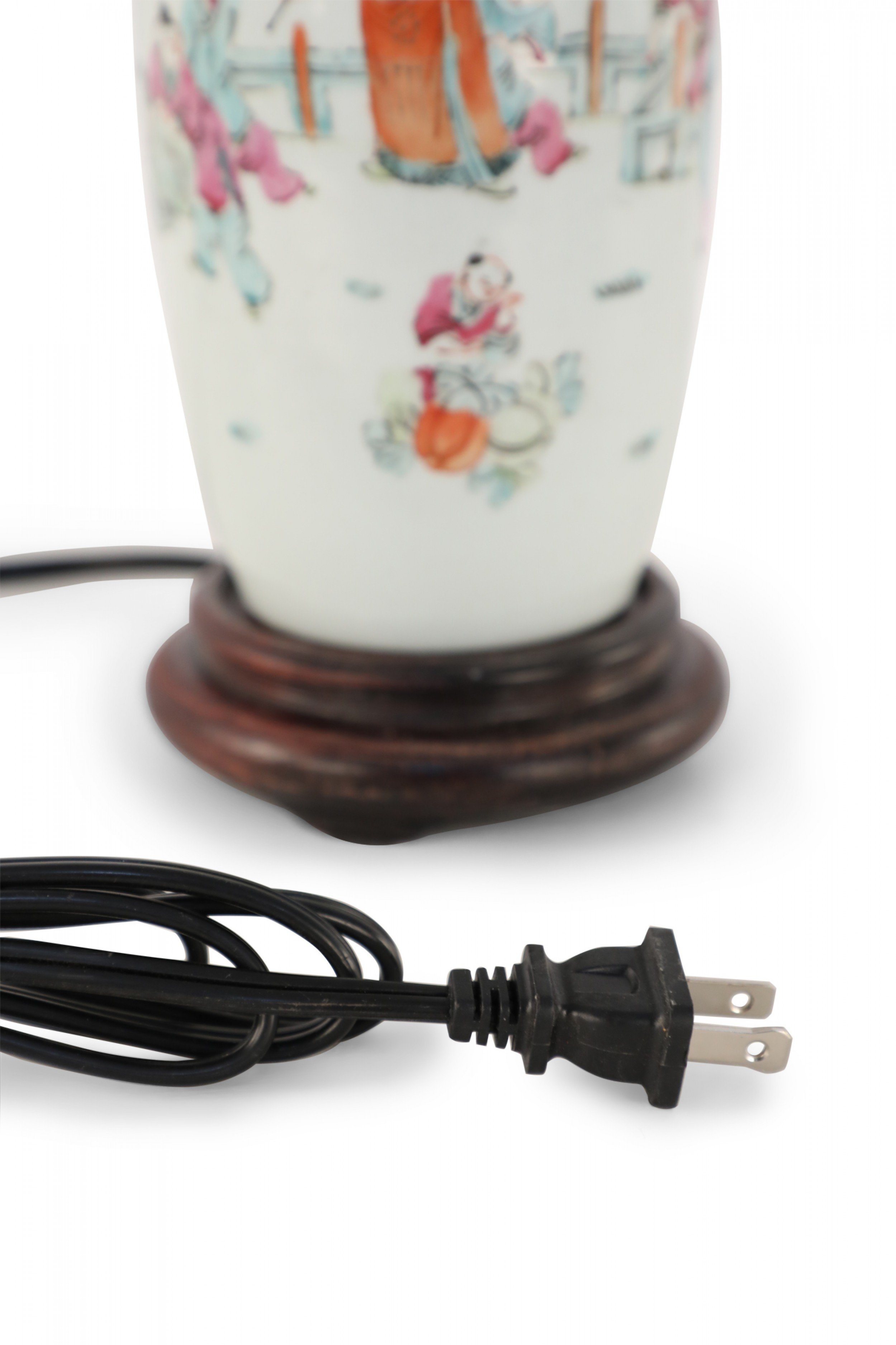 Antique Chinese (Early 20th Century) table lamp made from a white porcelain urn painted with a scene of children playing in orange, pink, and red, mounted on a brown wooden base and fitted with brass hardware..