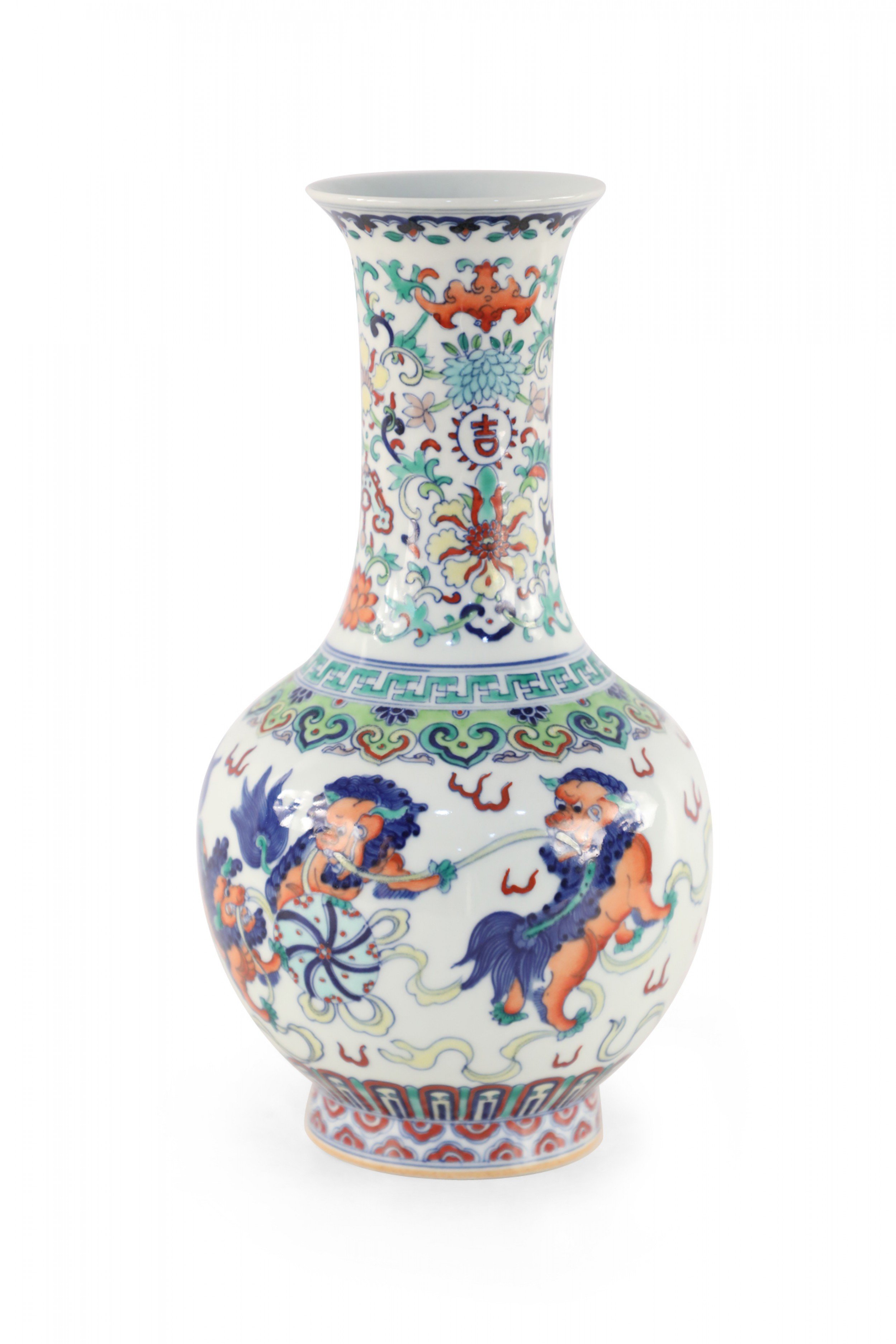 Chinese (late 19th Century) white, globular porcelain vase with colorful kylin beasts, symbolizing good luck, amid geometric and floral designs..