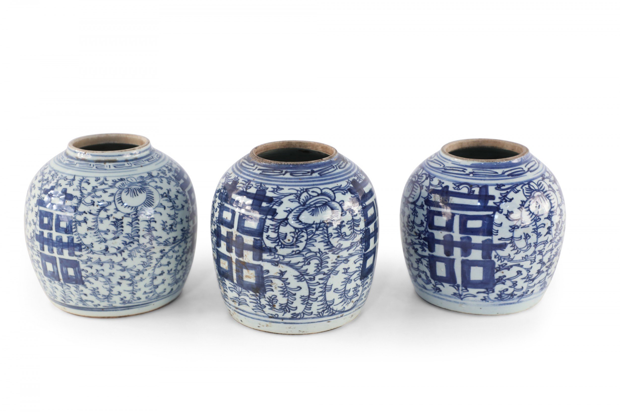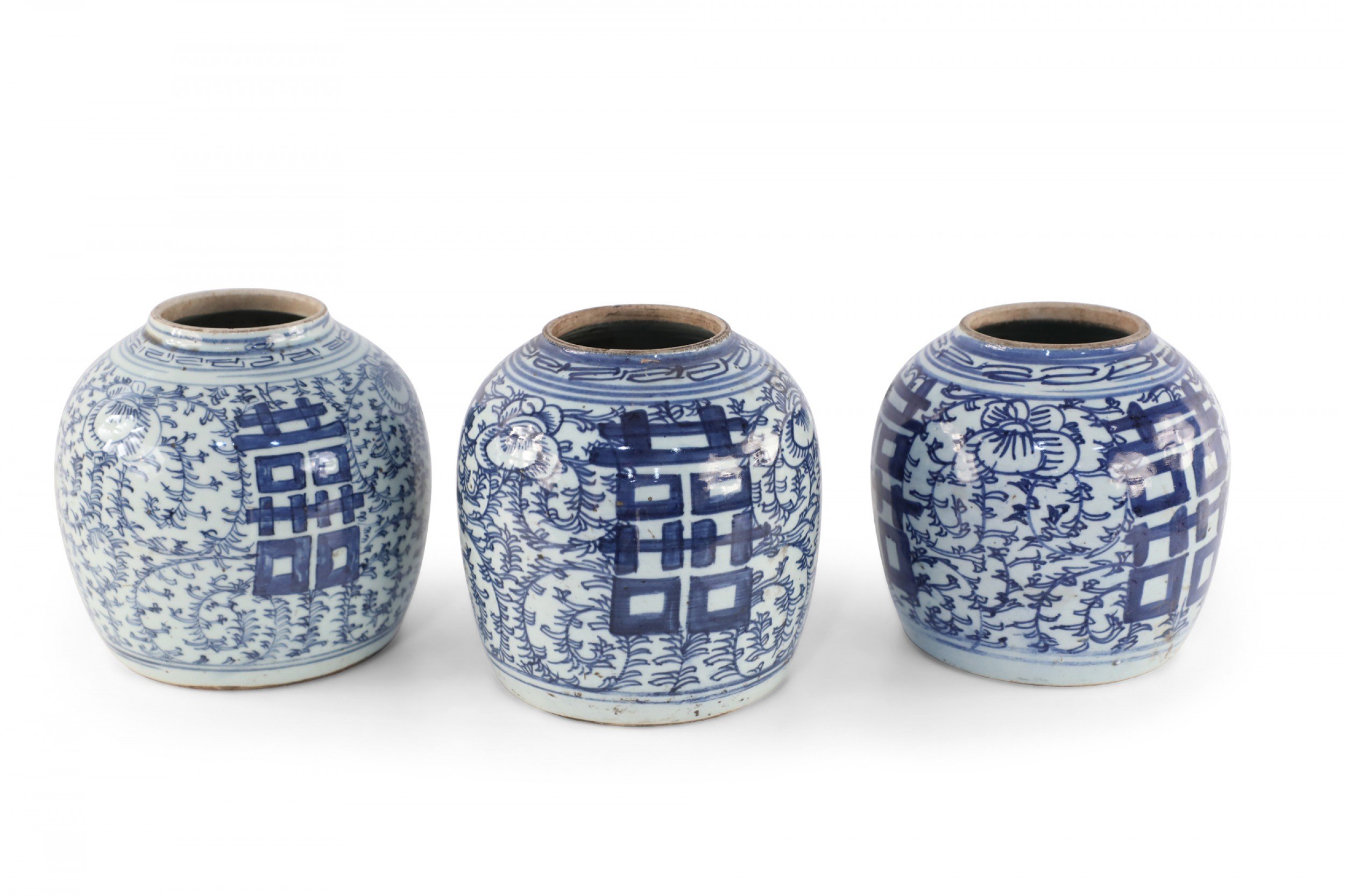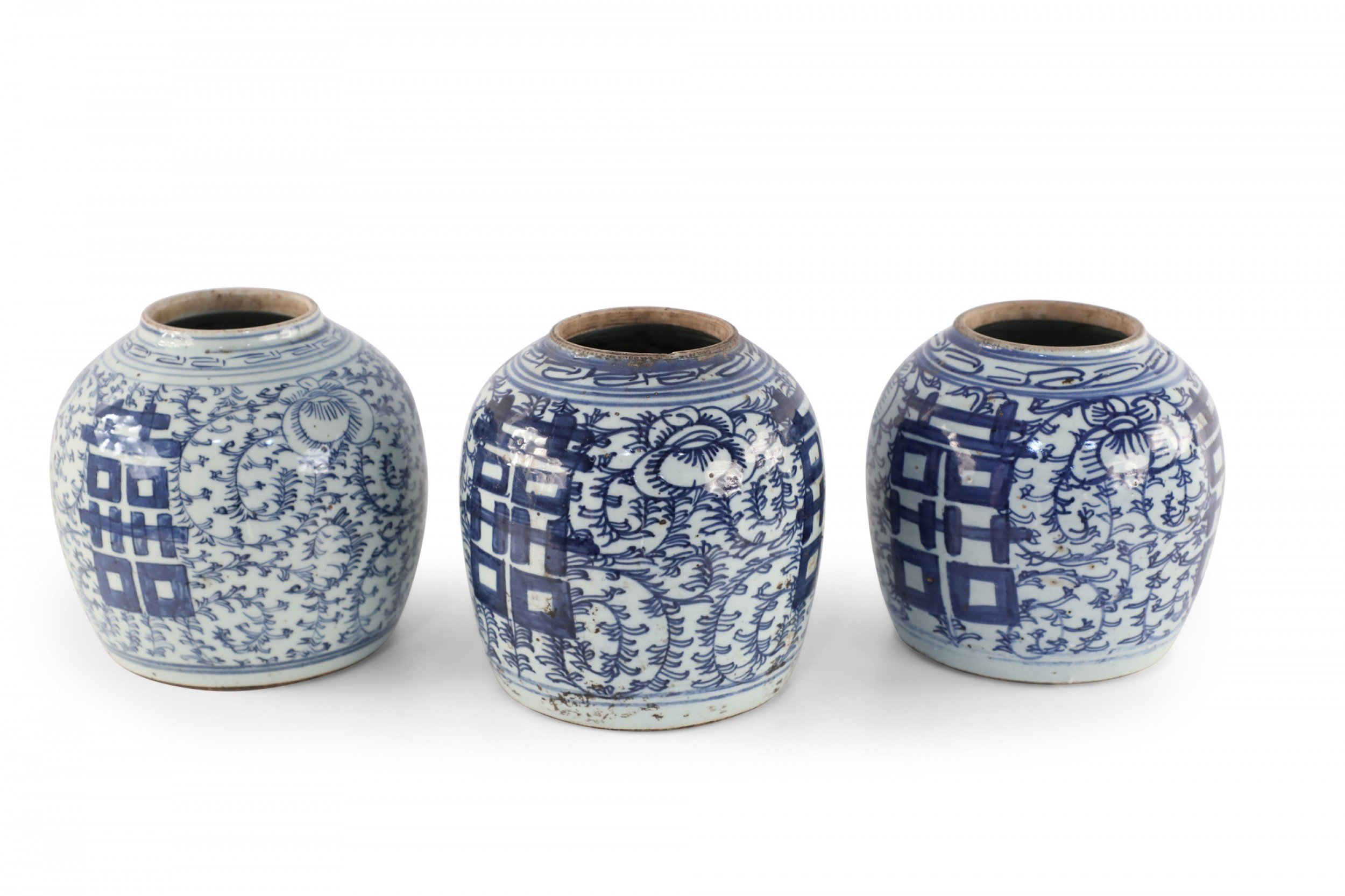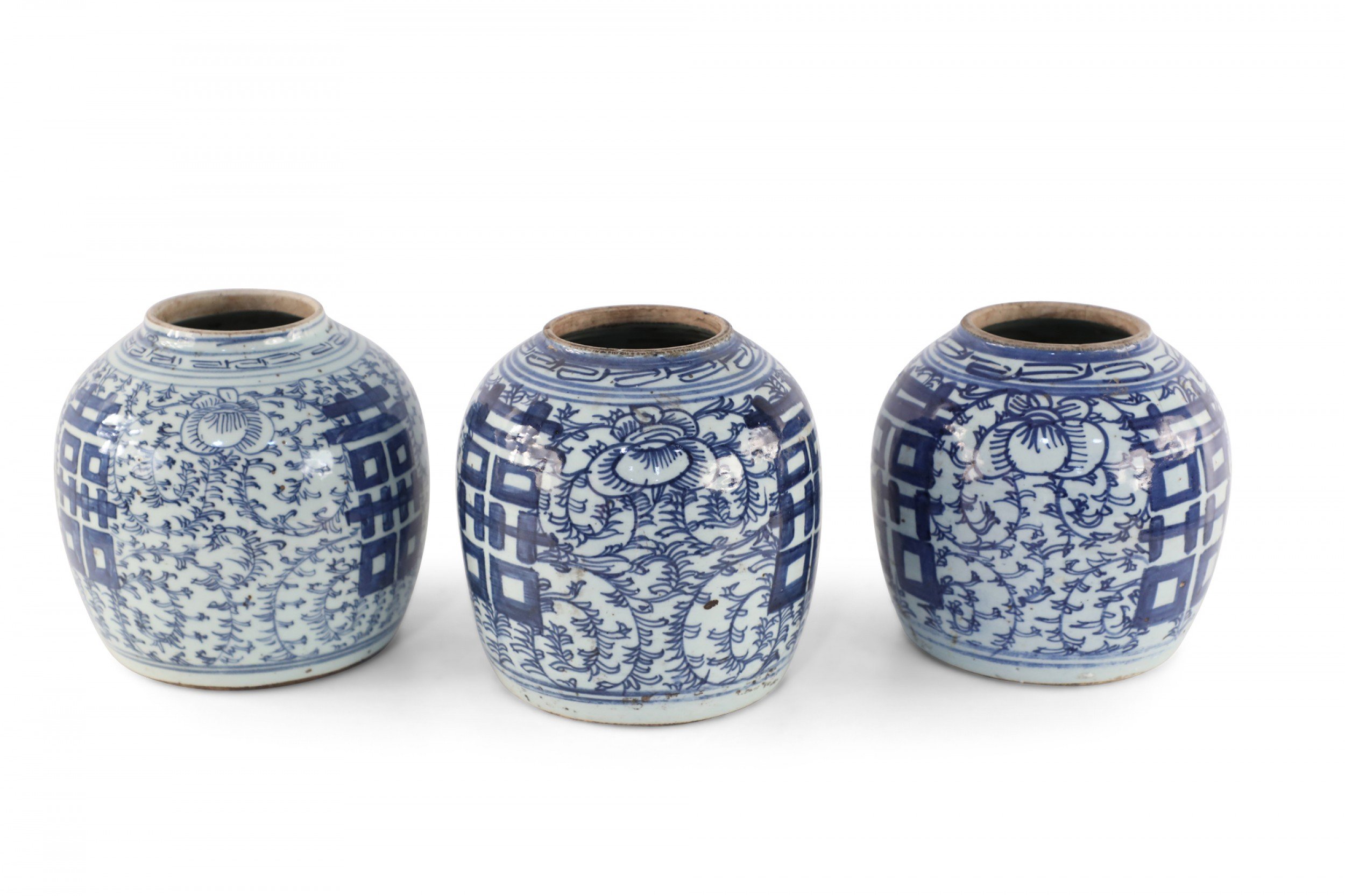 3 Antique Chinese (Early 20th Century) similar porcelain ginger jars with blue floral designs around bold, centered characters and geometric bands leading to unglazed rims (jars vary slightly in size, pattern, and color) (PRICED EACH)