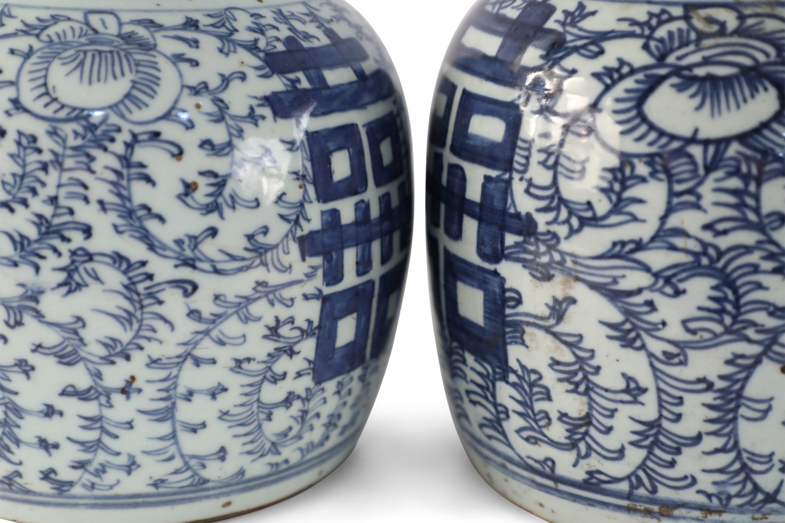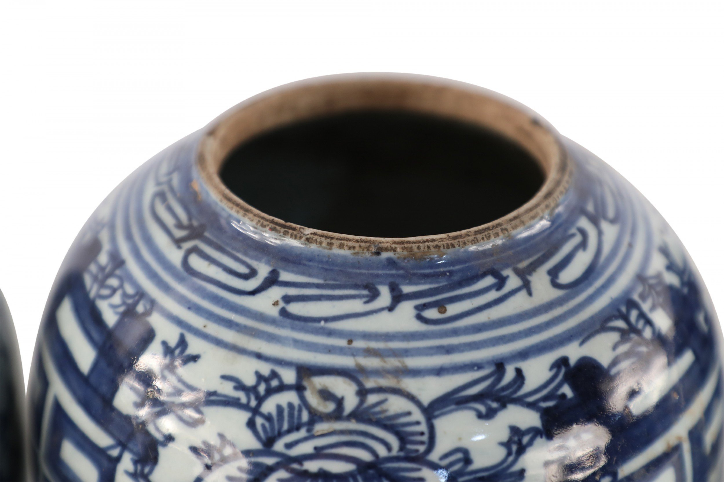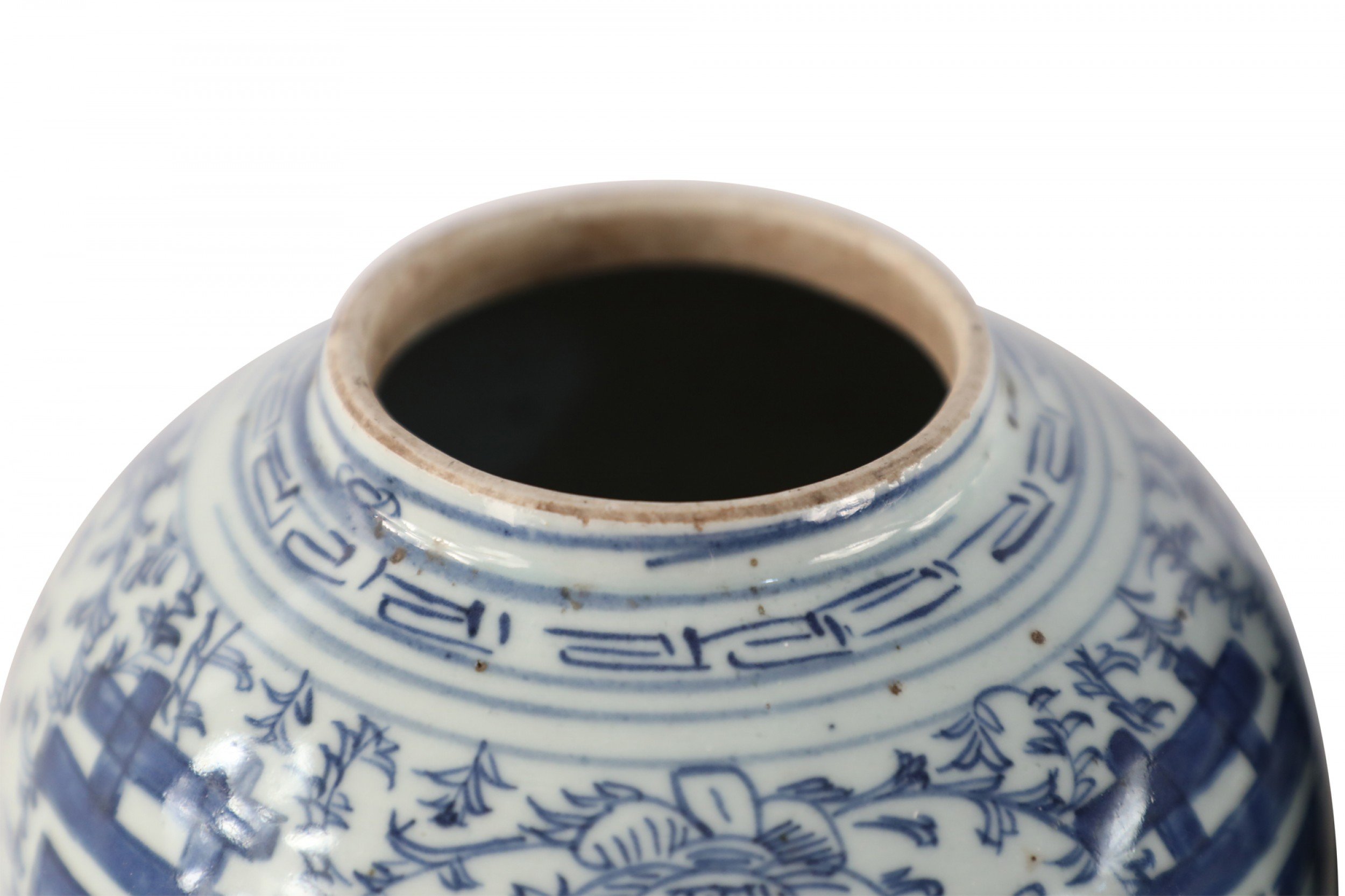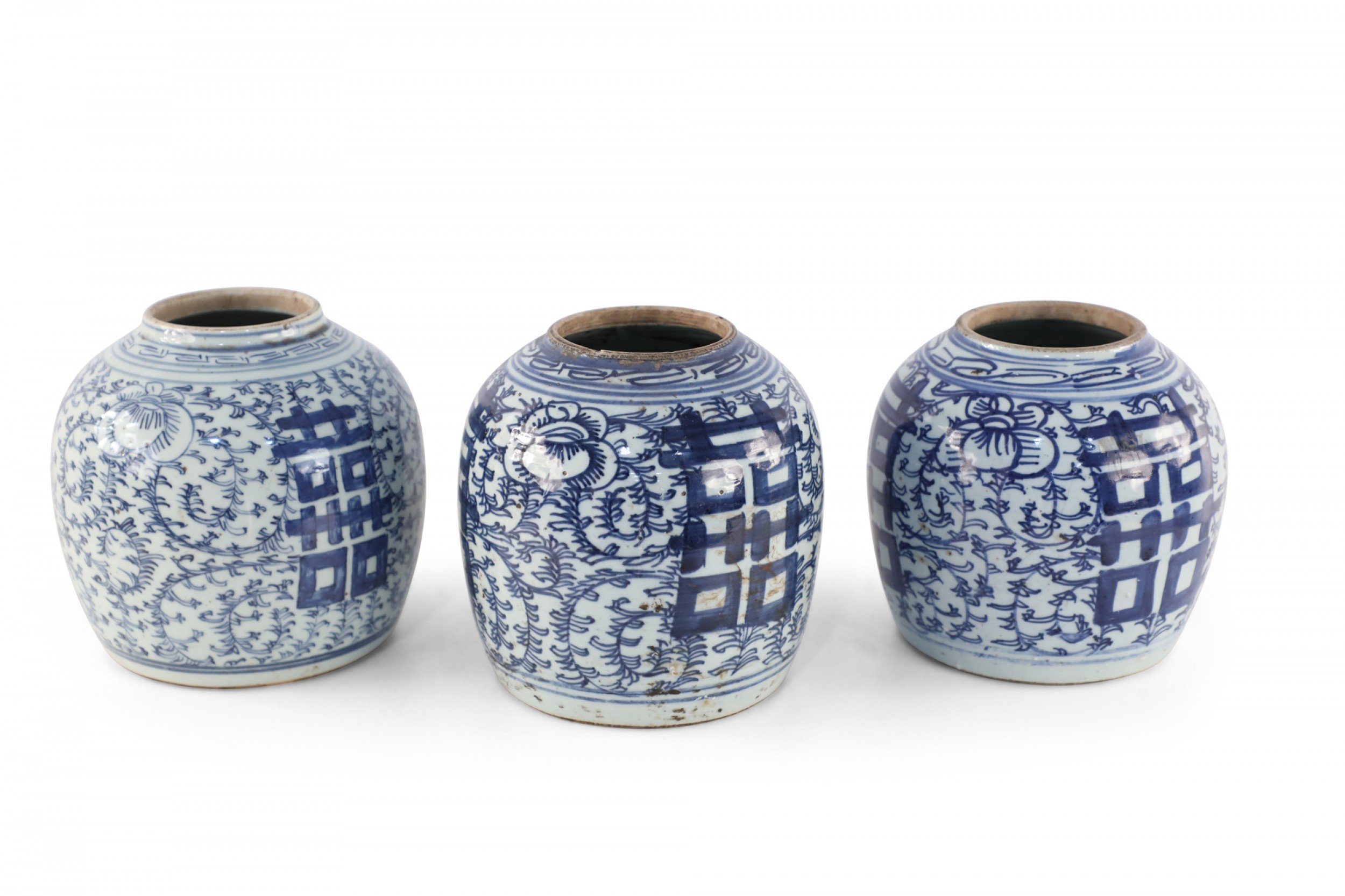 3 Antique Chinese (Early 20th Century) similar porcelain ginger jars with blue floral designs around bold, centered characters and geometric bands leading to unglazed rims (jars vary slightly in size, pattern, and color) (PRICED EACH)