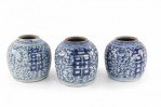 3 Antique Chinese (Early 20th Century) similar porcelain ginger jars with blue floral designs around bold, centered characters and geometric bands leading to unglazed rims (jars vary slightly in size, pattern, and color) (PRICED EACH).