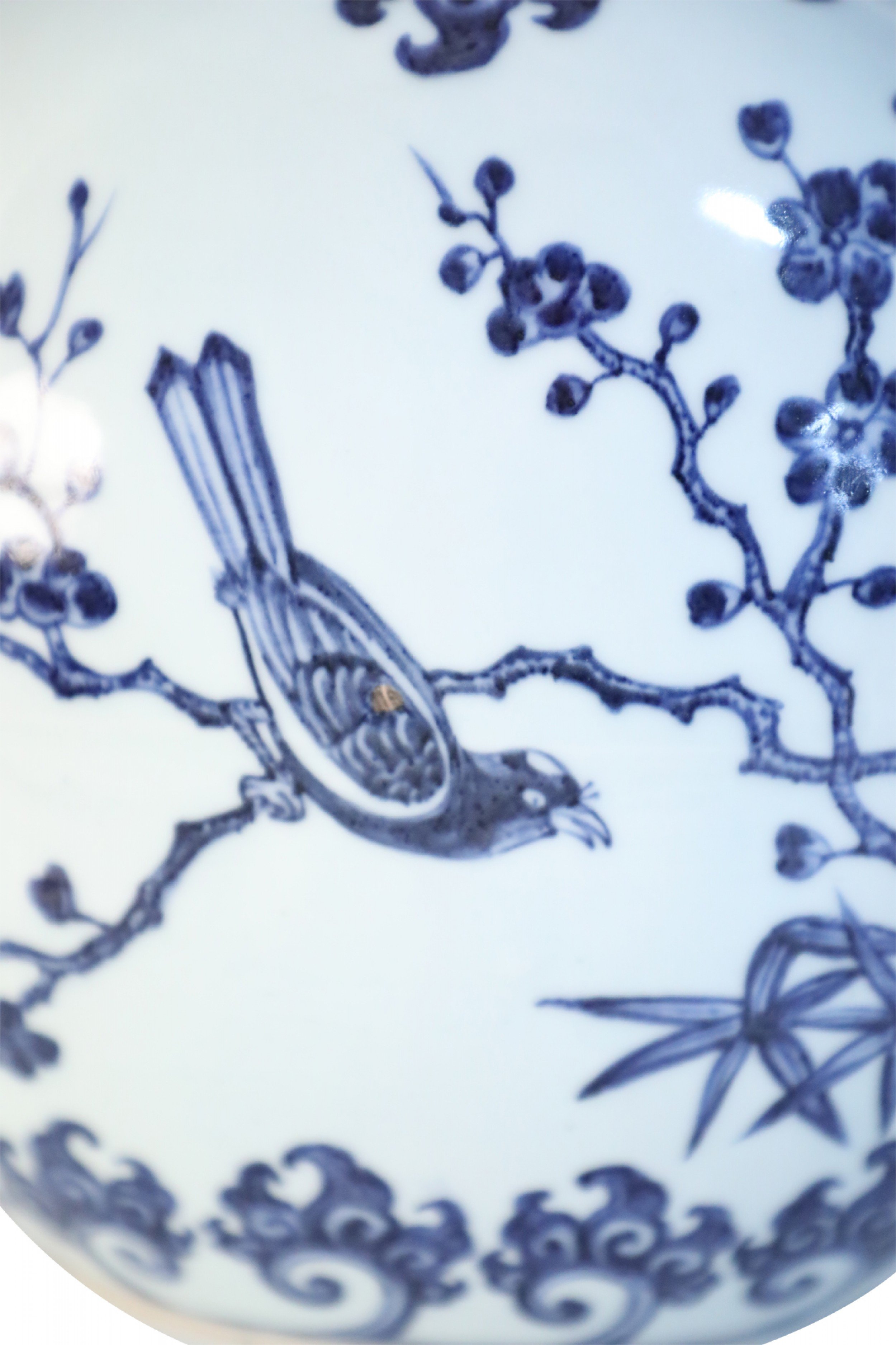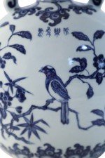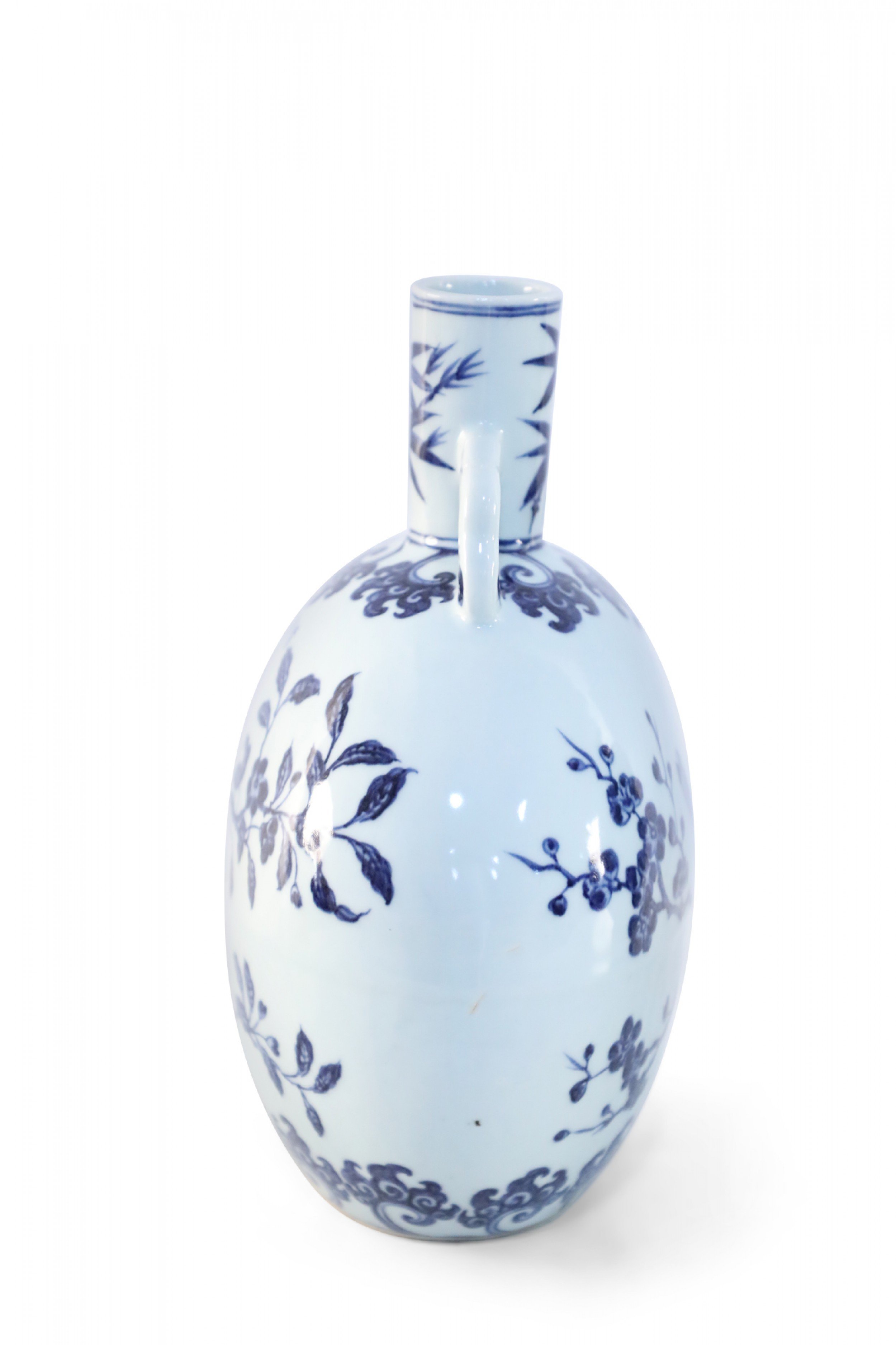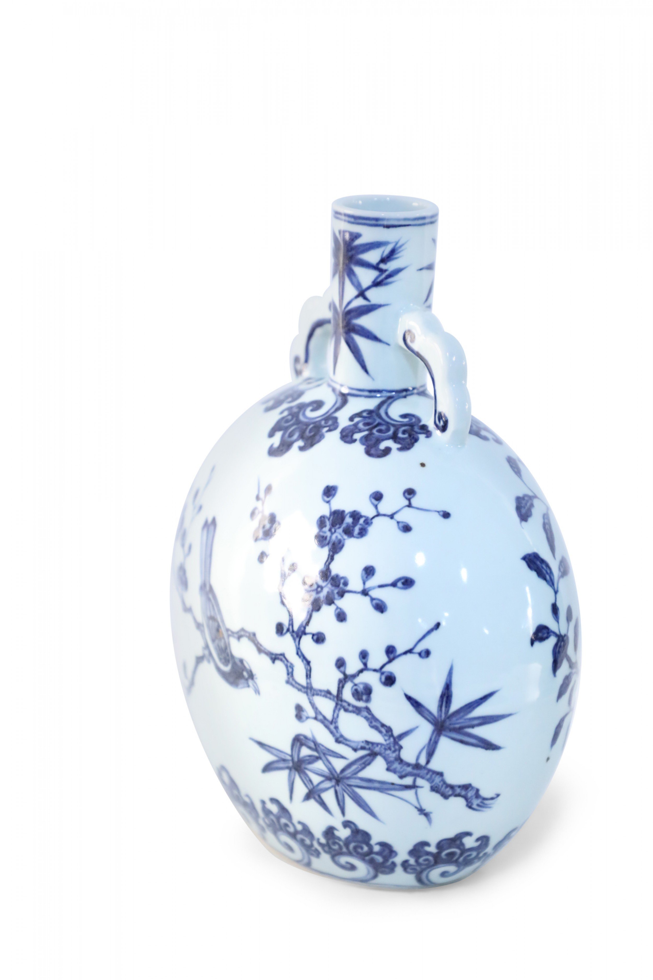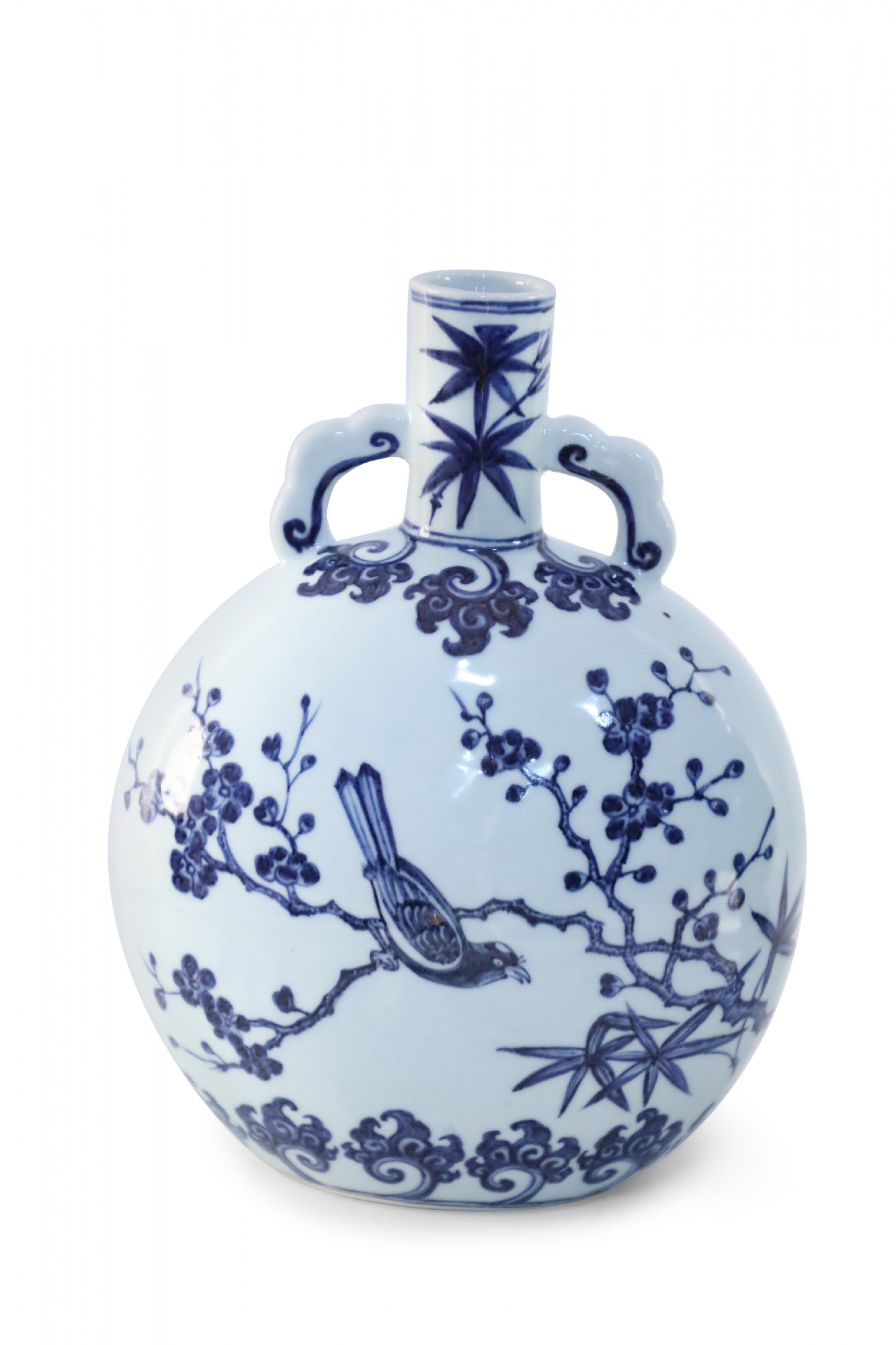 Antique Chinese (early 20th Century) white porcelain moon flask vase decorated with a bird perched on flowering cherry blossoms, and two handles.