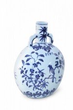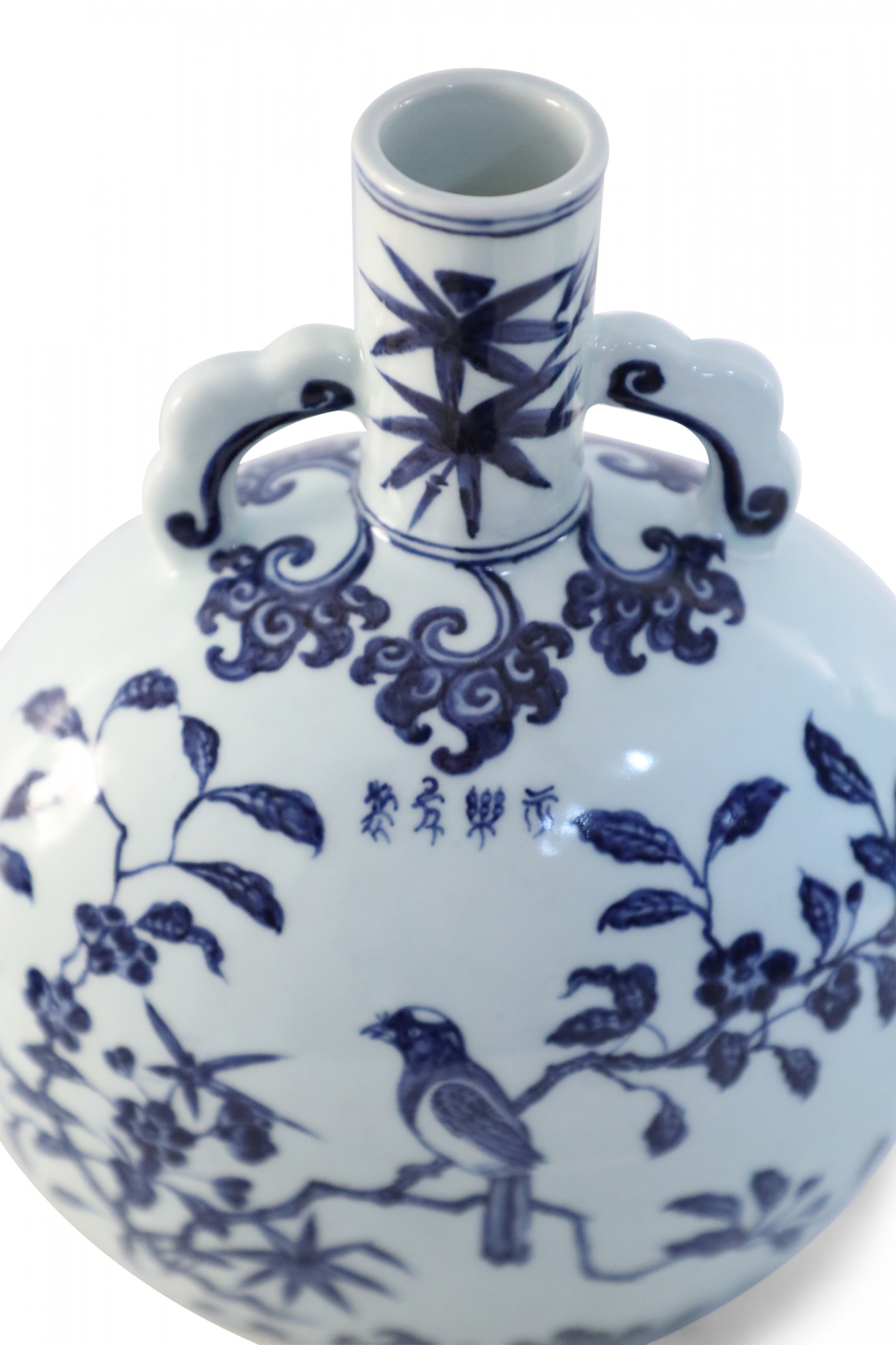 Antique Chinese (early 20th Century) white porcelain moon flask vase decorated with a bird perched on flowering cherry blossoms, and two handles..