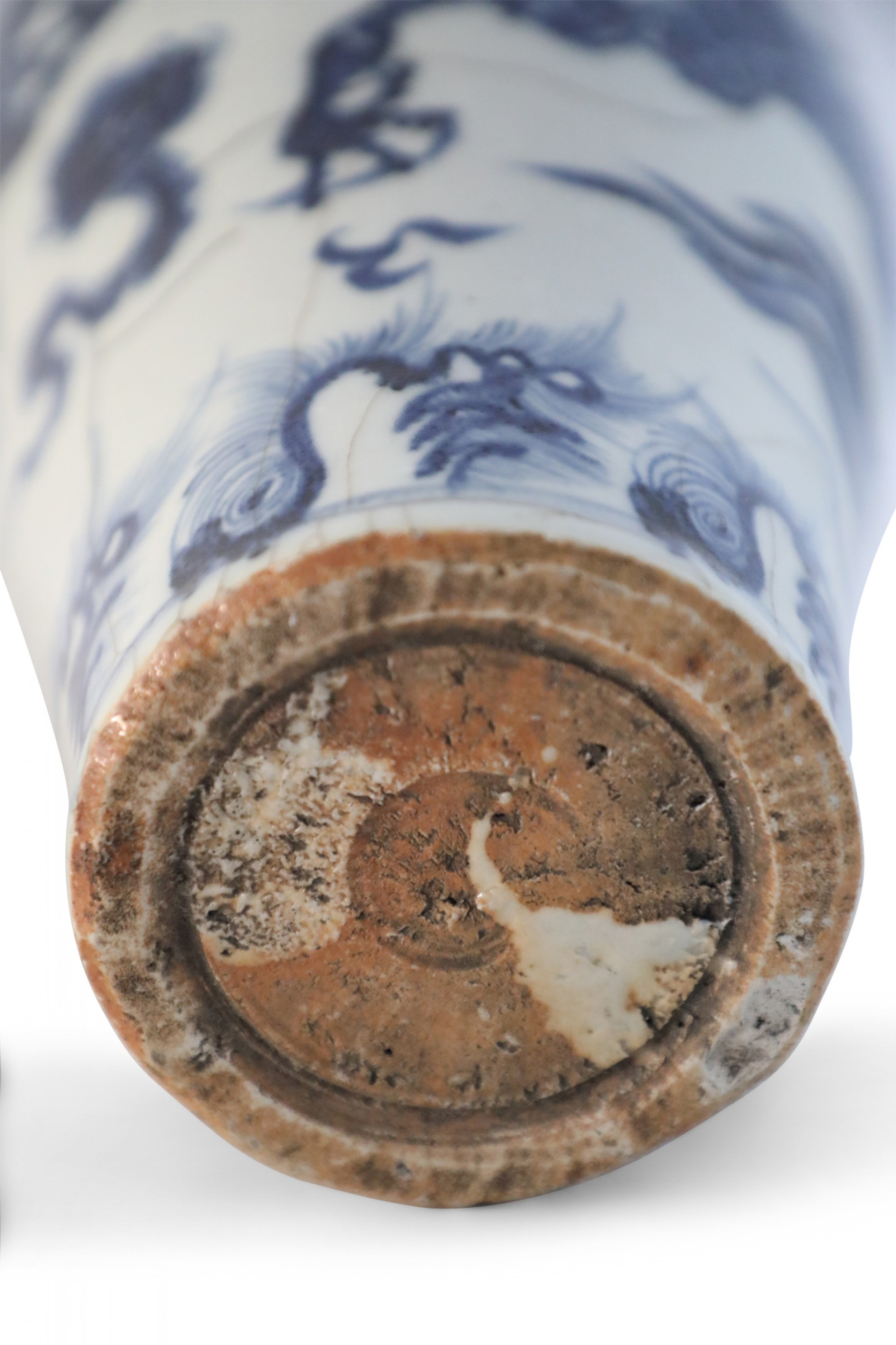 Antique Chinese (early 20th Century) white porcelain Meiping vase decorated in a dynamic blue dragon motif.