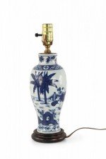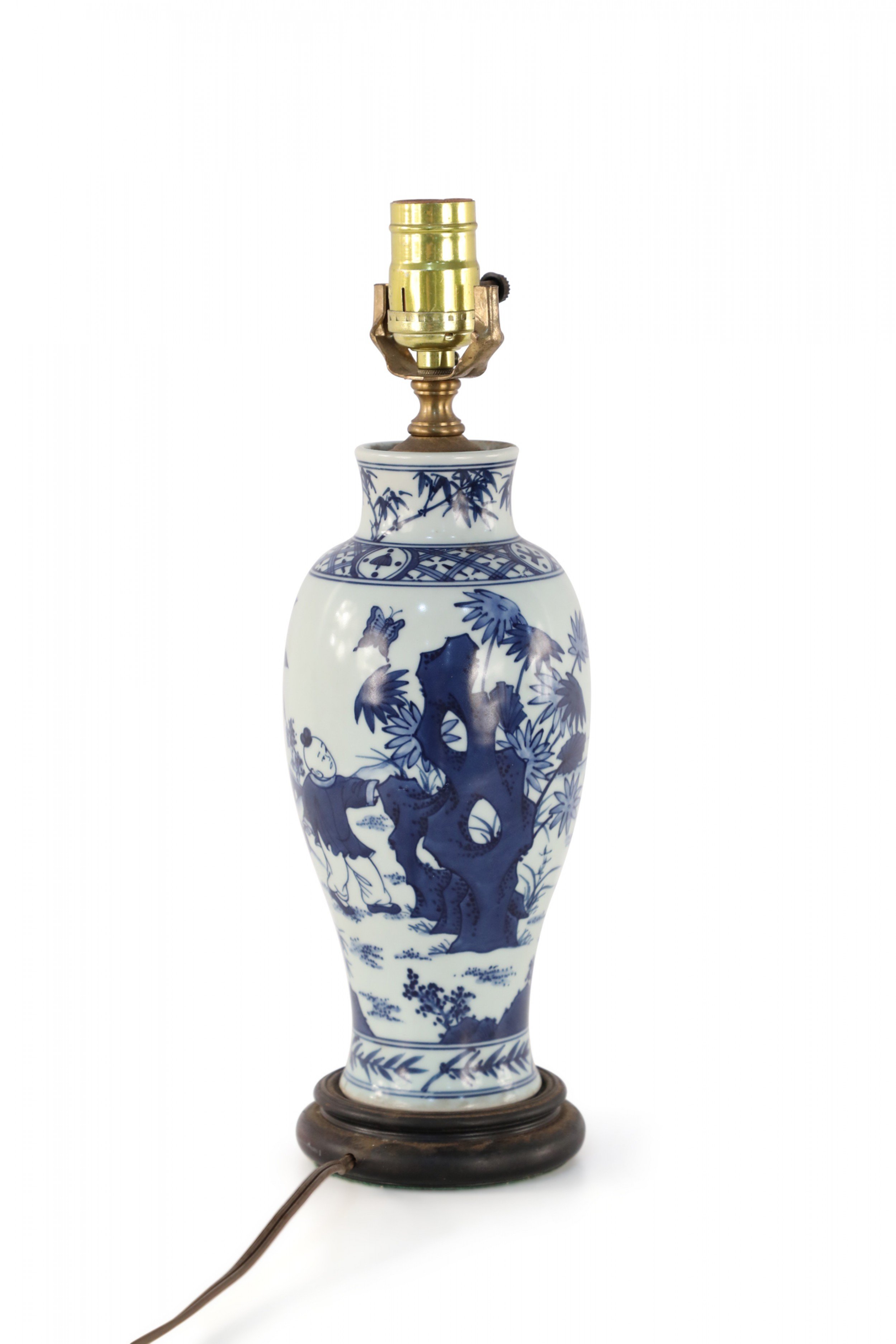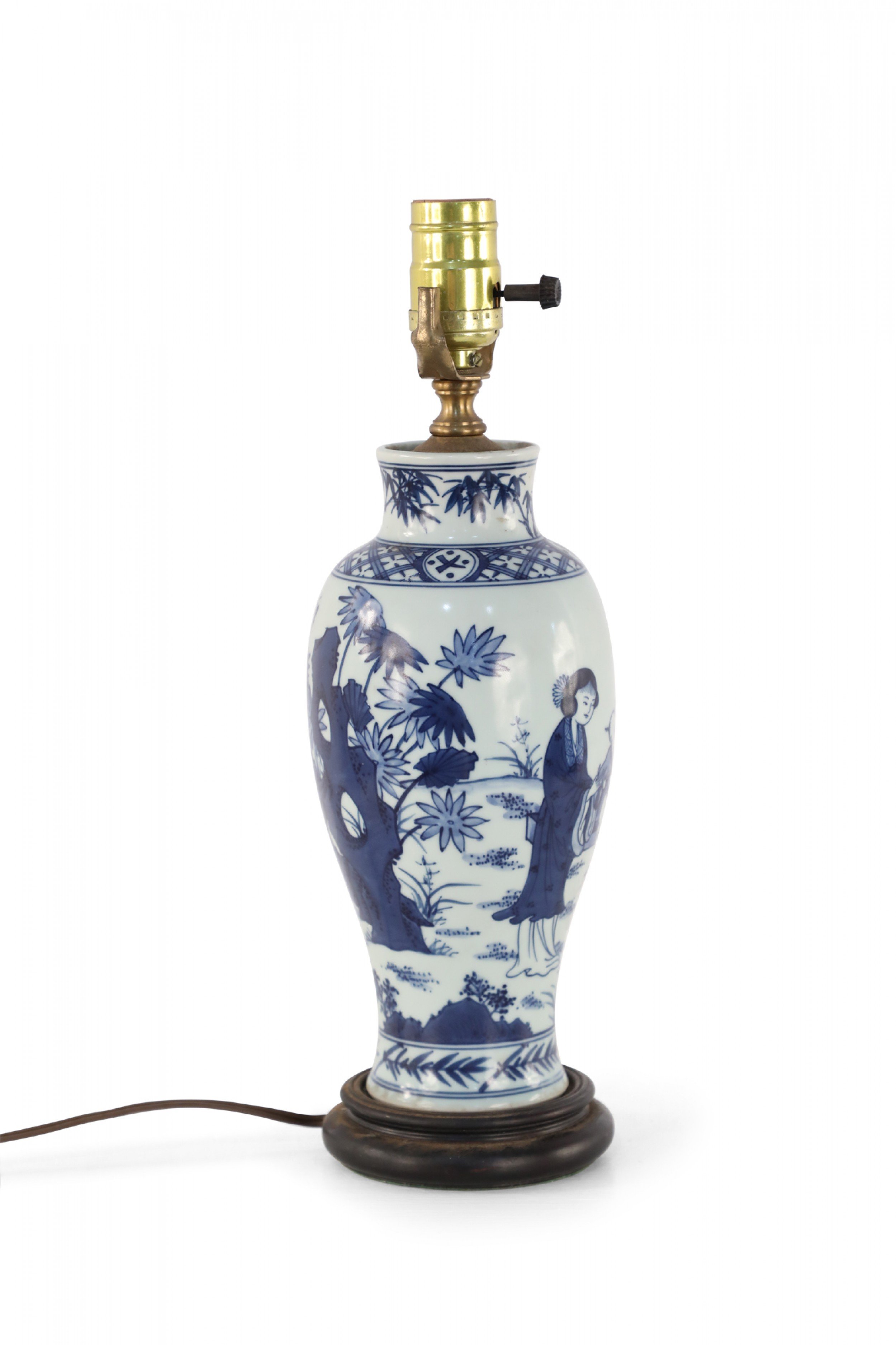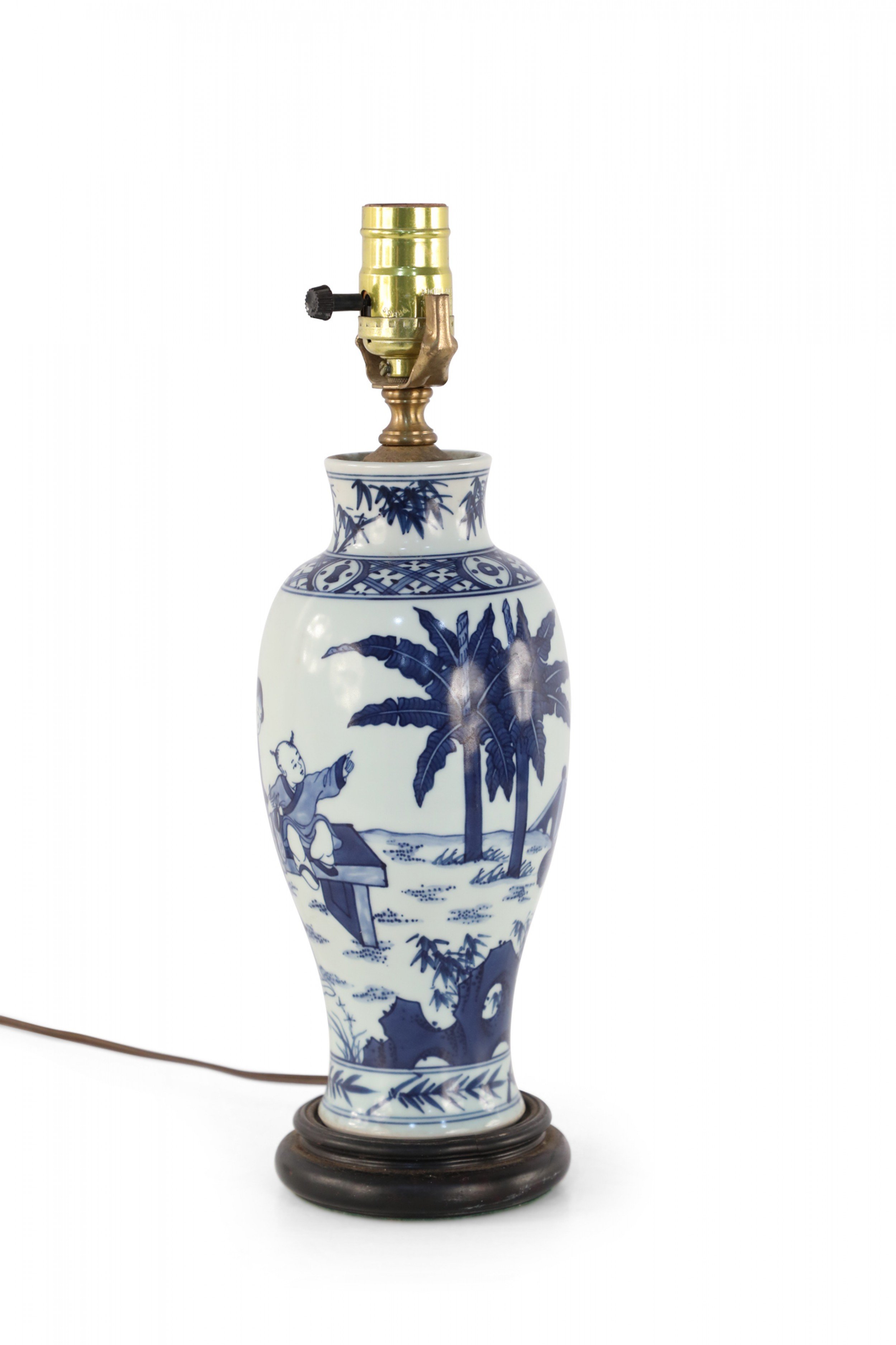 Antique Chinese (Early 20th Century) table lamp made from a white and blue baluster-shaped porcelain vase depicting a mother and children playing outside, mounted on a wooden base with brass hardware.