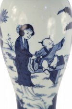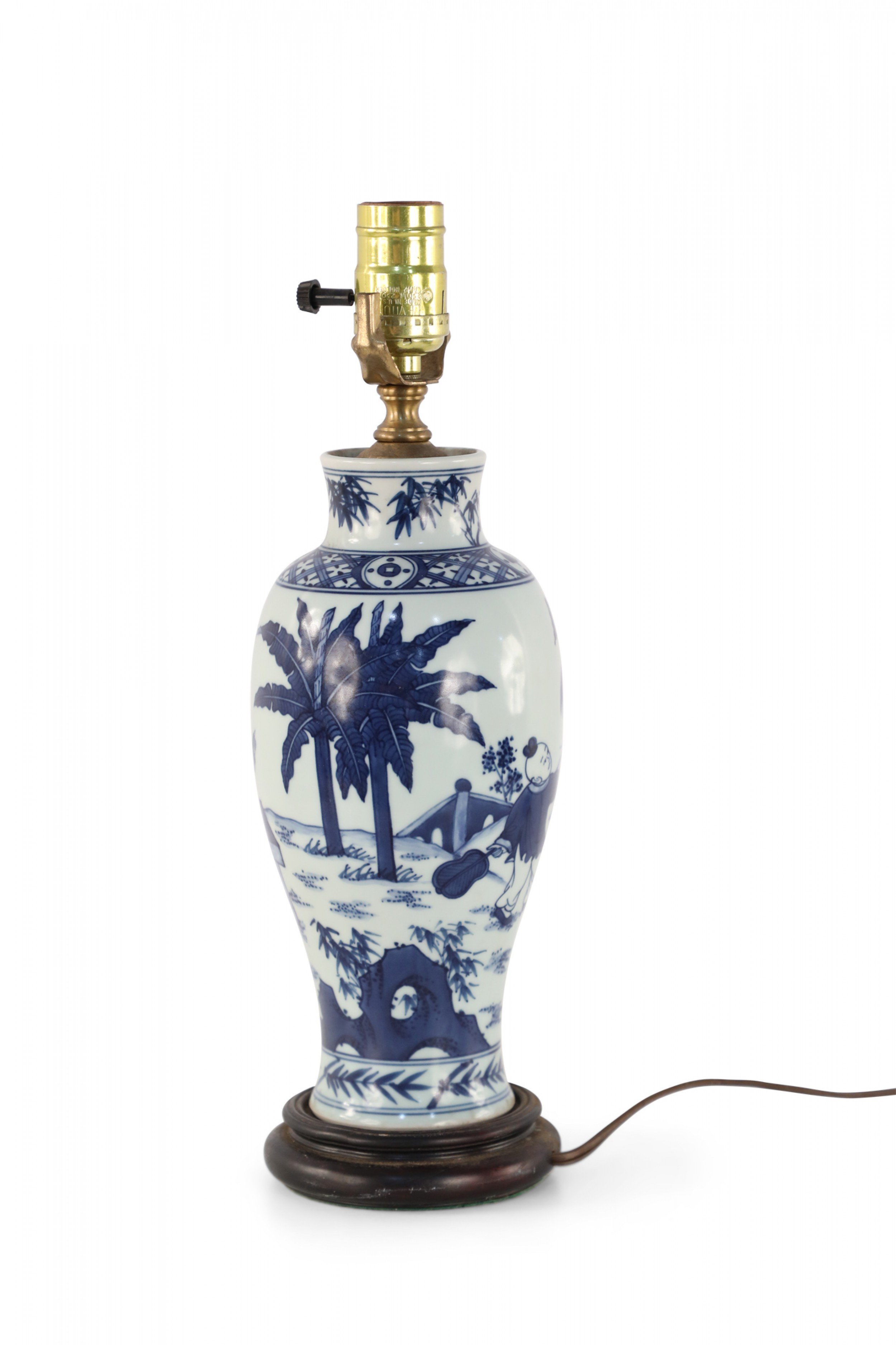 Antique Chinese (Early 20th Century) table lamp made from a white and blue baluster-shaped porcelain vase depicting a mother and children playing outside, mounted on a wooden base with brass hardware..