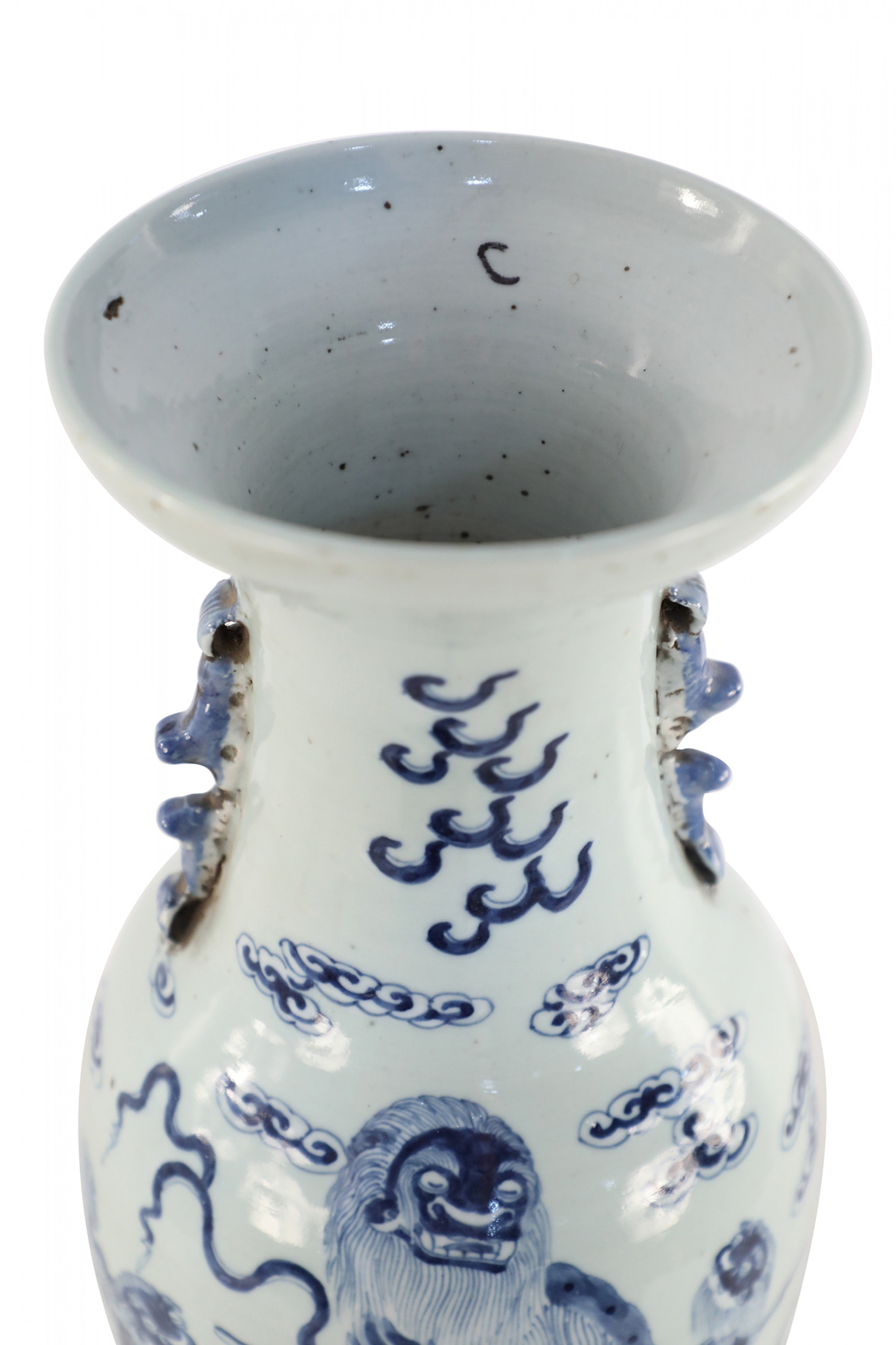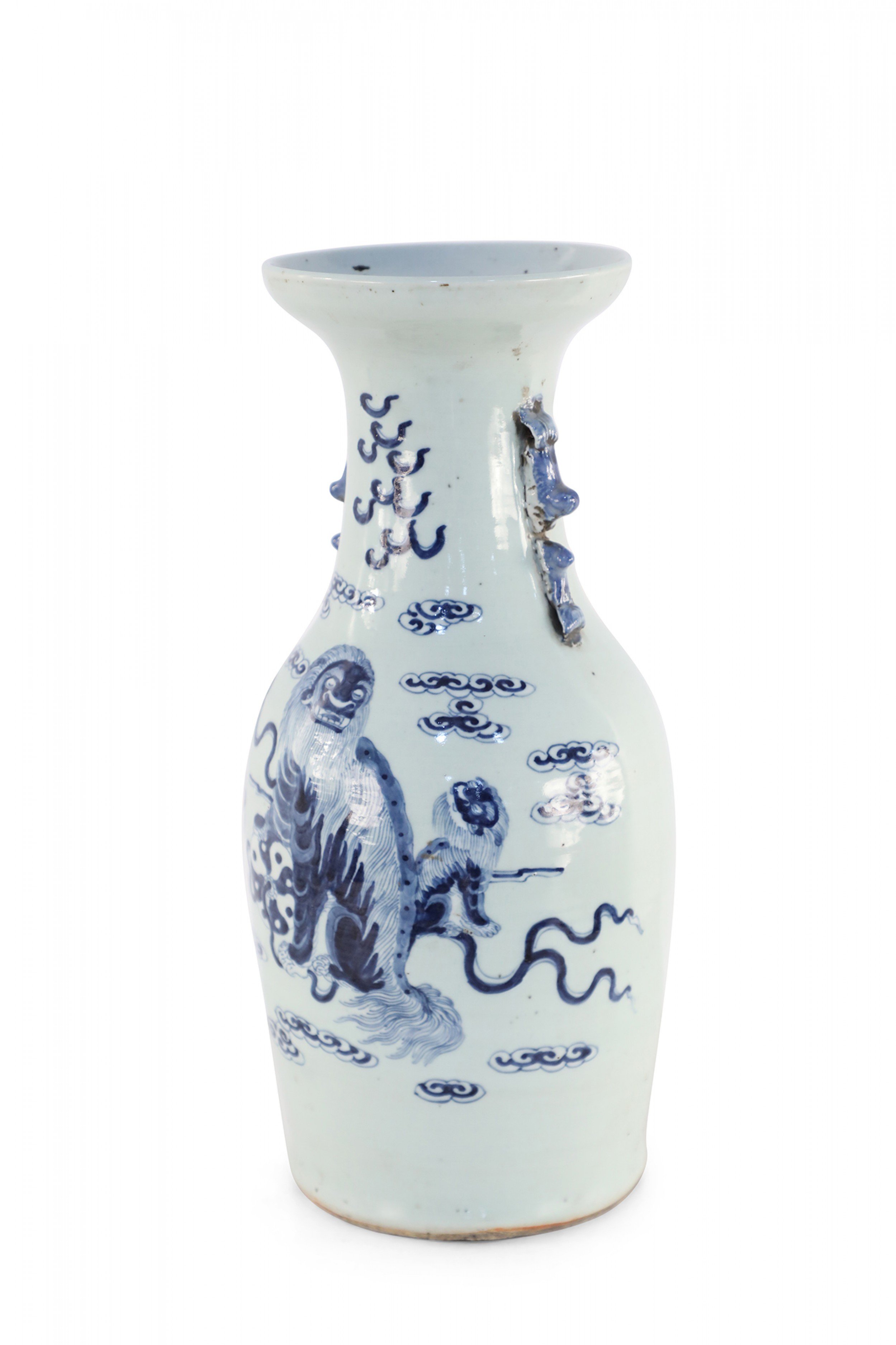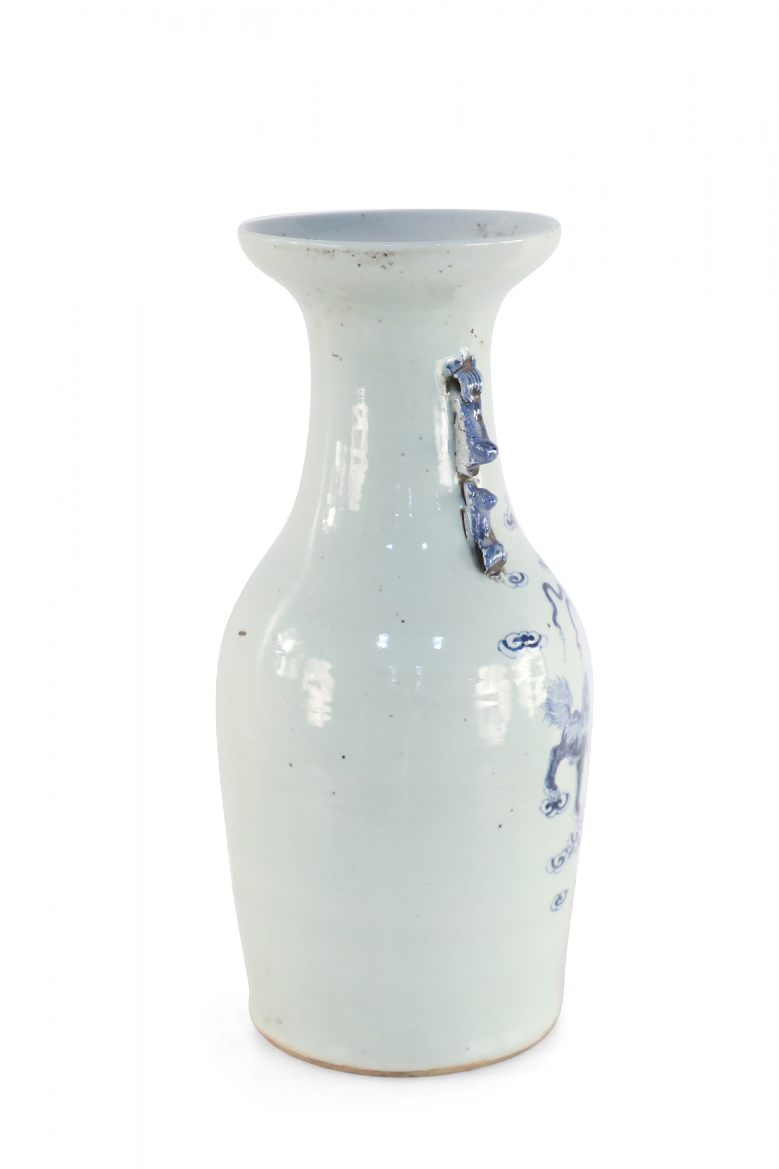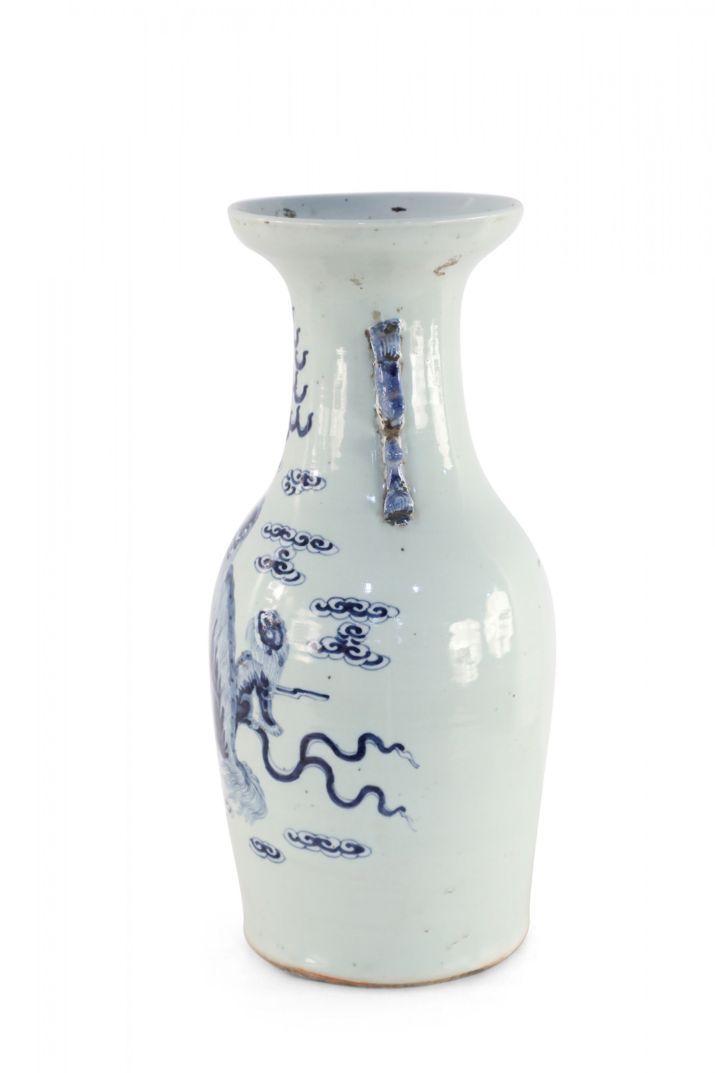 Antique Chinese (Late 19th Century) white porcelain urn decorated with blue foo dogs, clouds, and serpents, and accented in two pale blue scrolled handles along the neck.