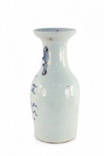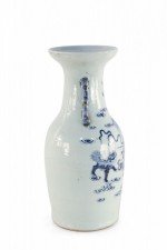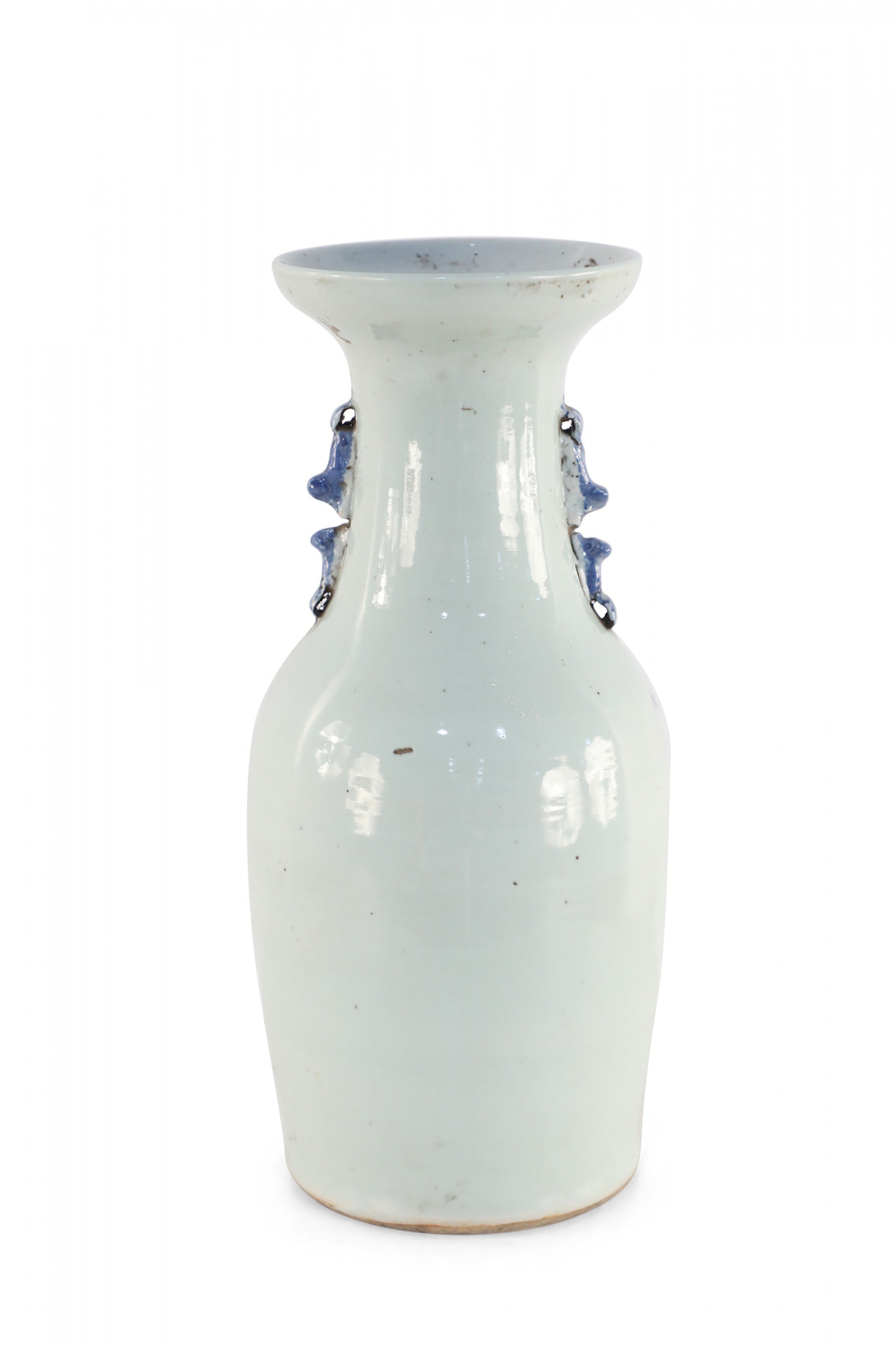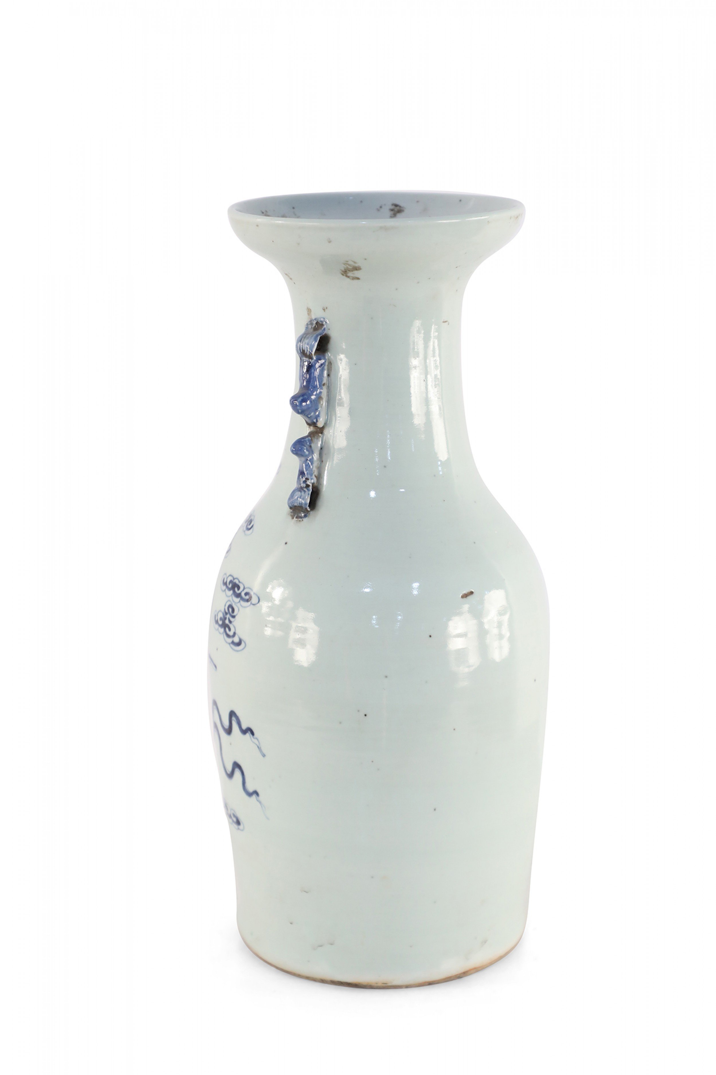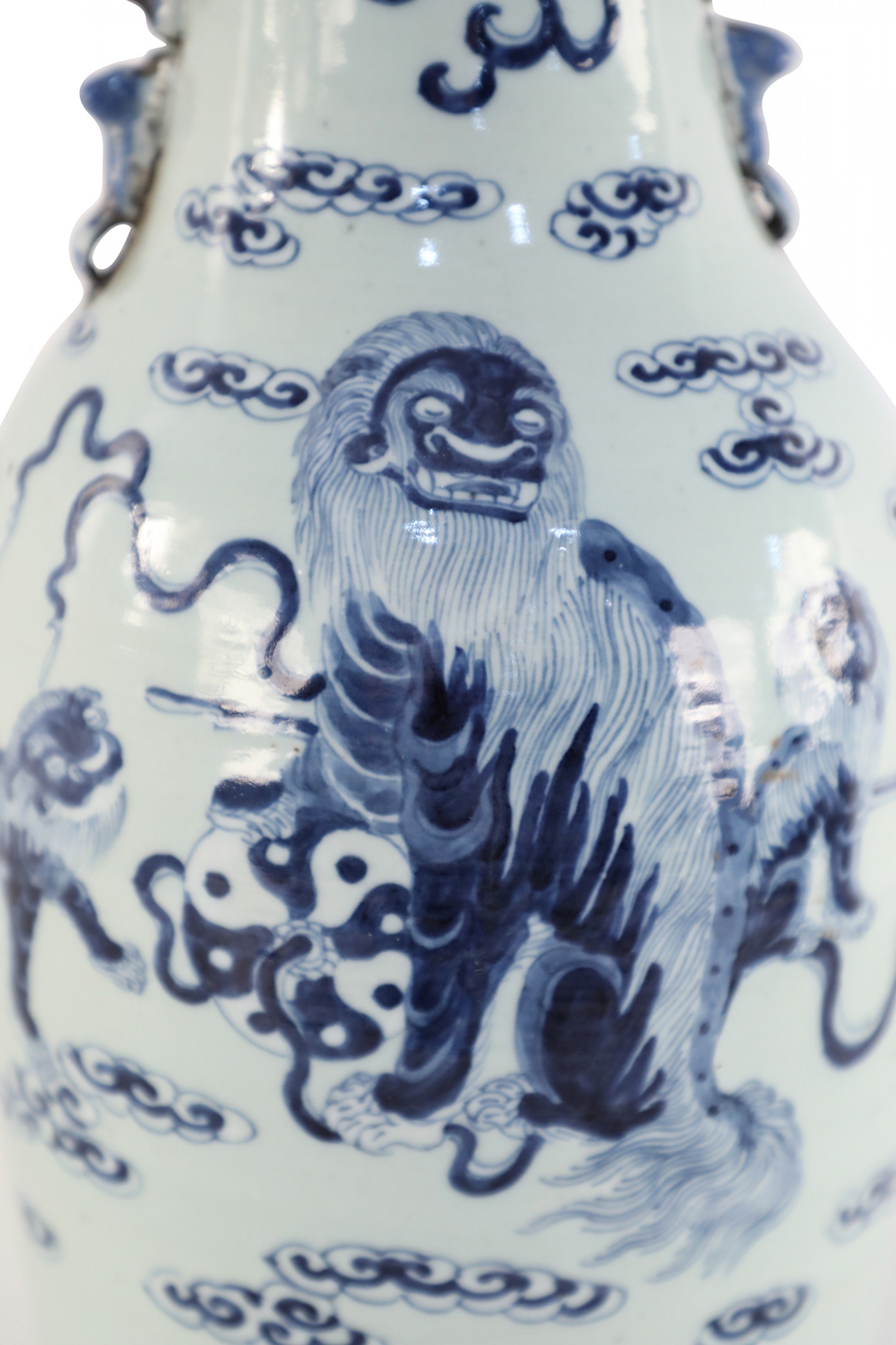 Antique Chinese (Late 19th Century) white porcelain urn decorated with blue foo dogs, clouds, and serpents, and accented in two pale blue scrolled handles along the neck.