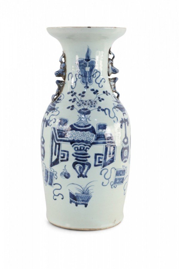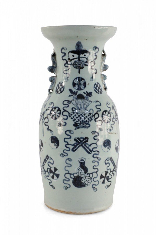 Antique Chinese (Late 19th Century) white and blue porcelain urn decorated with a lily pad and floral motif, and accented in two navy scrolled handles along the neck..