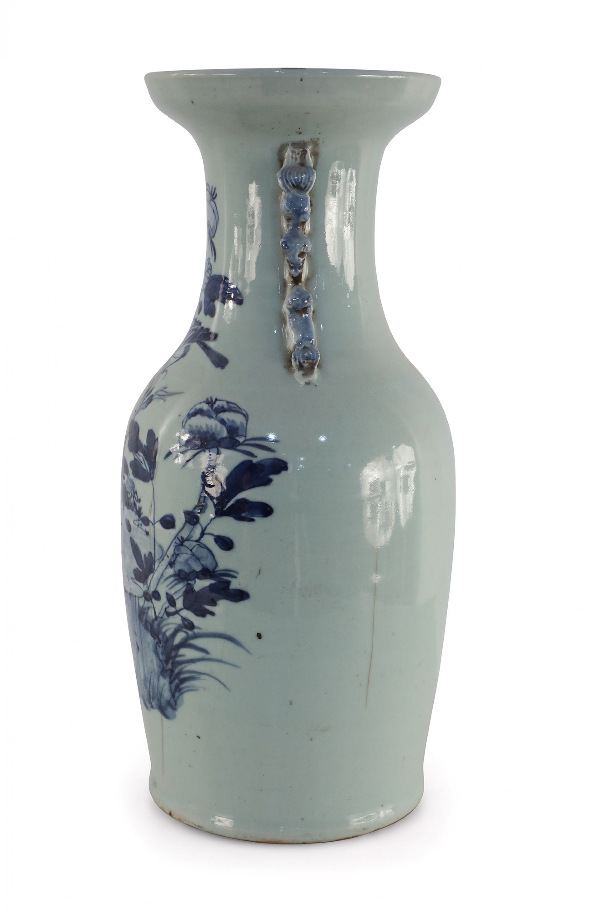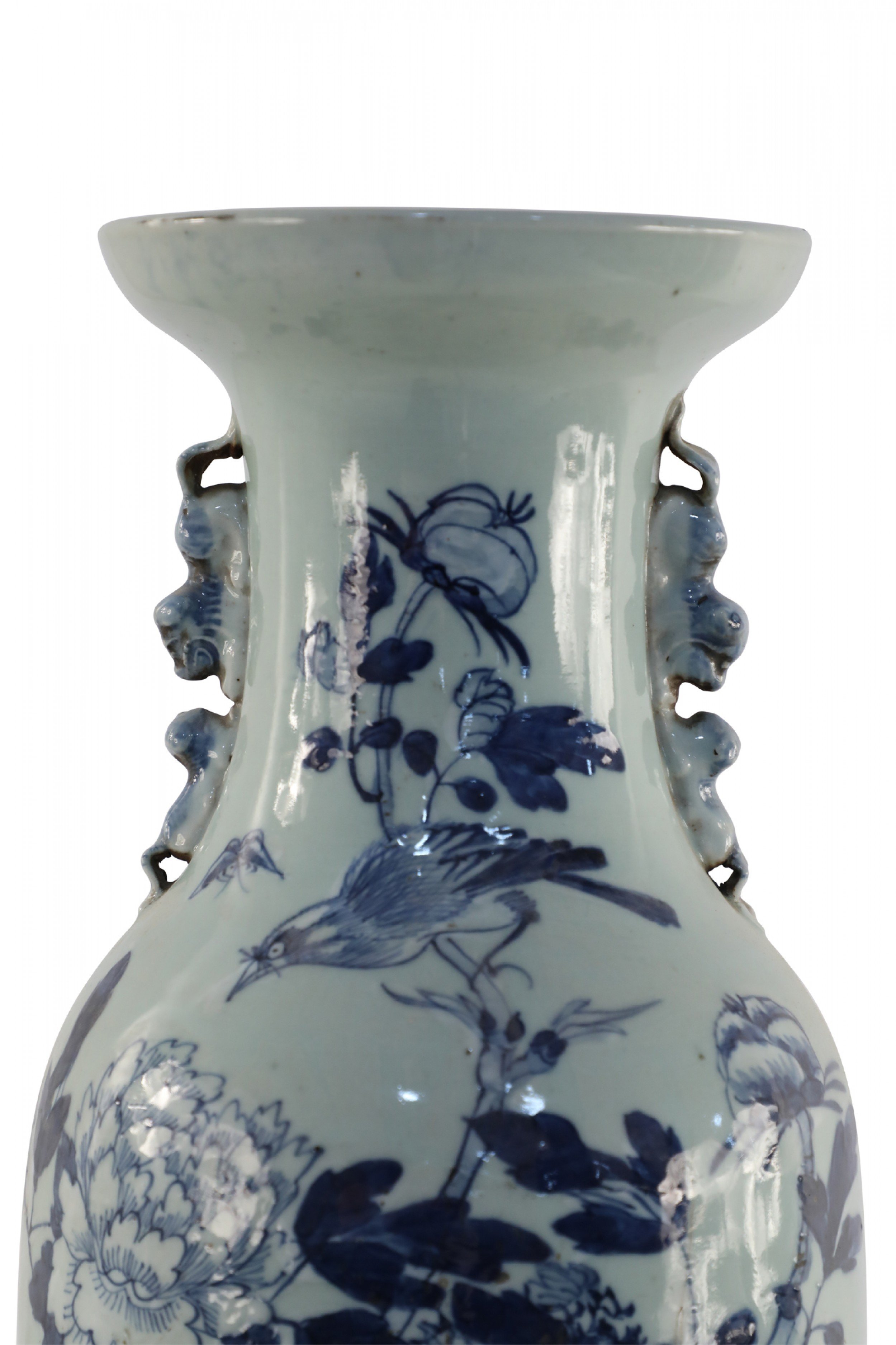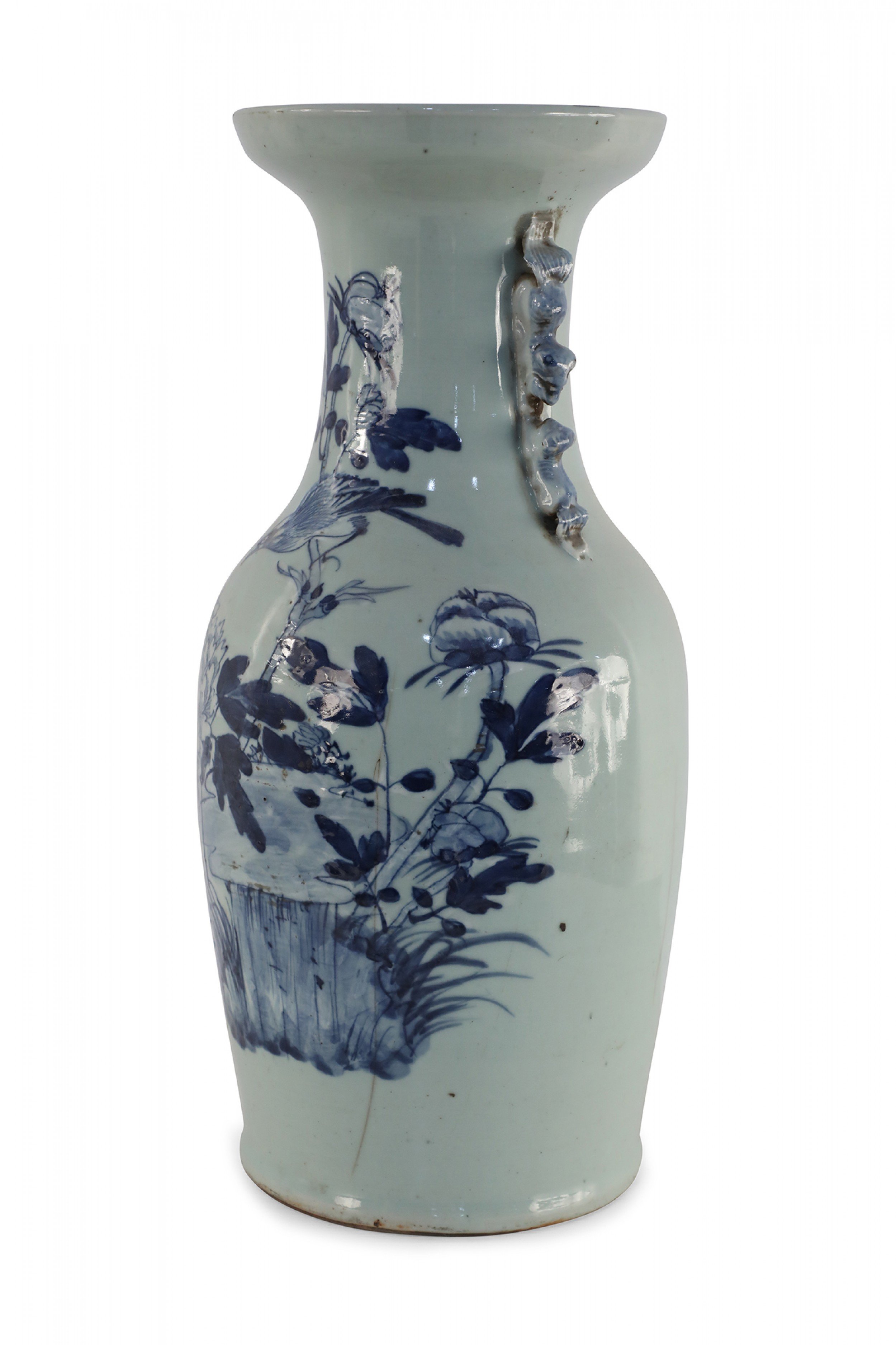 Antique Chinese (Late 19th Century) white, porcelain urn decorated in a blue scene of a bird perched on a flowering branch above water, and accented with two light blue scrolled handles along the neck.