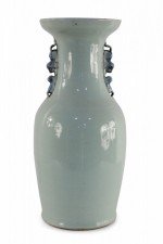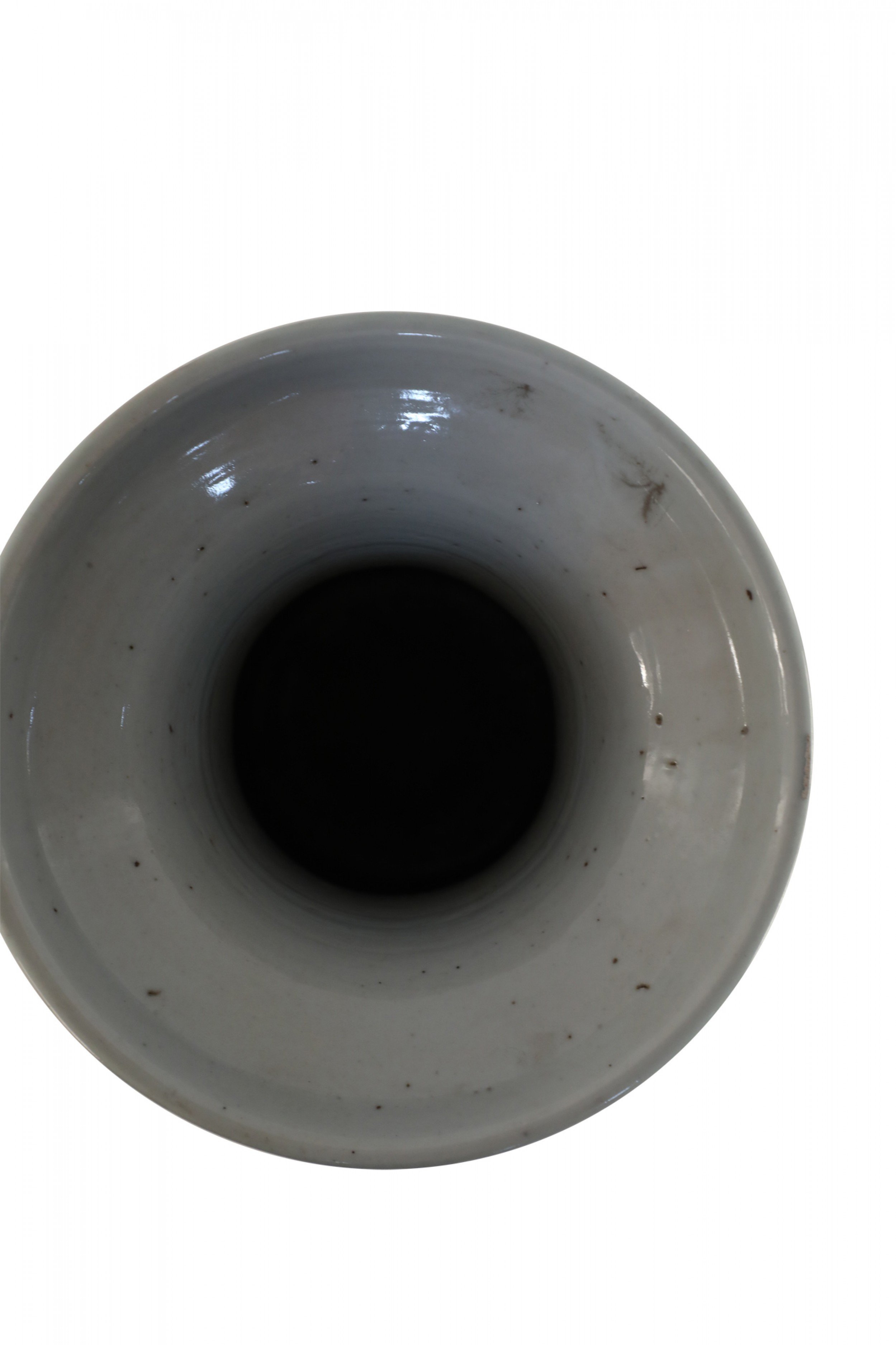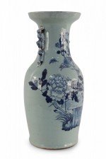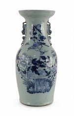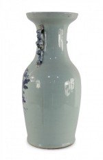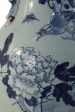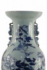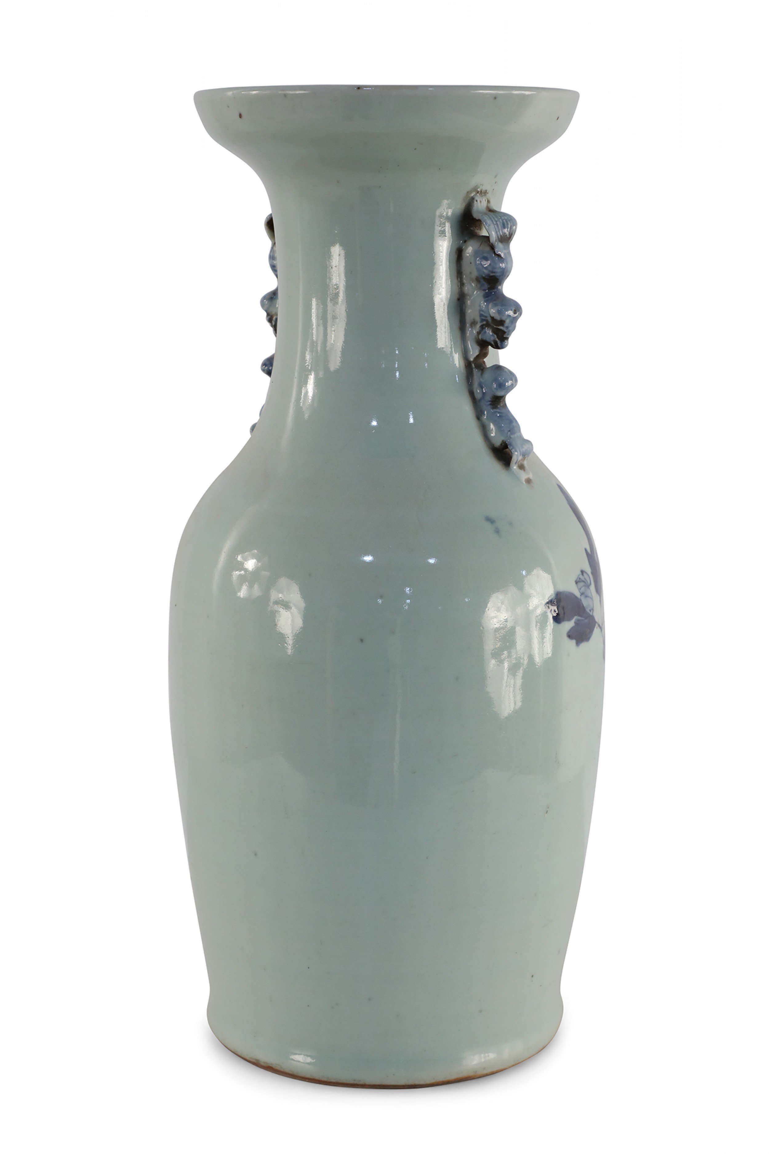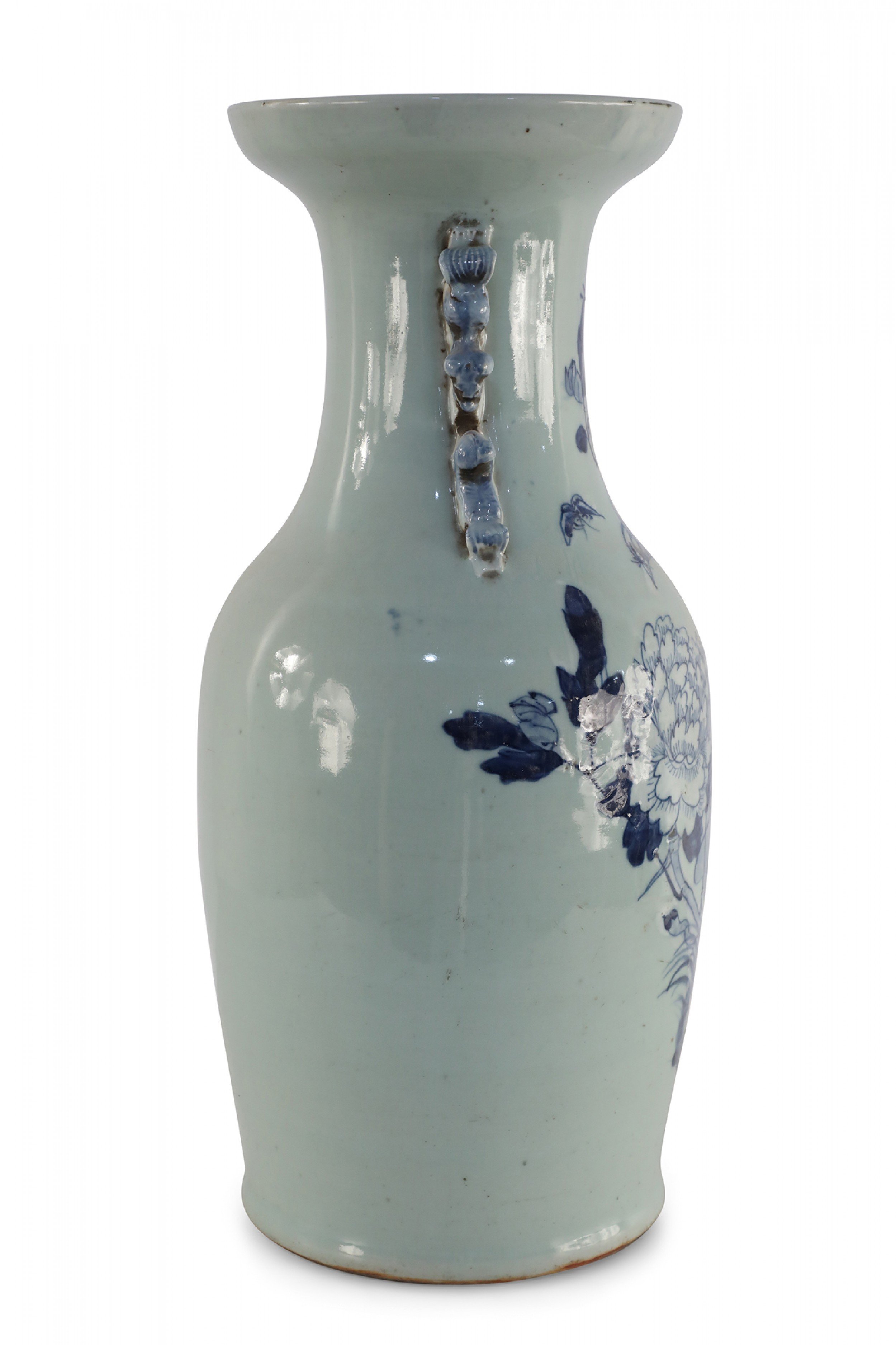 Antique Chinese (Late 19th Century) white, porcelain urn decorated in a blue scene of a bird perched on a flowering branch above water, and accented with two light blue scrolled handles along the neck.