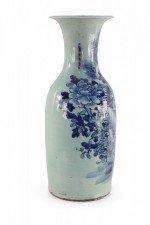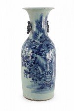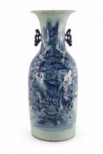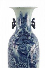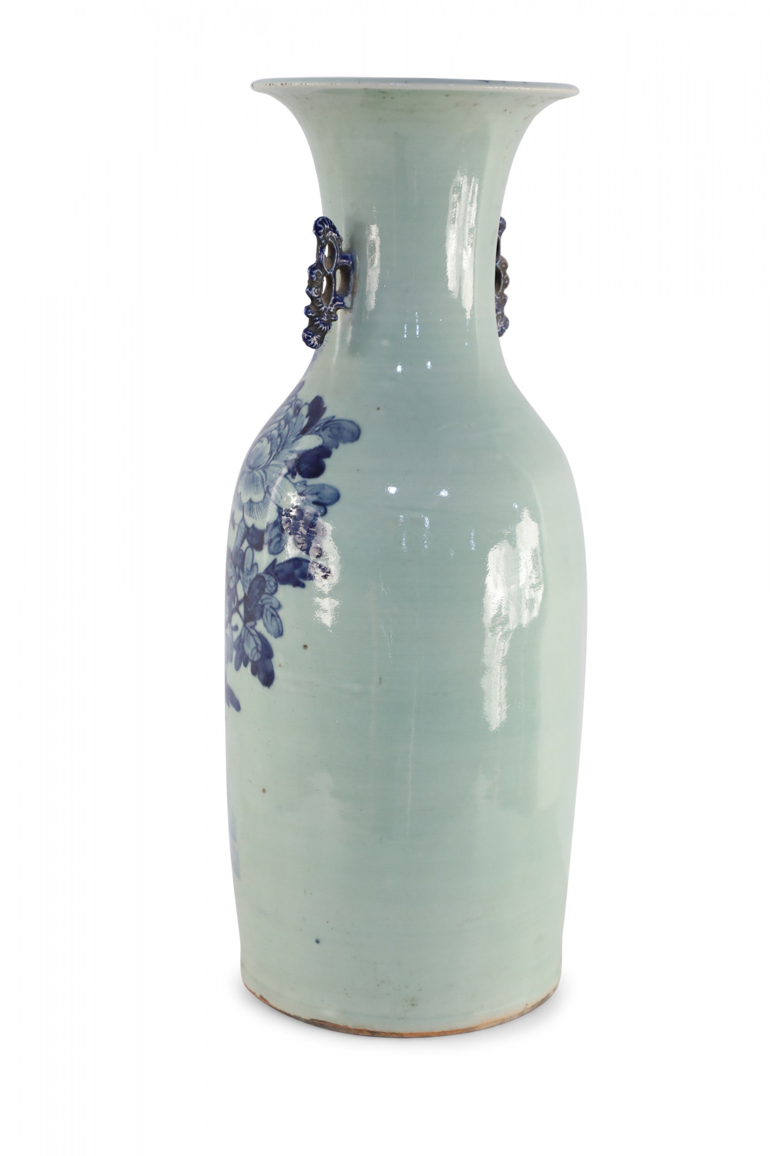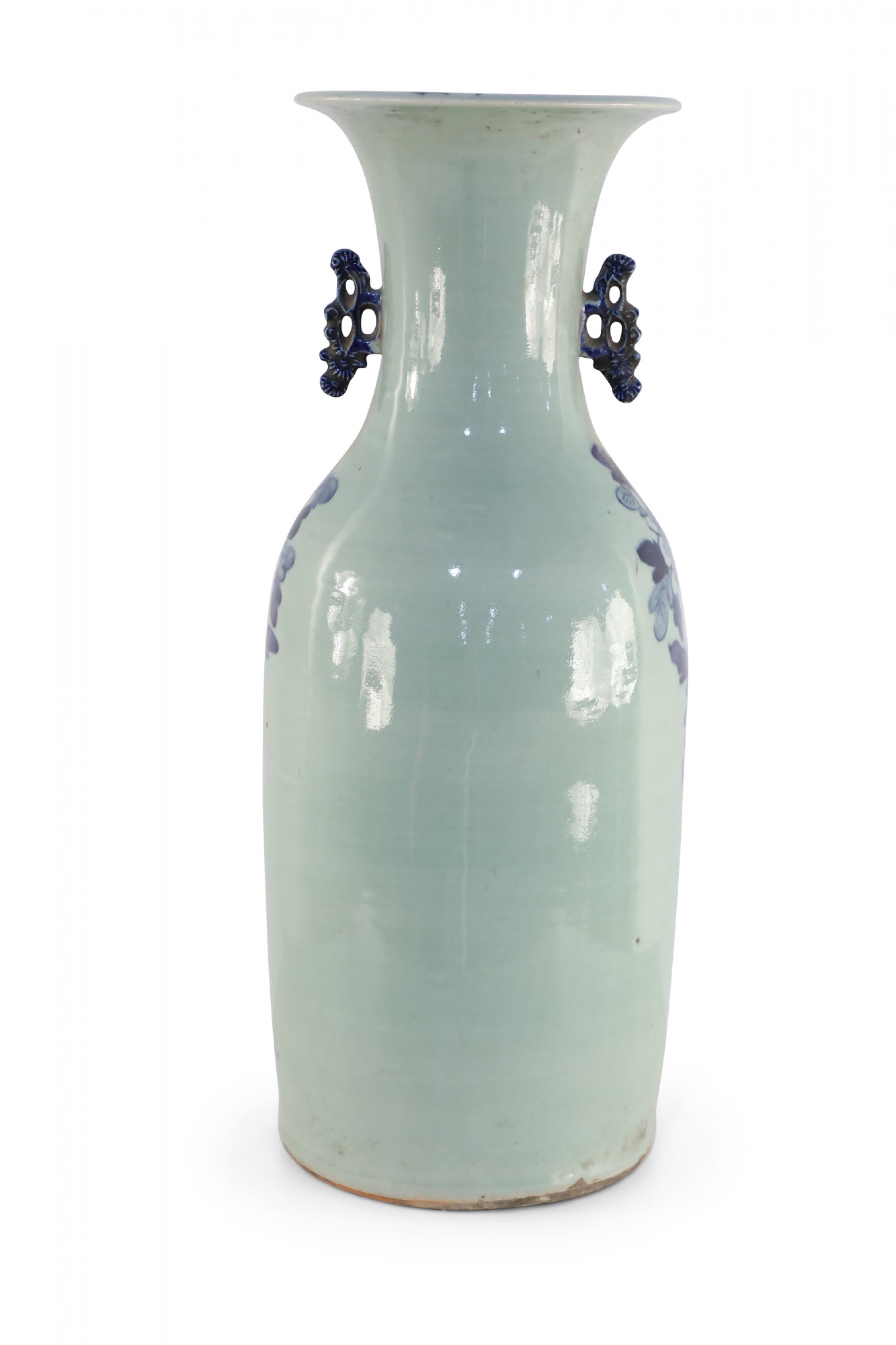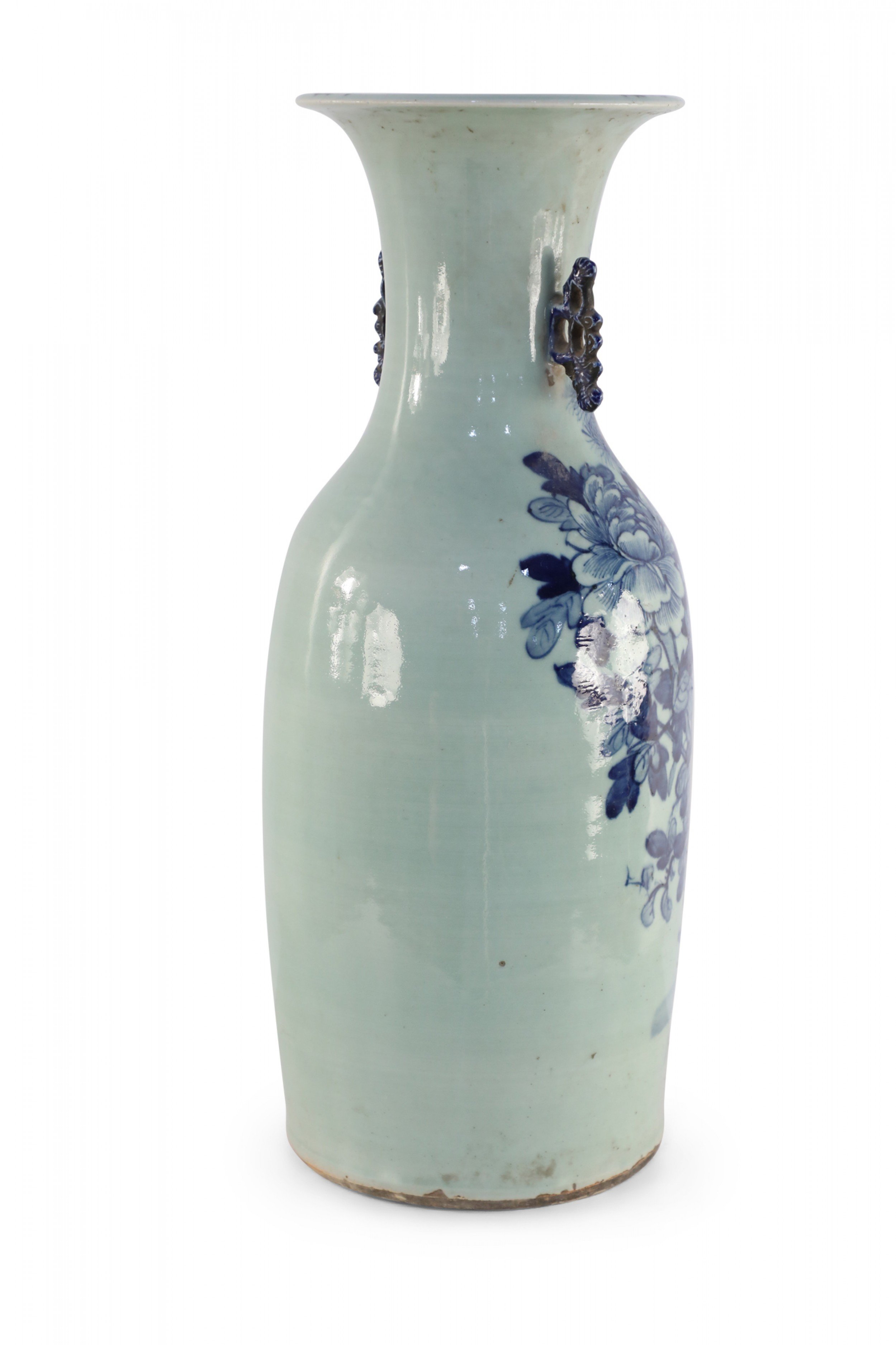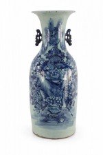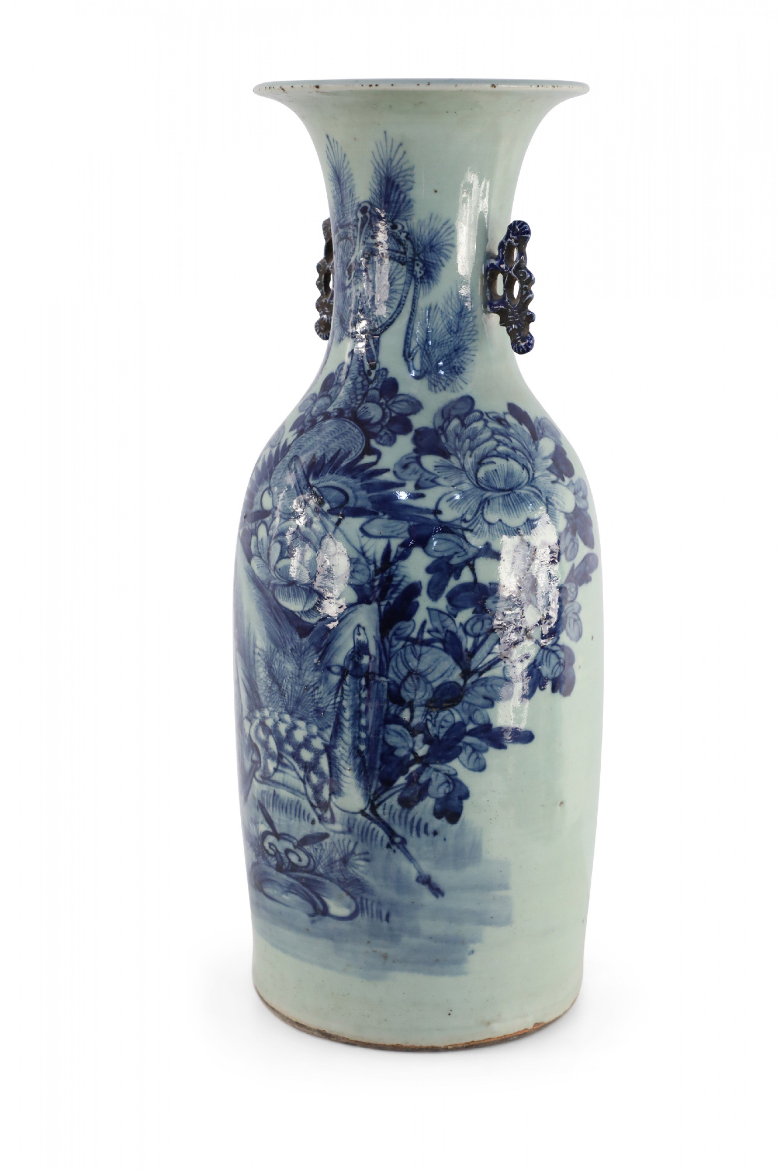 Antique Chinese (Late 19th Century) large white, porcelain urn with a scene of blue flora and fauna, and two dark blue scrolled handles along the neck.