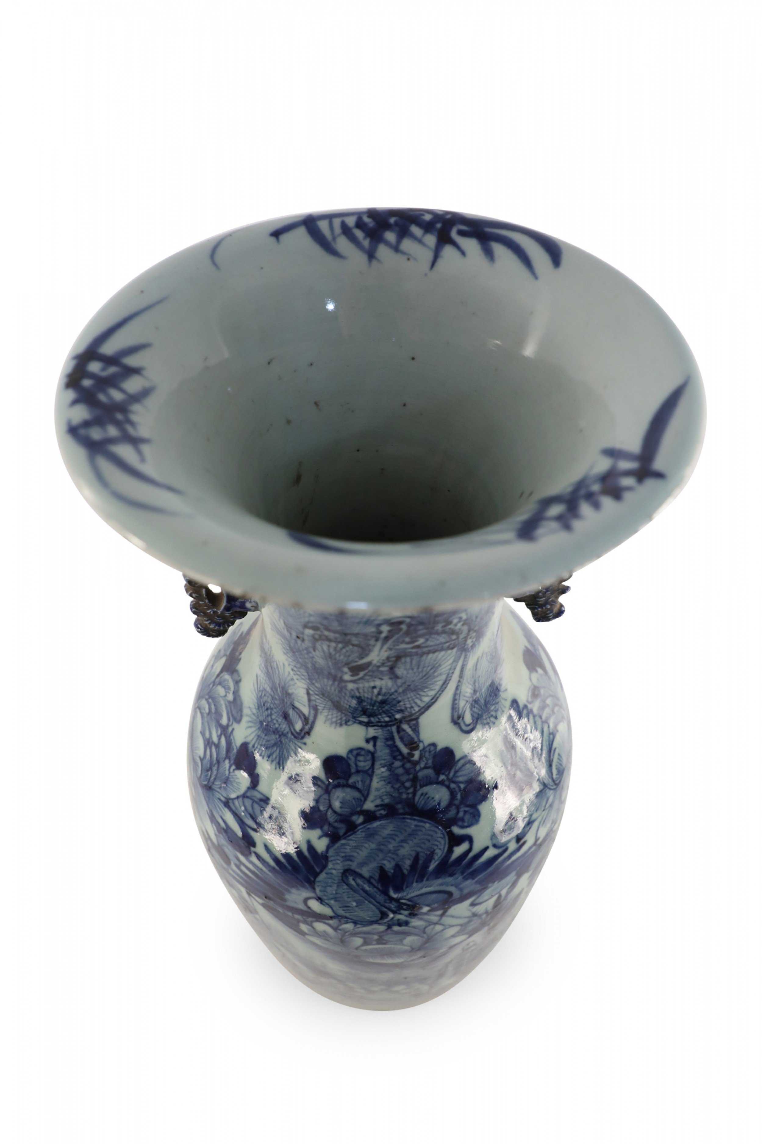 Antique Chinese (Late 19th Century) large white, porcelain urn with a scene of blue flora and fauna, and two dark blue scrolled handles along the neck..