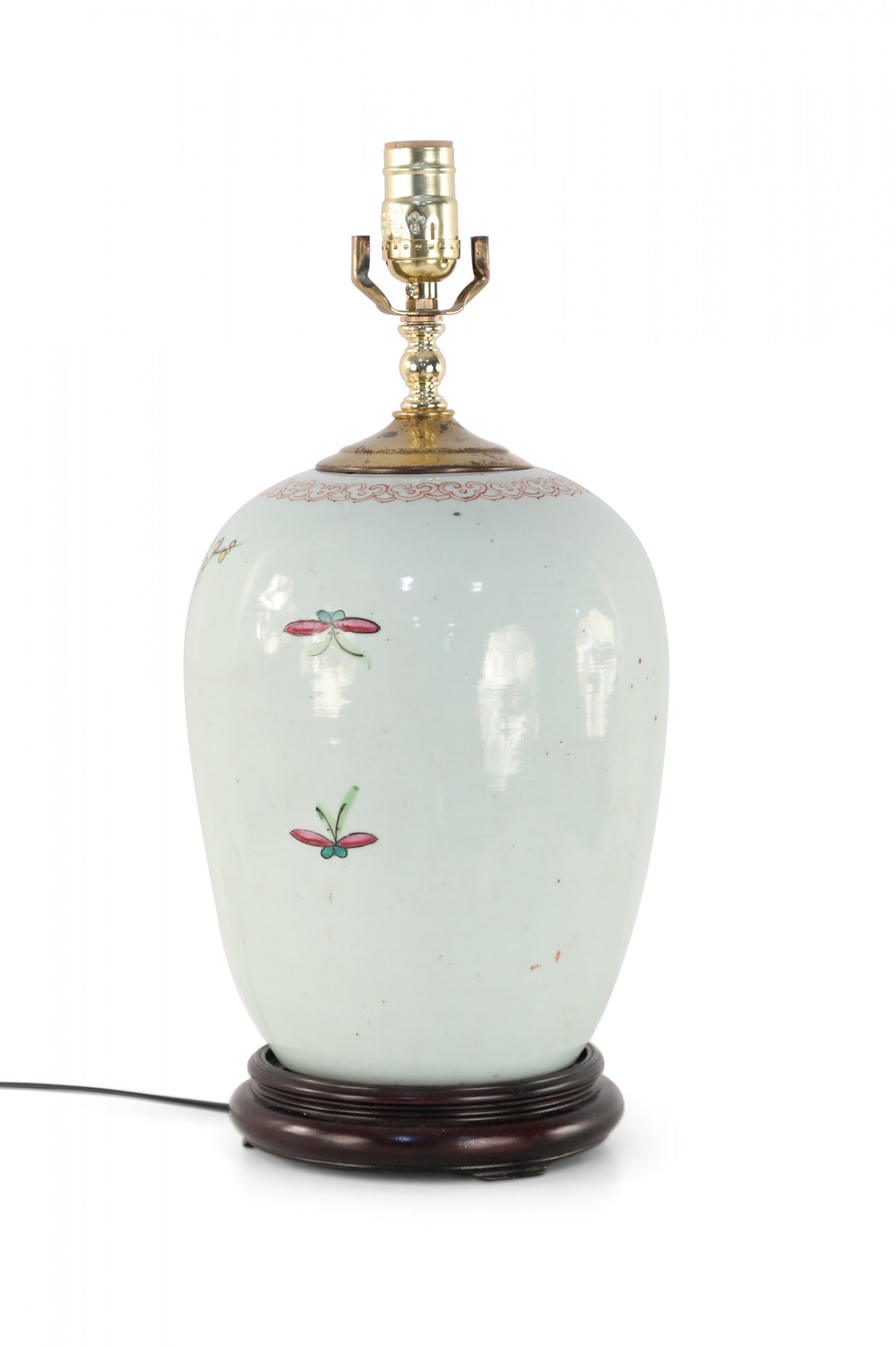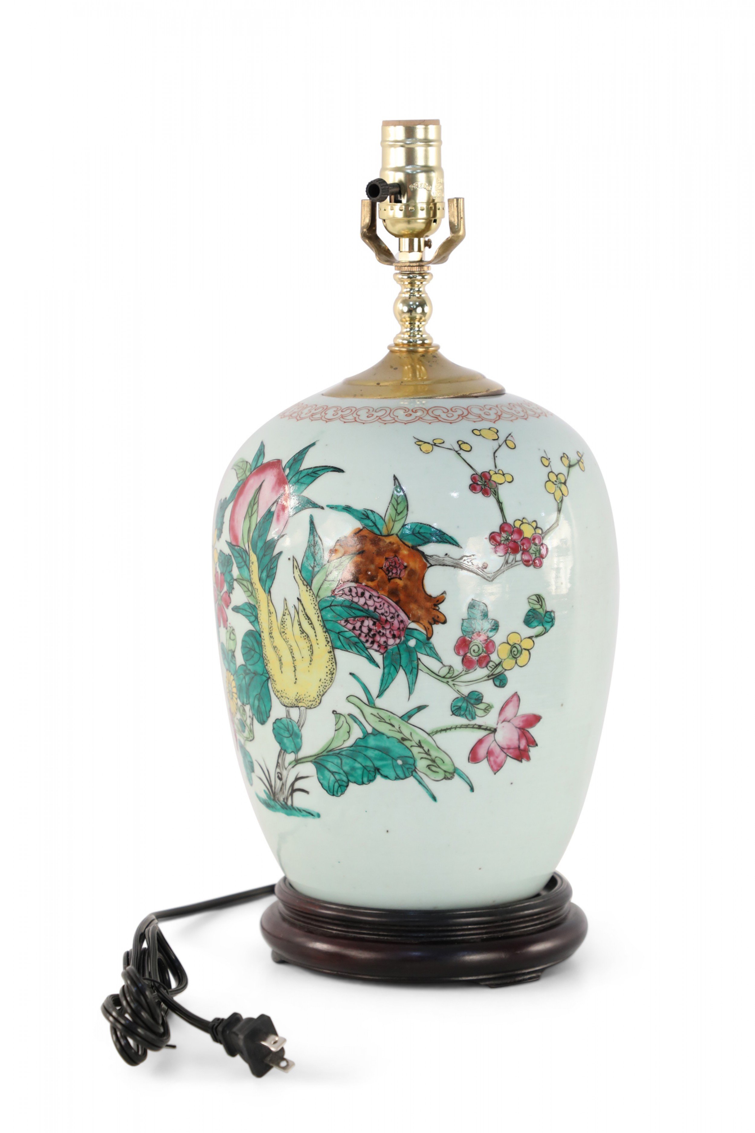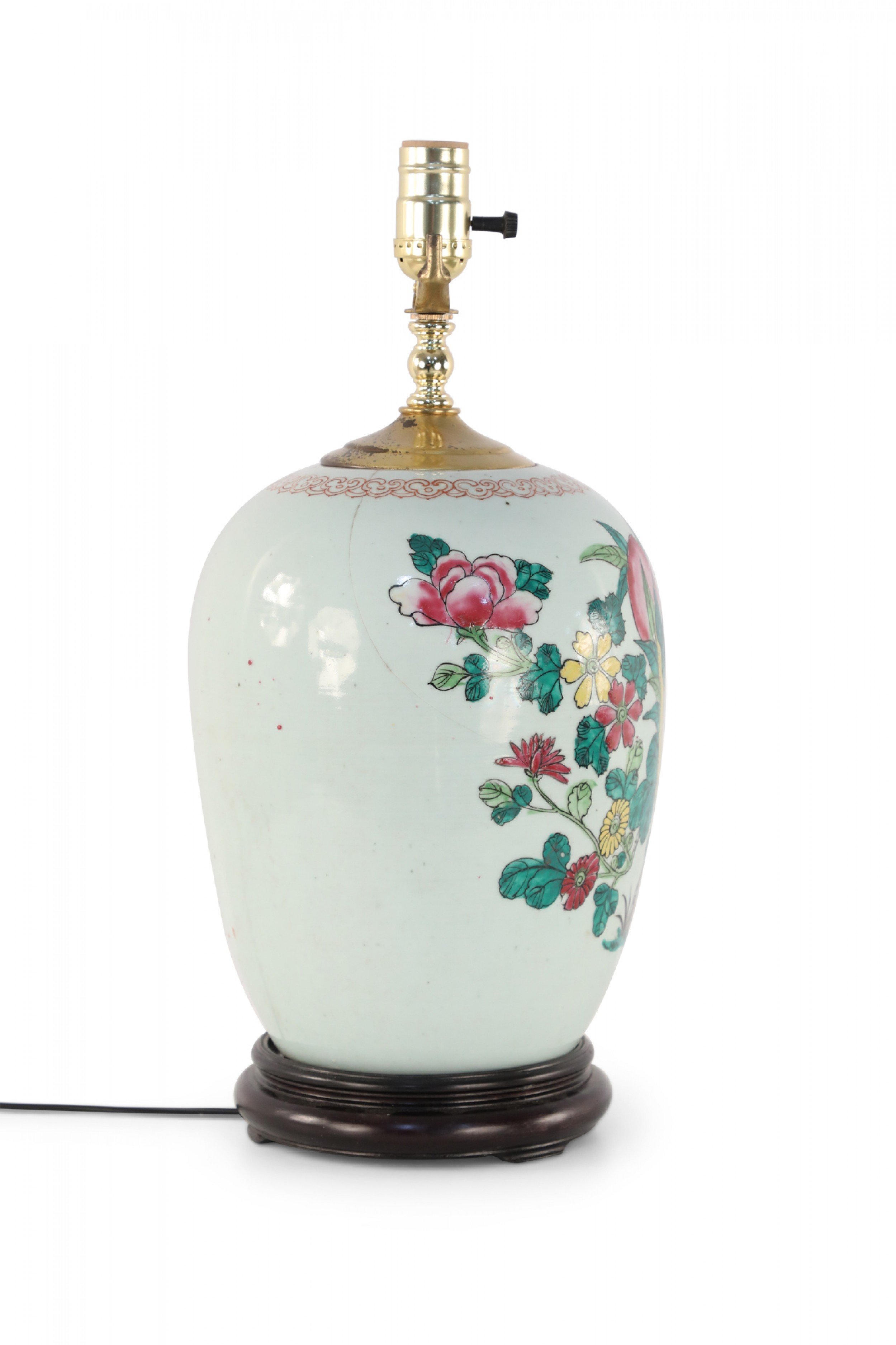 Chinese white ceramic table lamp made from a bulbous vase decorated with colorful florals, mounted on a wooden base and fitted with brass hardware.